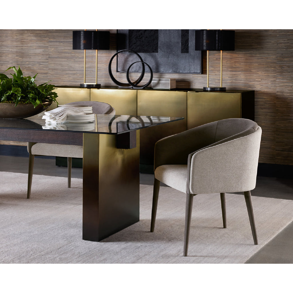 With an alluring barrel back seatback, this stunning dining chair will add a touch of comfort to any space. Features an upholstered exterior and seat in ernst sandstone fabric and completed with coordinating meg ash fabric on the interior seat and legs.