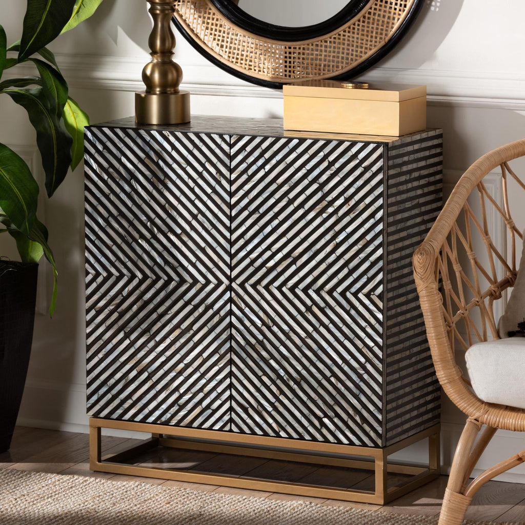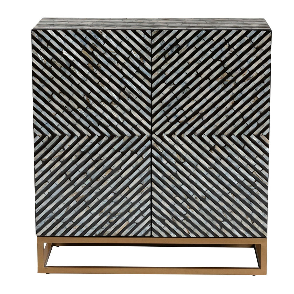 Bestow an aura of artistic refinement to your space while accommodating your needs with the remarkable Belenus storage cabinet. This bohemian piece consists of a sturdy wood frame gorgeously embellished with natural mother of pearl. The doors open to reveal two spacious shelves for convenient storage and organization of busy rooms. The Belenus will arrive fully assembled and features openwork metal legs for excellent stability and support in sleek design. The rectangular tabletop serves as a fantastic exhibit for decorations, making the Belenus storage cabinet a wonderful fixture of any setting.