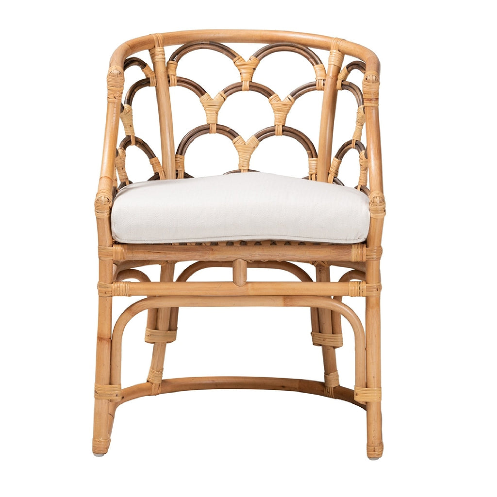 Enjoy a blissful atmosphere to relax and unwind with the remarkable Aster armchair. This boho piece consists of natural rattan frame fitted with a plush seat cushion. Its rounded backrest curves around featuring a stunning geometric design from every angle. The Aster will arrive fully assembled and utilizes a curved rattan base for excellent stability and support. Offering superb relaxation with a distinct personality, the Aster armchair is sure to transform any space. Due to the nature of the natural materials used in this product, it may have variations in areas such as, but not limited to, color, pattern, grain and texture. The hair-like strands of rattan/rattan-fiber are common due to nature of the material.
