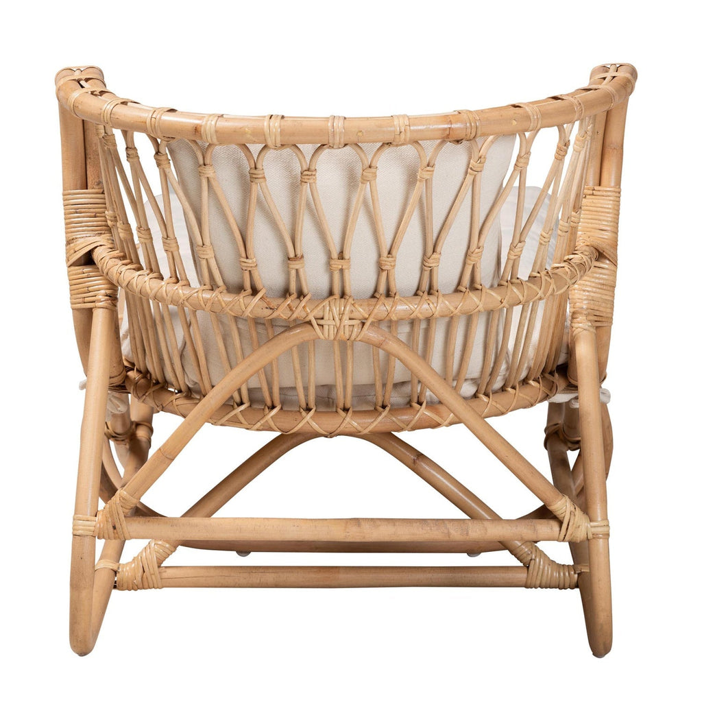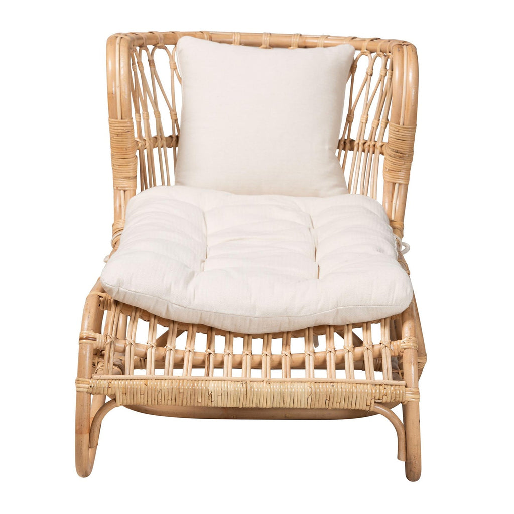 Destress and unwind in your personal piece of paradise with the inviting Delara chaise. This bohemian piece is handcrafted from natural rattan and fitted with a sumptuous fabric cushion. Its beautifully curved outline is interlaid with an airy openwork design that exudes an aura of carefree relaxation. The Delara will arrive fully assembled and utilizes rounded legs for excellent stability and support in alluring design. Delivering exotic serenity, the Delara chaise is sure to become a beloved fixture of any arrangement. Rattan a product of nature and may have variations in areas such as, but not limited to, color, pattern, grain and texture. The hair-like strands of rattan/rattan-fiber are common due to the nature of the material.