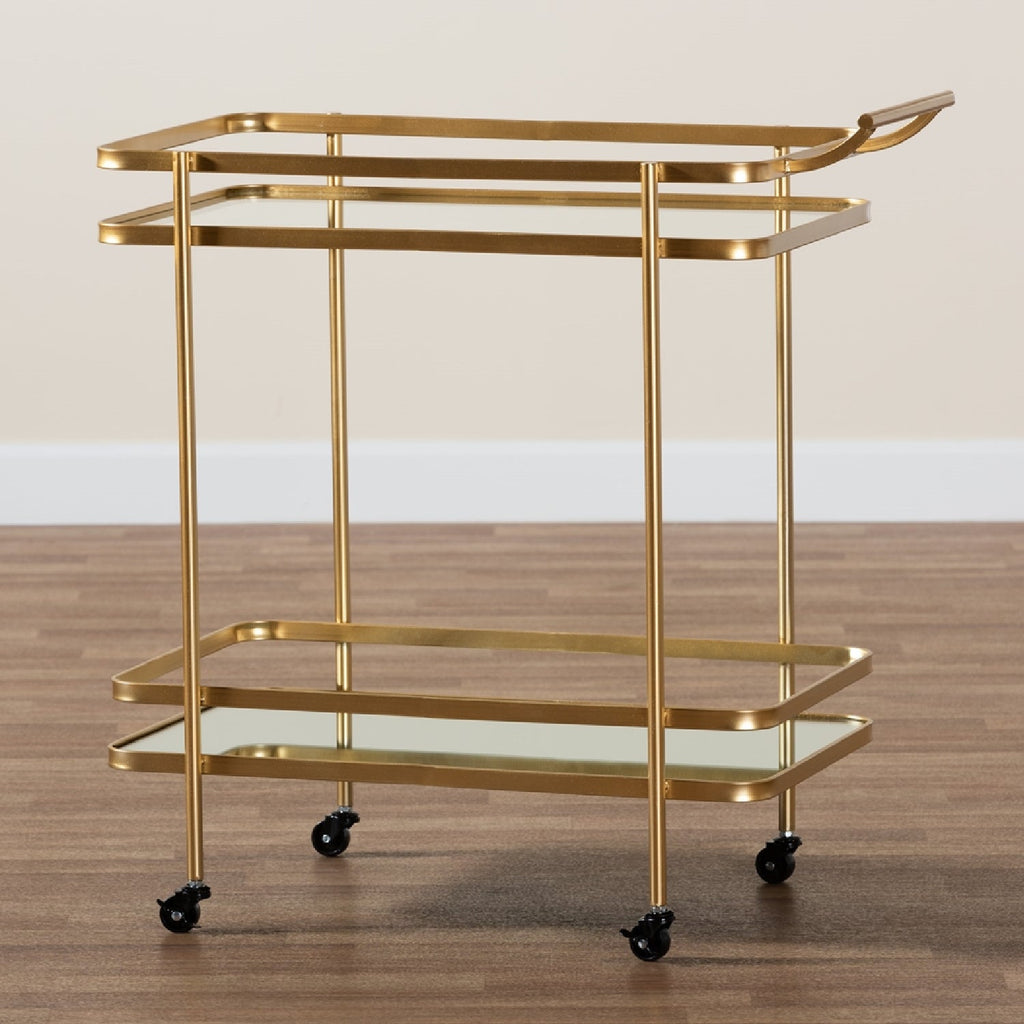 An exquisite design makes the Destin wine cart a perfect attendant to serve or display your wine collection. The Destin is comprised of a stunning brushed gold finished metal frame fitted with two tiers of clear glass and mirrored glass shelves. The borders of each shelf are protected with guard rails to secure items. Fully assembled, the Destin rests on four caster wheels for versatile movement. A handy and visually striking serving station, the Destin wine cart is an excellent accessory for any enthusiast.