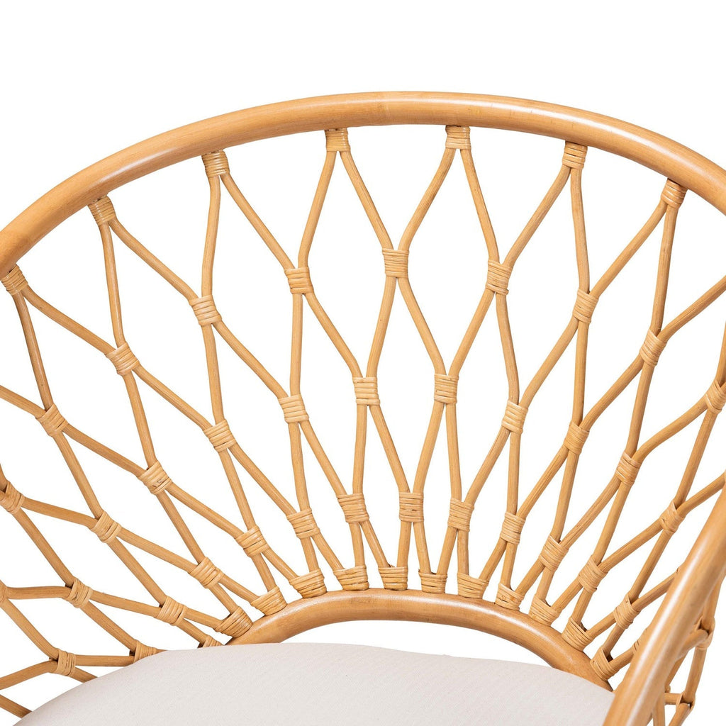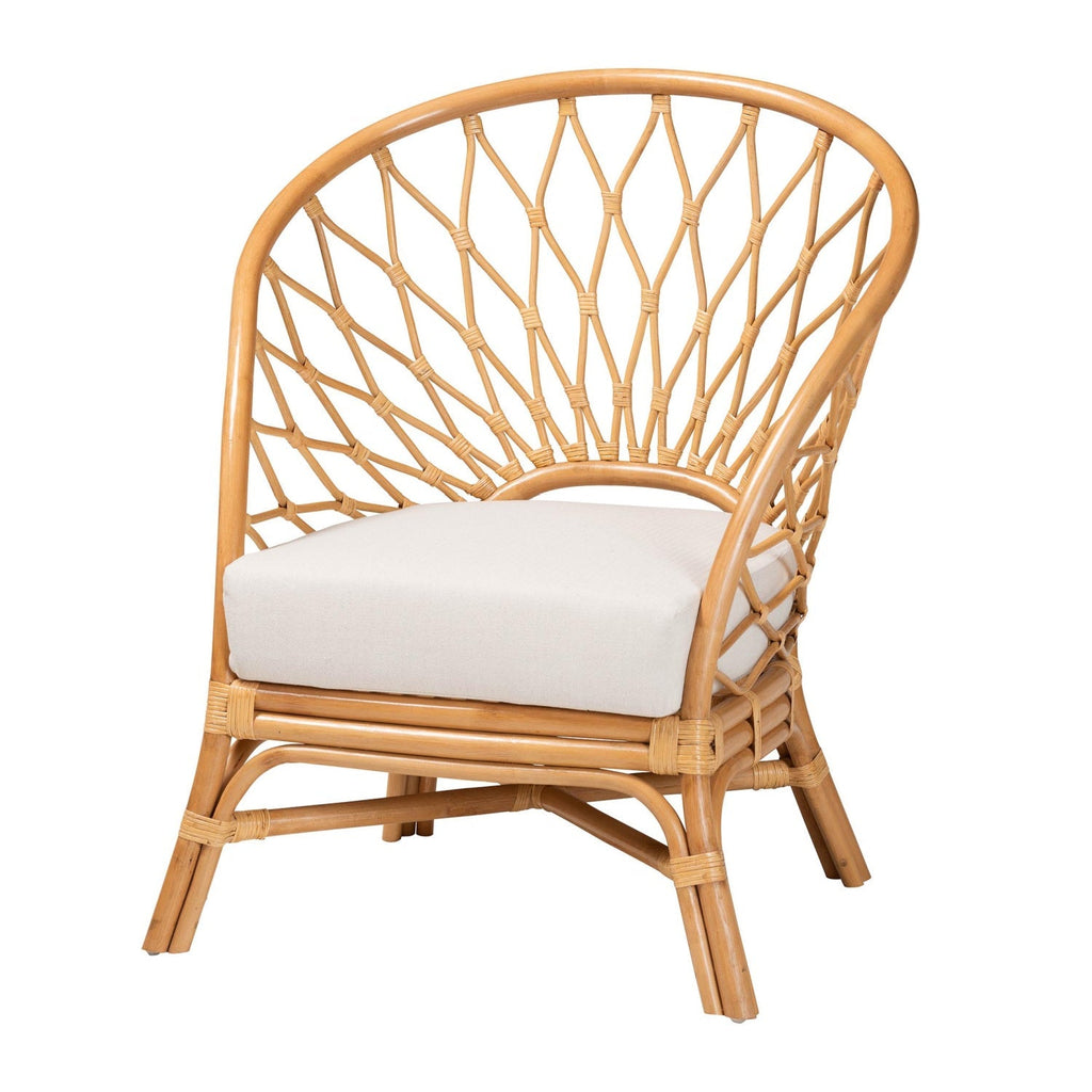 Add a touch of rustic tranquility to your space with the carefree charisma of the Emmeline accent chair. This bohemian piece is handcrafted from natural rattan by skilled artisans. Its beautifully smooth backrest curves around the frame to form sloping armrests while the openwork design creates an enchanting display. The Emmeline will arrive fully assembled and is fitted with a removable cushion padded with plush foam and upholstered in sumptuous fabric for a superb embrace. Angled legs complete the look, making the Emmeline accent chair a fantastic fusion of style and comfort. Disclaimer: Rattan is a product of nature and may have variations in areas such as, but not limited to, color, pattern, grain and texture. The hair-like strands of rattan/rattan-fiber are common due to the nature of the material.