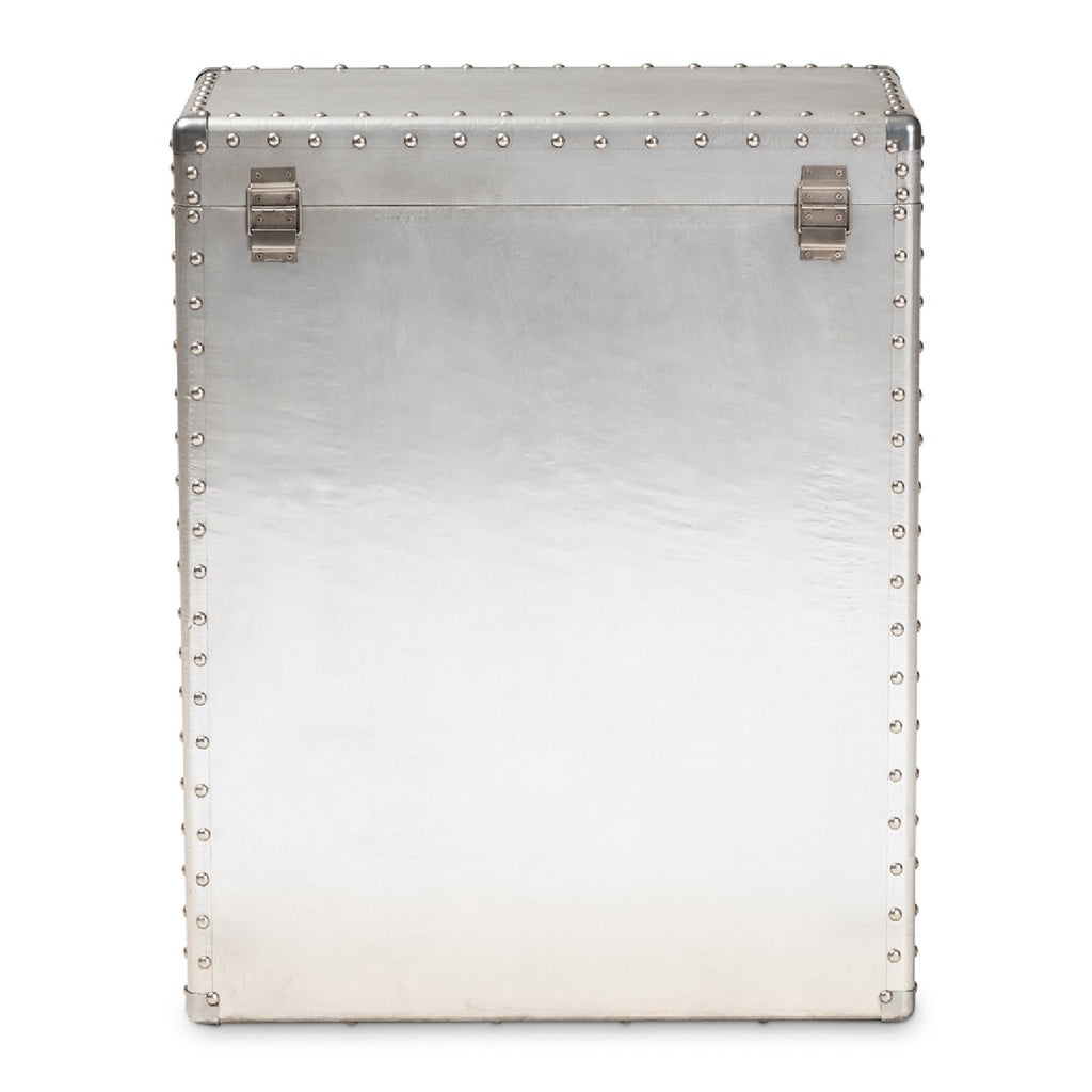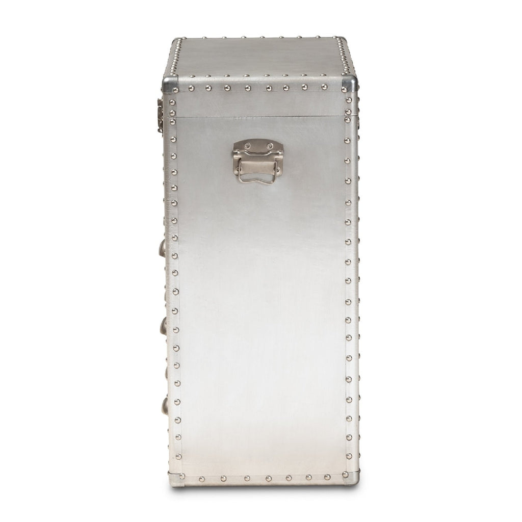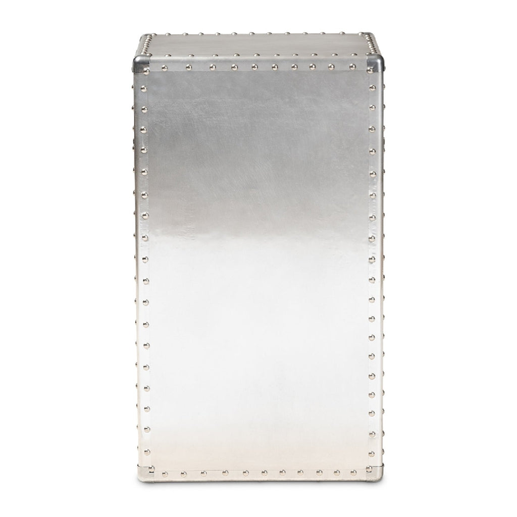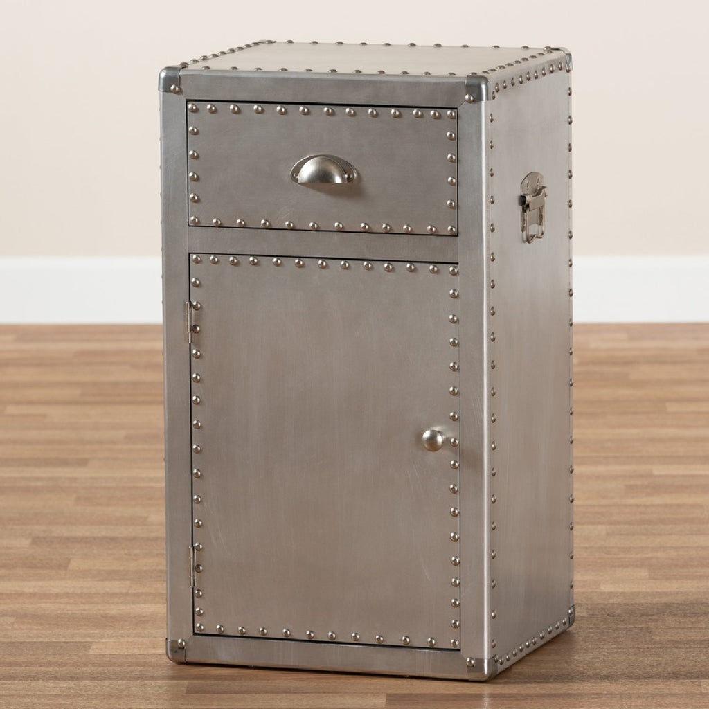 Bring chic industrial style into your space with the Serge cabinet. Constructed from wood and metal, the Serge features one drawer and one concealed compartment, behind a door, to keep items organized and out of sight. Polished silver metal drawer handles add a sleek touch. Inspired by vintage storage trunks, the Serge is embellished with rivets and corner protectors. Use this piece as a nightstand in the bedroom or as an accent piece in the living room.