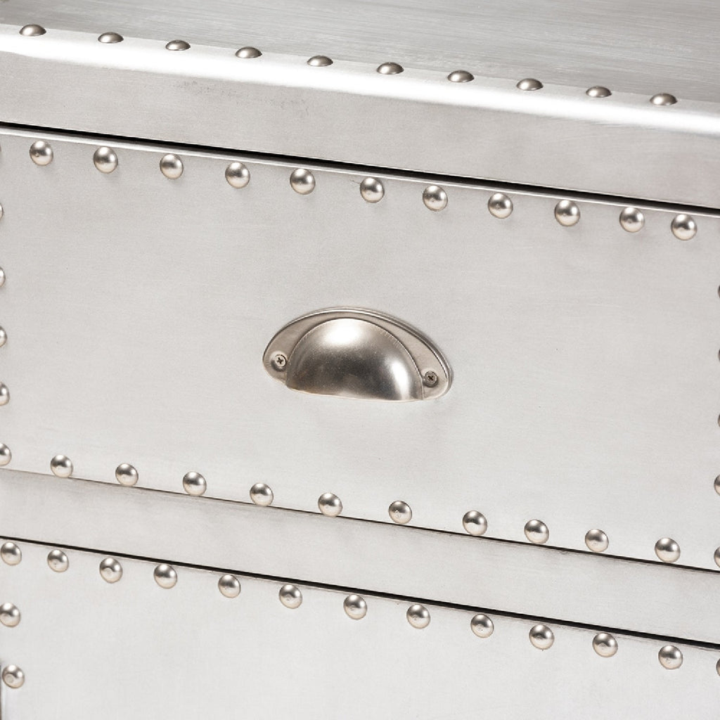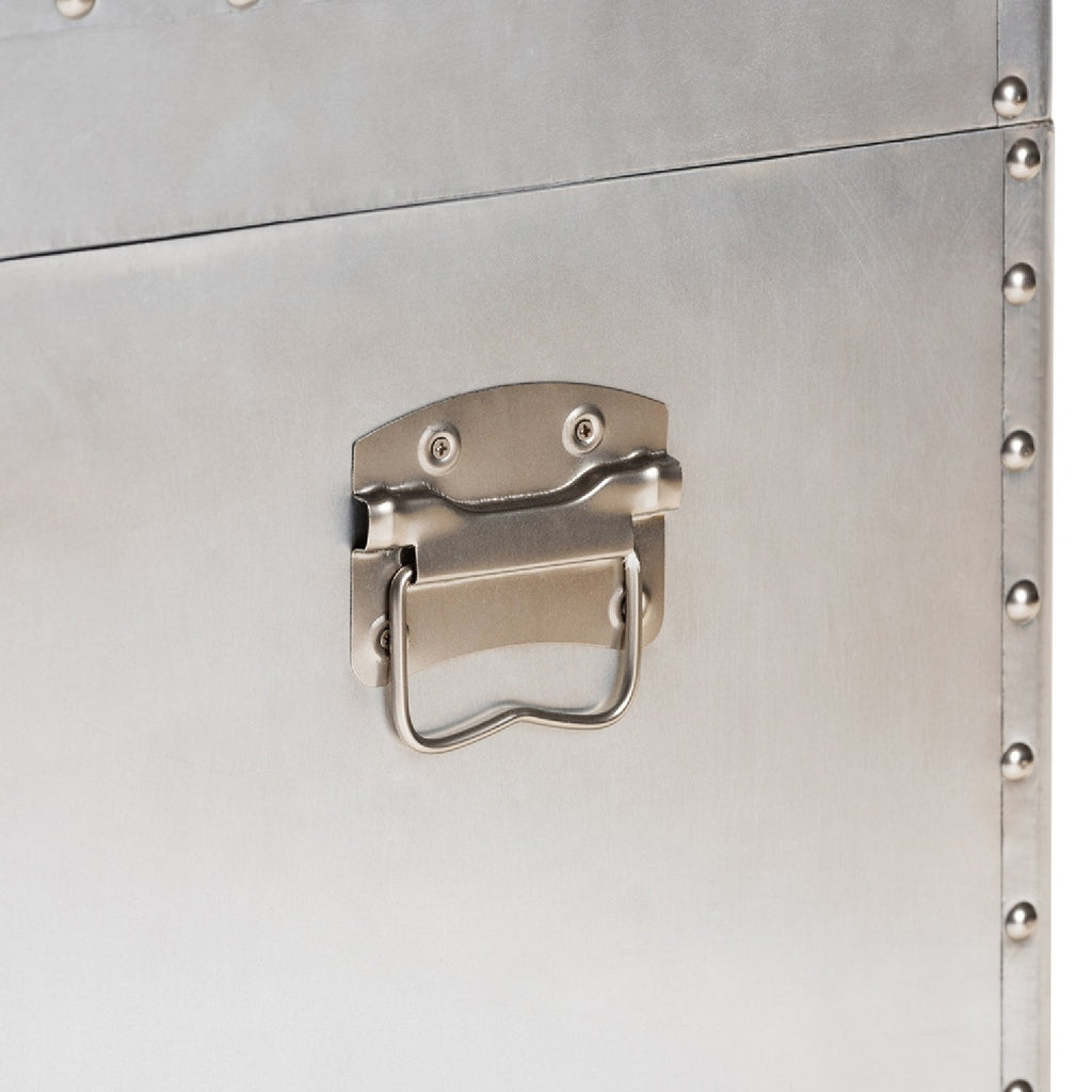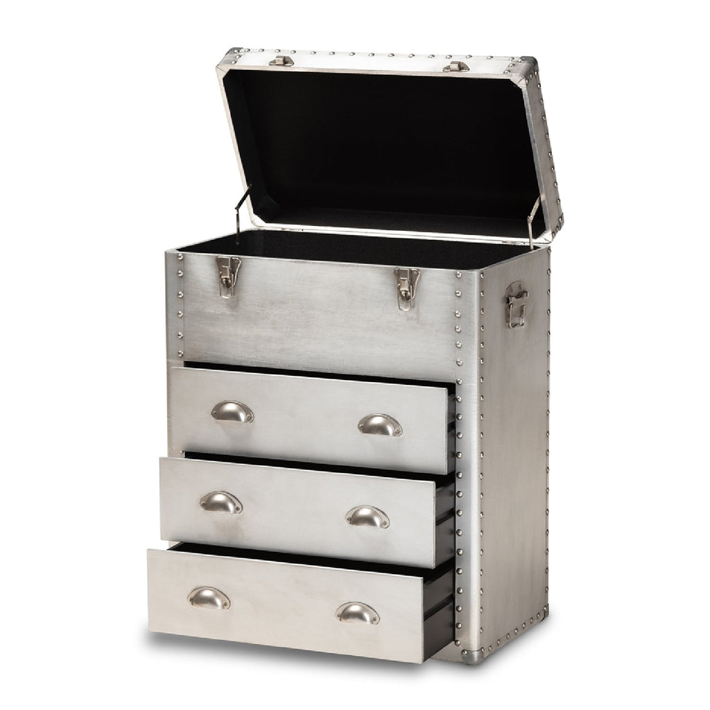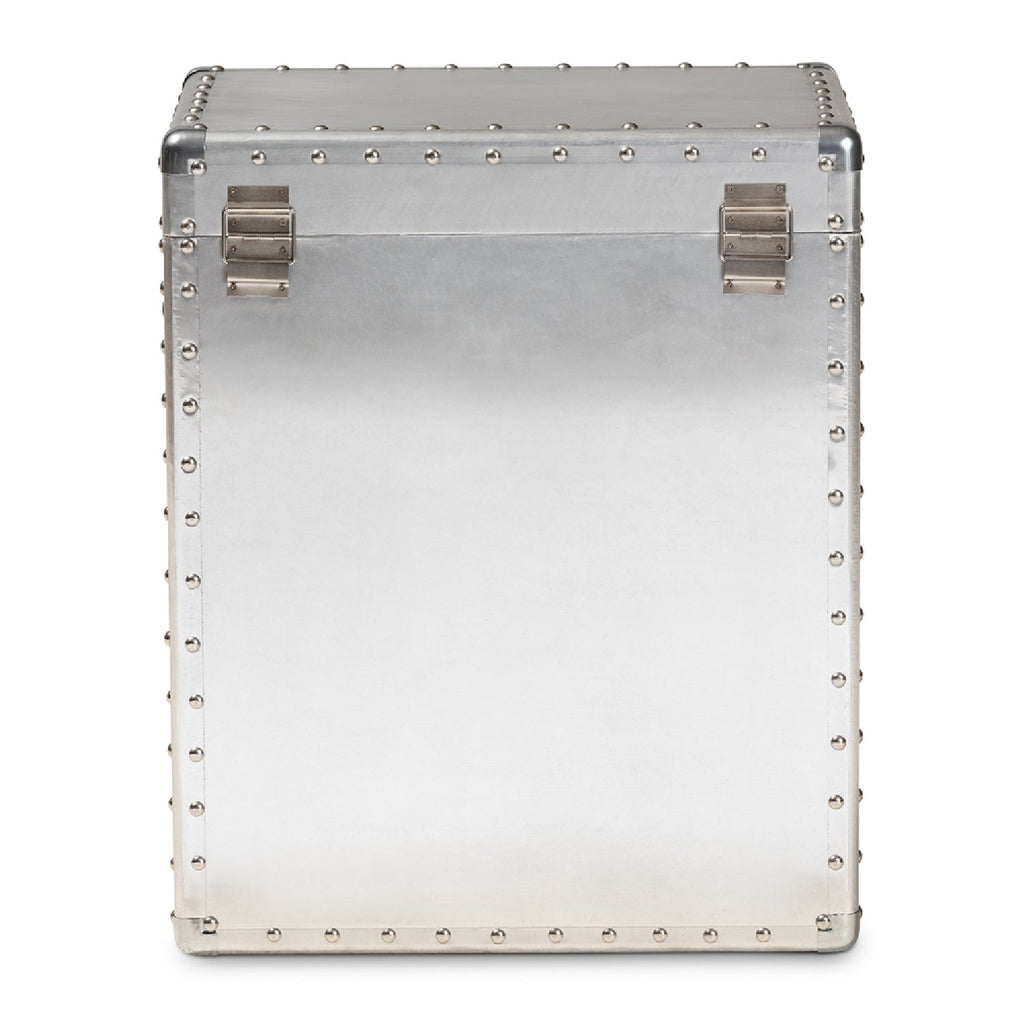 Bring chic industrial style into your space with the Serge cabinet. Constructed from wood and metal, the Serge features one drawer and one concealed compartment, behind a door, to keep items organized and out of sight. Polished silver metal drawer handles add a sleek touch. Inspired by vintage storage trunks, the Serge is embellished with rivets and corner protectors. Use this piece as a nightstand in the bedroom or as an accent piece in the living room.