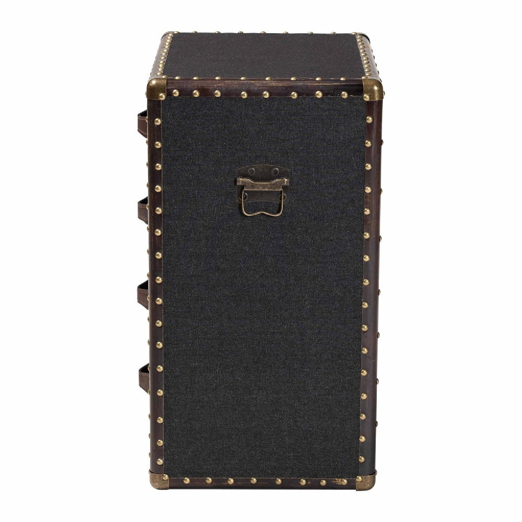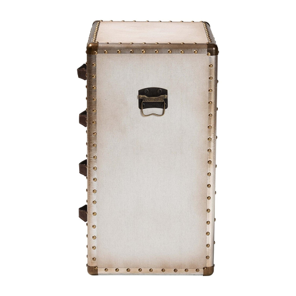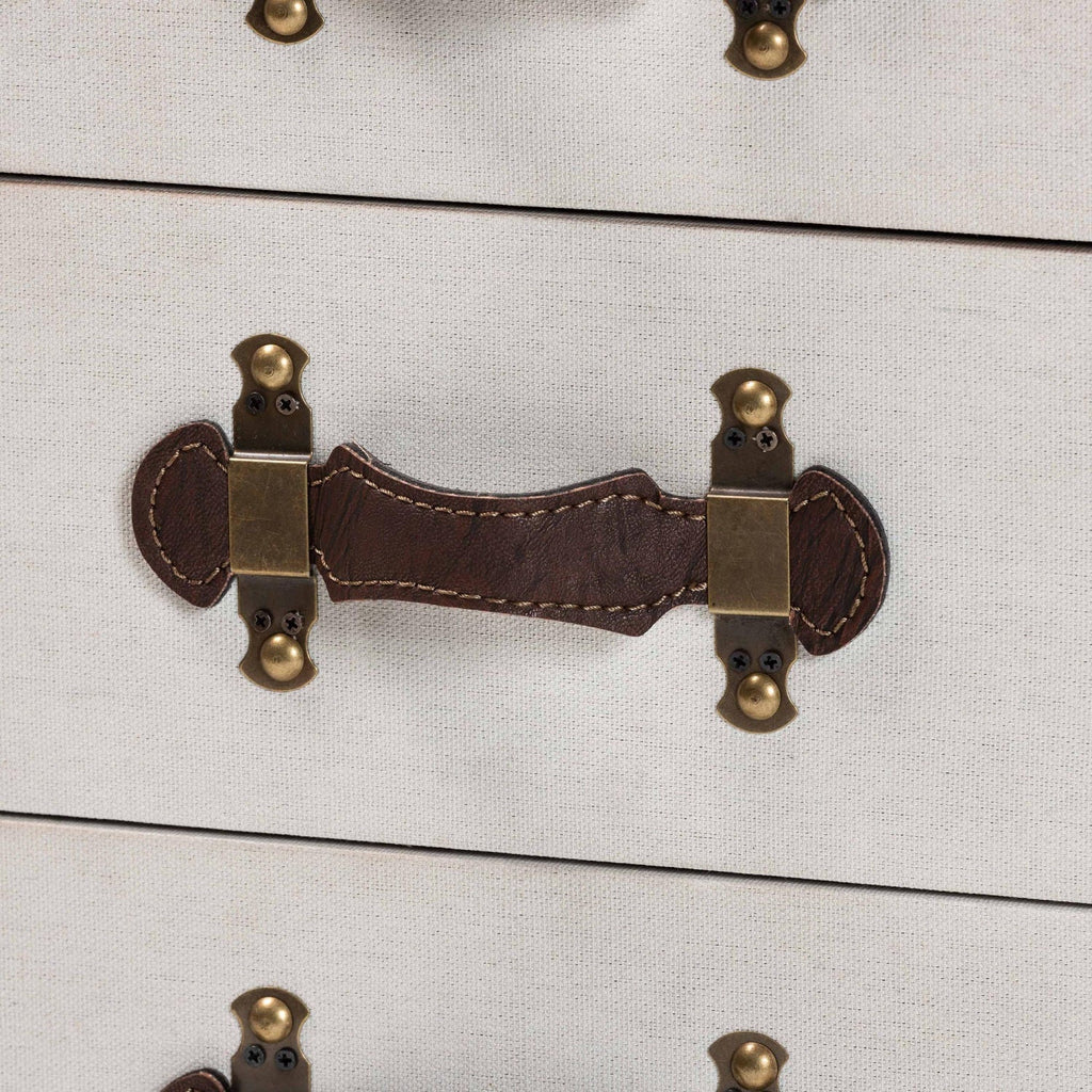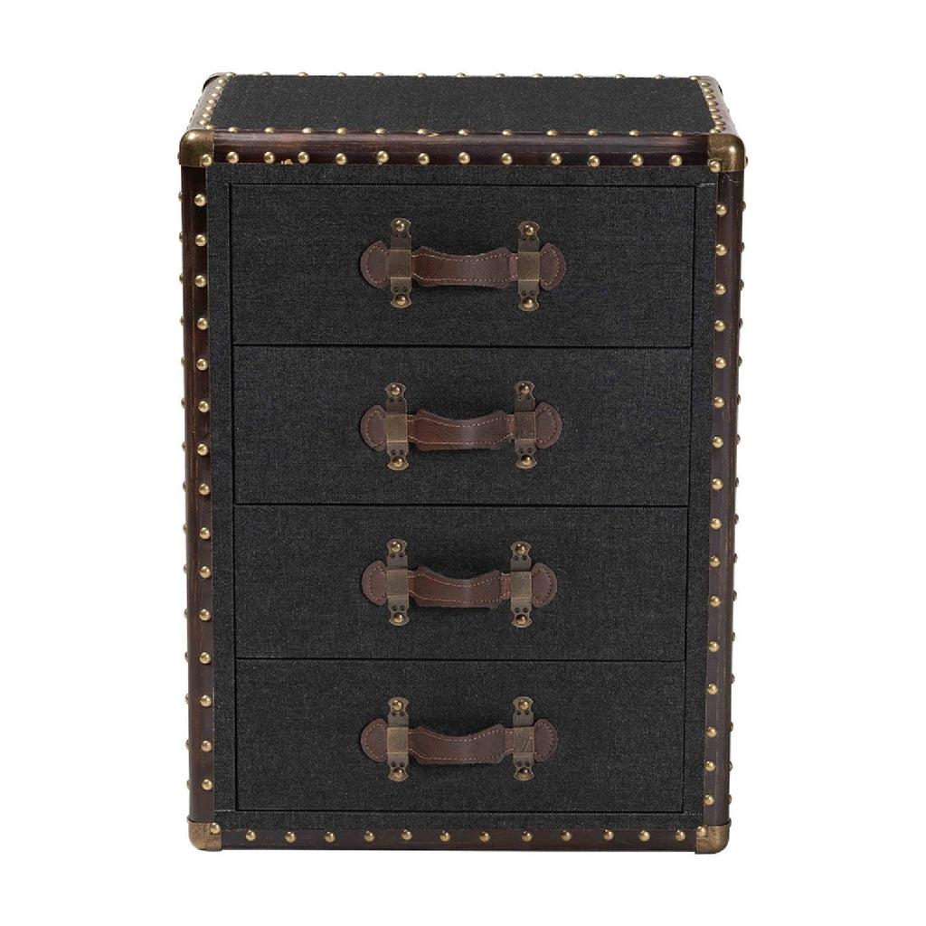 Rediscover the robust charisma of classic craftsmanship with the stunning Jaelyn end table. This vintage inspired piece consists of a sturdy wood frame wrapped in smooth canvas. Fours drawers provide spacious storage for a variety of household essentials while leather handles accentuate the industrial nature of the piece. The Jaelyn will arrive fully assembled and is affixed with metal bands studded with nail heads that lend an enchanting look from any angle. An extraordinary combination of form and function, the Jaelyn end table enlivens any arrangement.