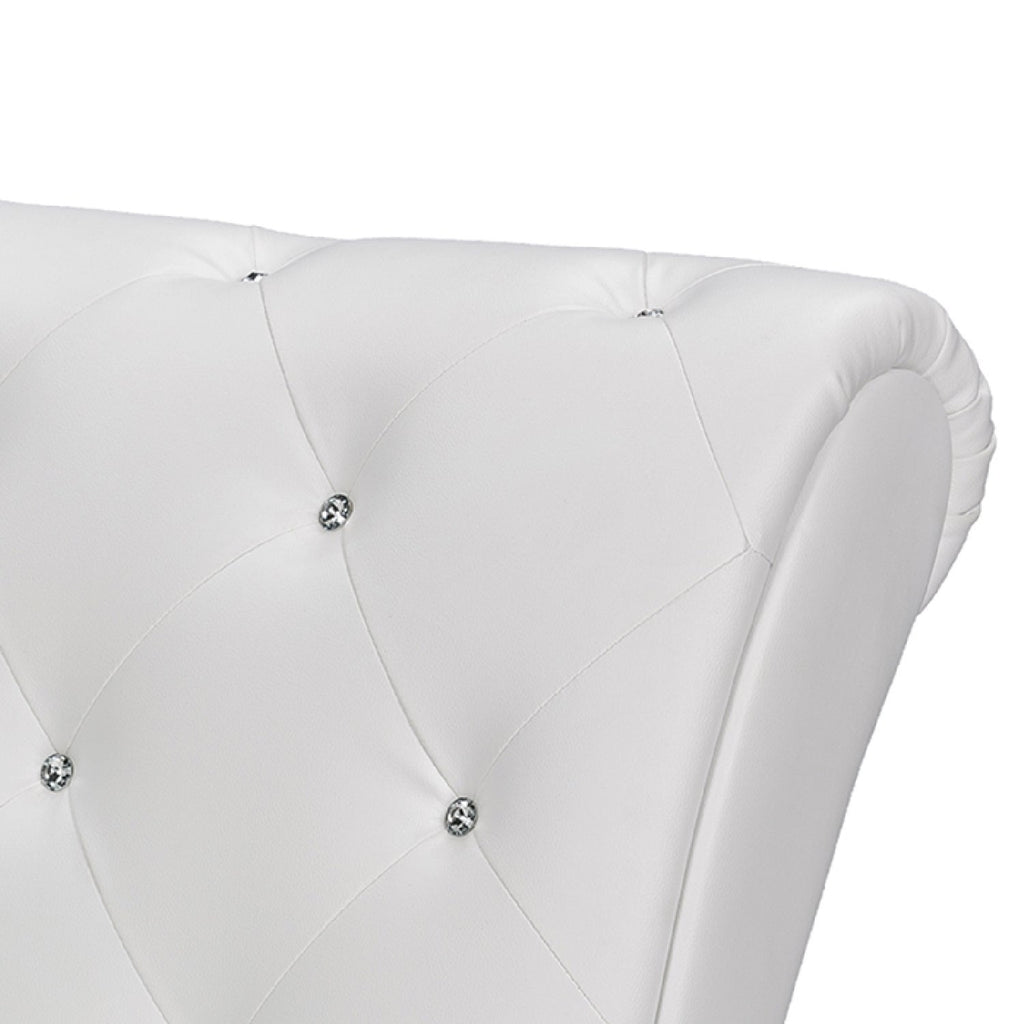 Extend your legs in comfort on this elegant chaise lounge. This Pease cotemporary white leather upholstered and crystal tufted chaise lounge features white faux leather upholstery and faux crystal buttons tufting that lends itself well to a variety of decor.