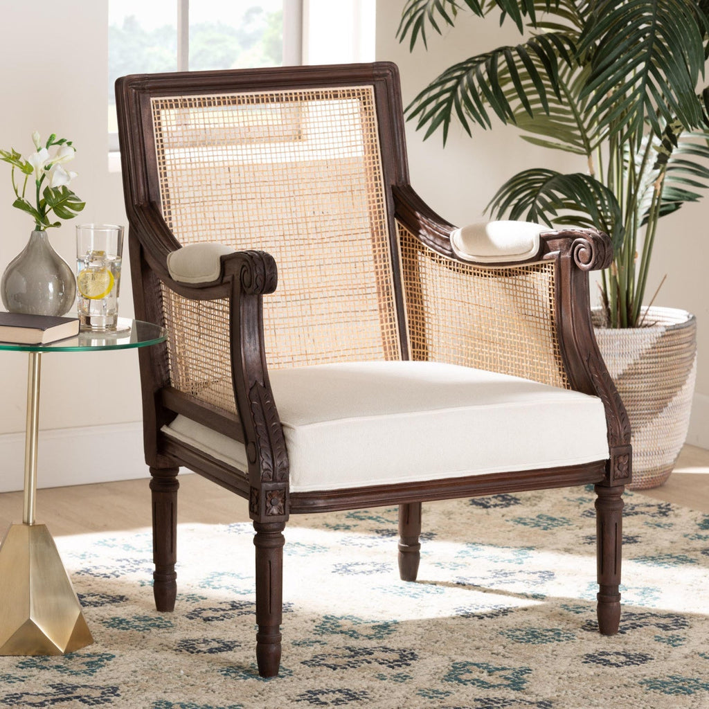 An aura of timeless refinement radiates from the stunning Desmond accent chair. This traditional French piece consists of a sturdy bayur wood frame padded with foam and upholstered in soft fabric. Convenient armrests flow forward to encourage carefree leisure while the woven rattan backrest offers a cozy embrace. The Desmond requires assembly and features spade legs for excellent stability and support in elegance design. Molded detailing highlights the detailed craftsmanship, making the Desmond accent chair a fantastic addition to any layout. Rattan is a product of nature and may have variations in areas such as, but not limited to, color, pattern, grain and texture. The hair-like strands of rattan/rattan-fiber are common due to the nature of the material.