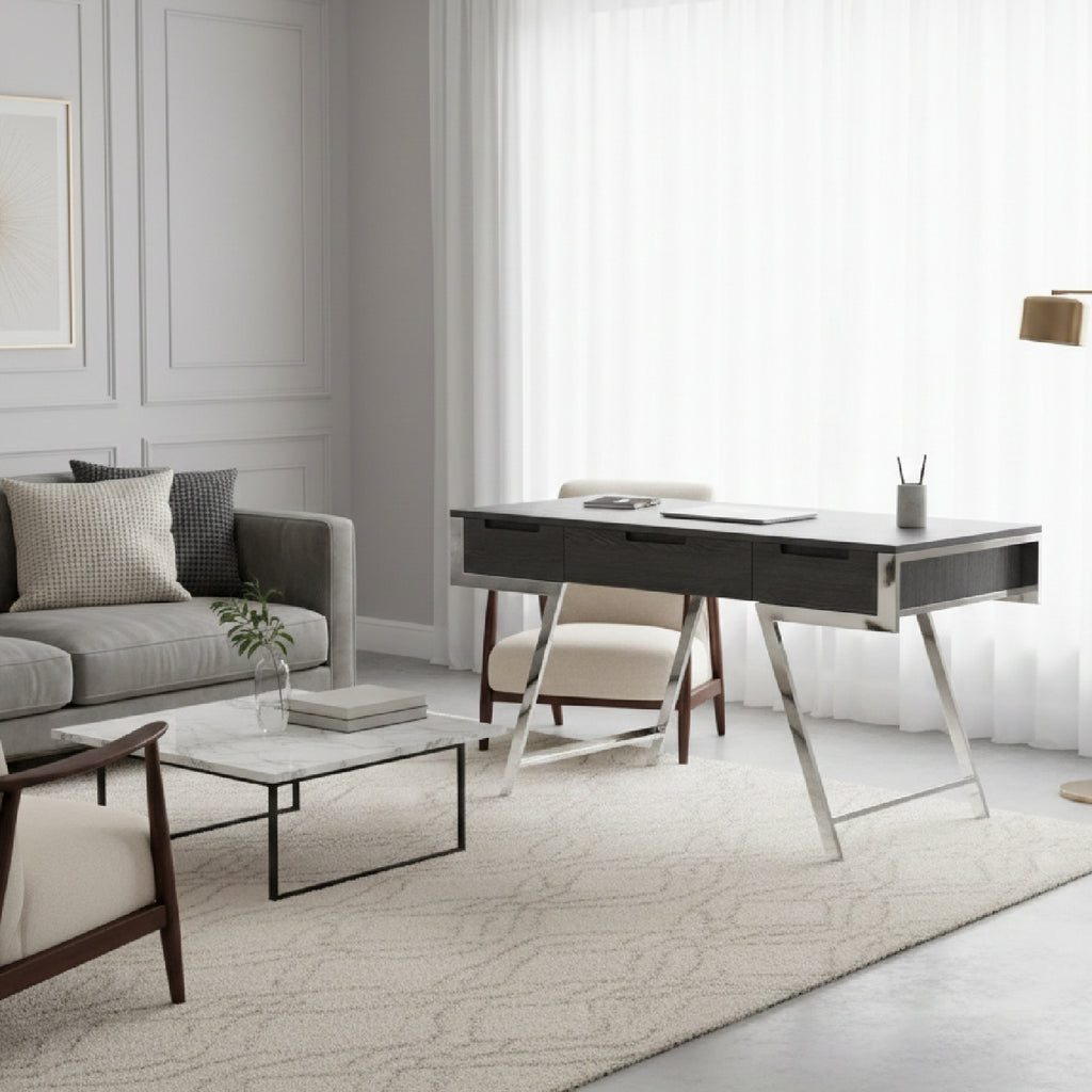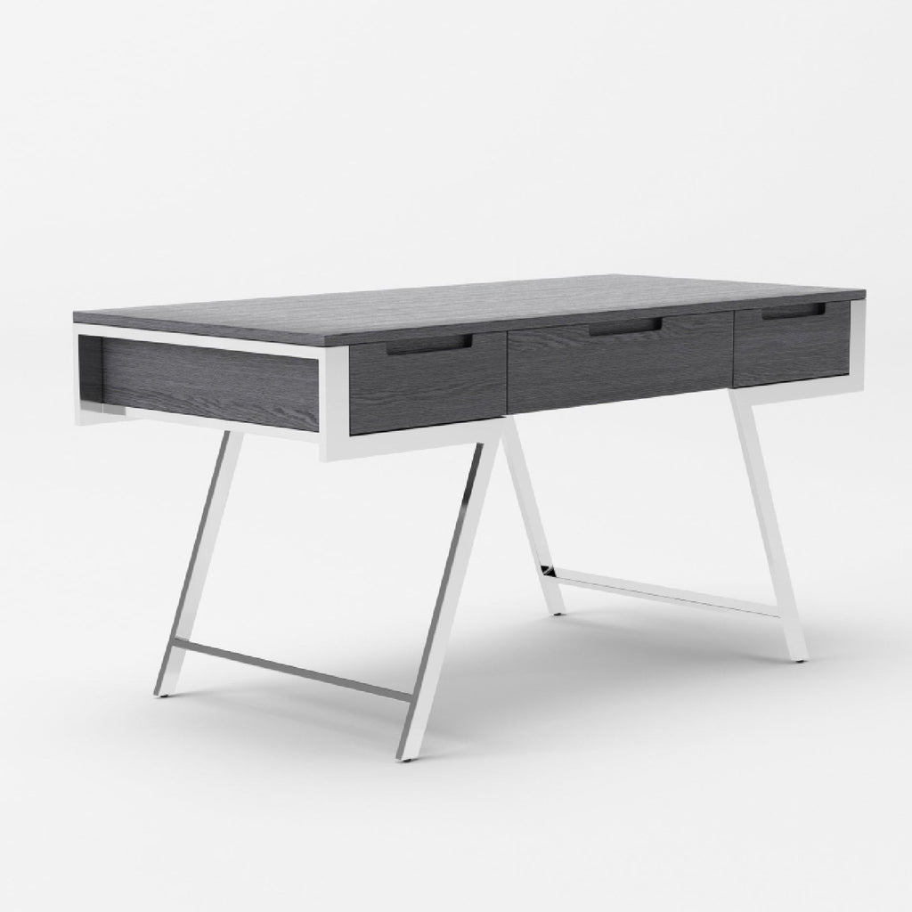 The Dessart Desk has a large tabletop for artists or someone that needs space to lay out their work. The natural American gray elm veneer and exposed stainless-steel legs make this modern desk a great addition to an office. It has three drawers and loads of leg room.