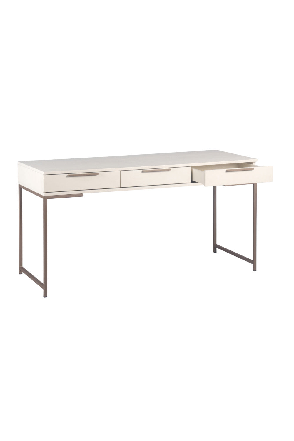 A modern desk designed to add a beautiful touch to office spaces. Crafted from oak wood veneer with three soft closing drawers for ample storage. Brushed champagne gold iron hardware completes the look.