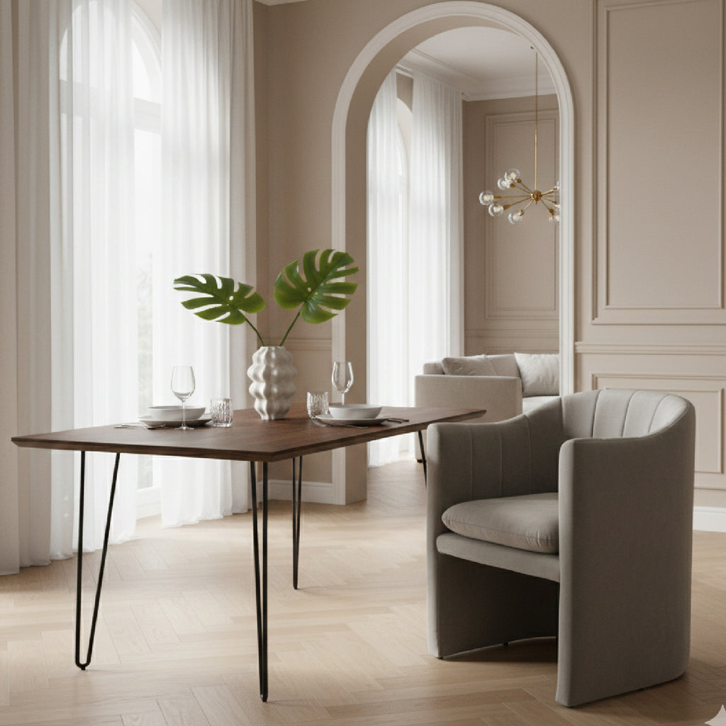 The Danube Modern Dining Chair is a perfect collection of curvilinear lines and soft Beige velvet upholstery to stimulate the eye of its beholder. The modern shape is offset by the mid-century upholstery. Perfect with a walnut dining table to create a stylish dining experience.