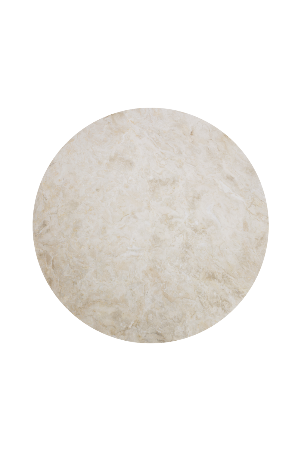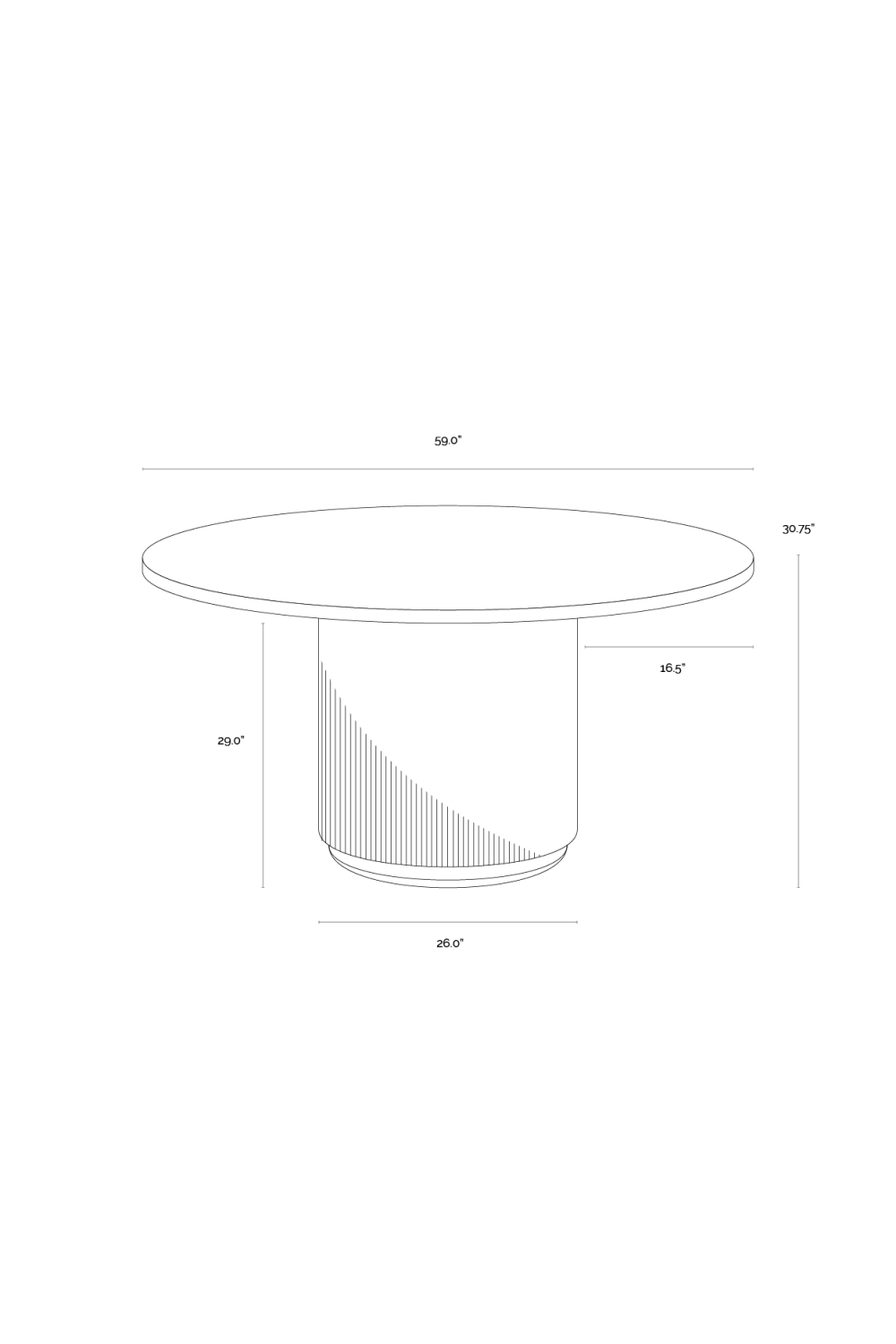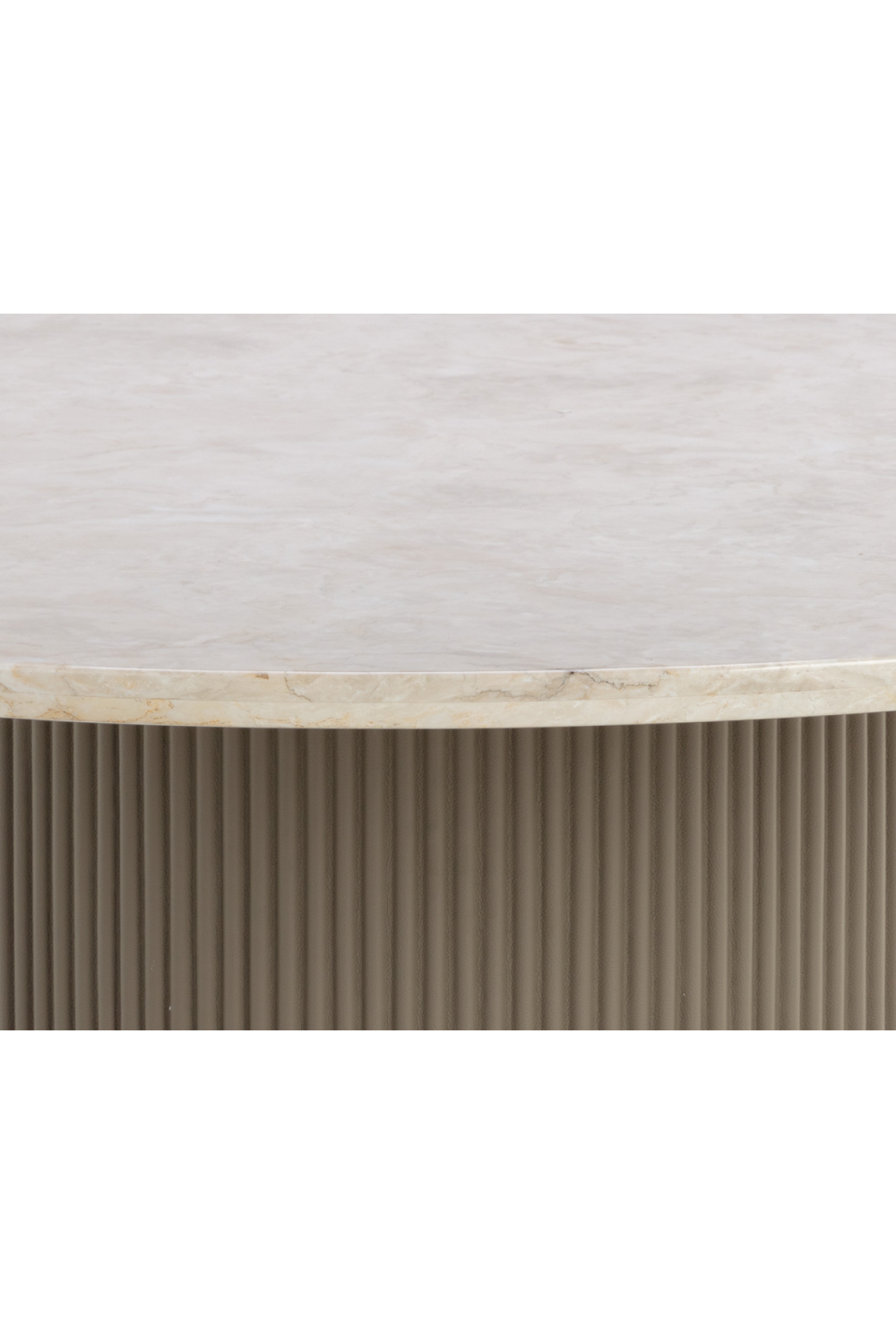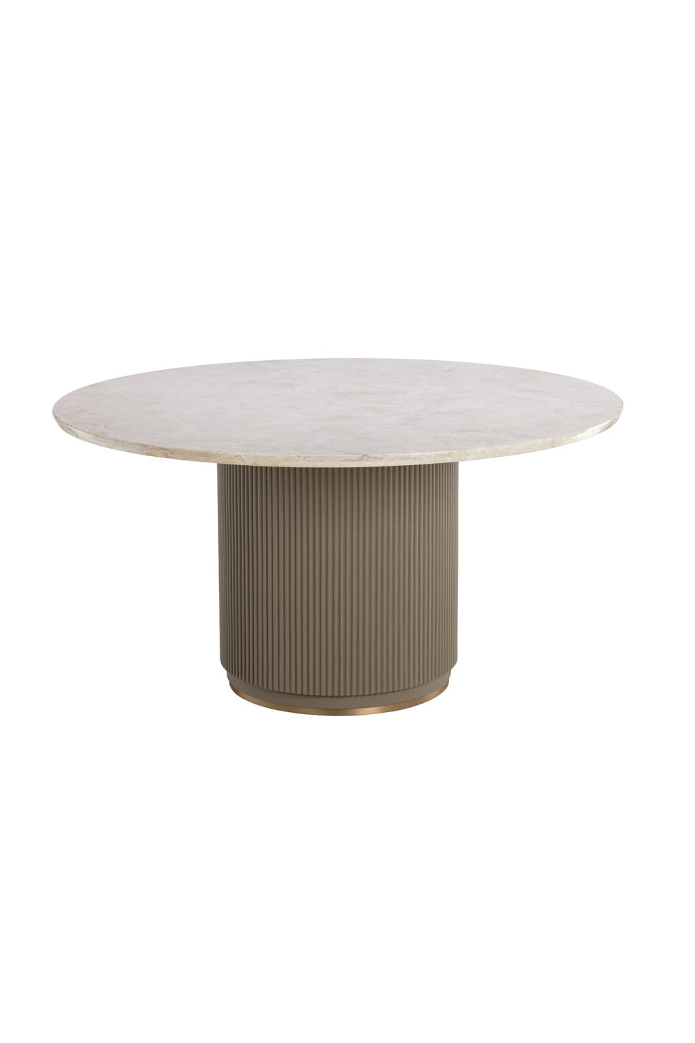Refined mixed materials with an architectural influence define the Cataldi Dining Table. Fluted detailing in the taupe faux leather base adds intriguing texture that contrasts against the smooth polished beige marble tabletop. Gold stainless steel trim at the bottom of the base finishes the piece.