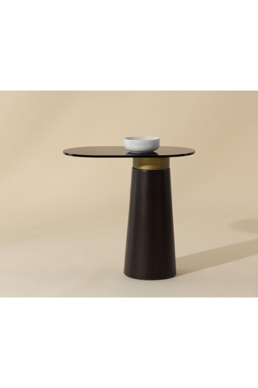 Defined by its fabulous form, this stunning end table features an unconventional shape that will captivate any space. Crafted with a black glass top and a dark brown concrete base with a timber effect. A powder coated brass metal rim completes the look. Crafted from a natural concrete mix, each piece will look different. Variations in color, texture, imperfections, surface scratches and non-structural hairline cracks are considered inherent and valued qualities of the material.