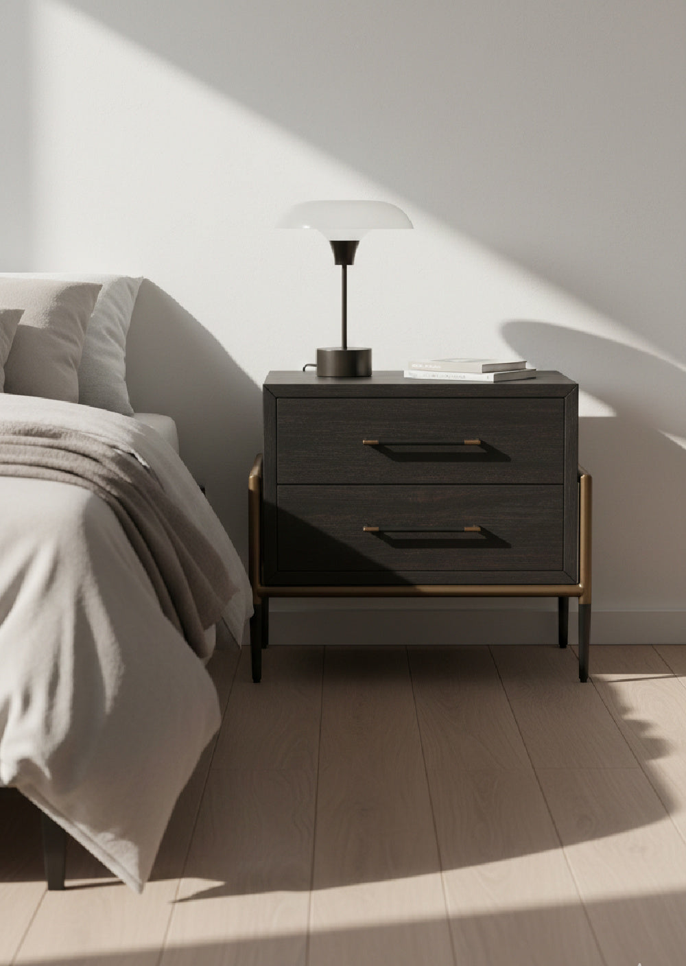 Make a statement with this stylish nightstand that exudes prestige. Completed with powder-coated black and antique brass iron handles with a coordinating base. As wood is an organic, porous material, these pieces will contain natural variation of texture and may also exhibit fine indentations and cracks. Wood pieces will also display a disparity of color and grain, and visible knots and burls that add to the character of each piece.