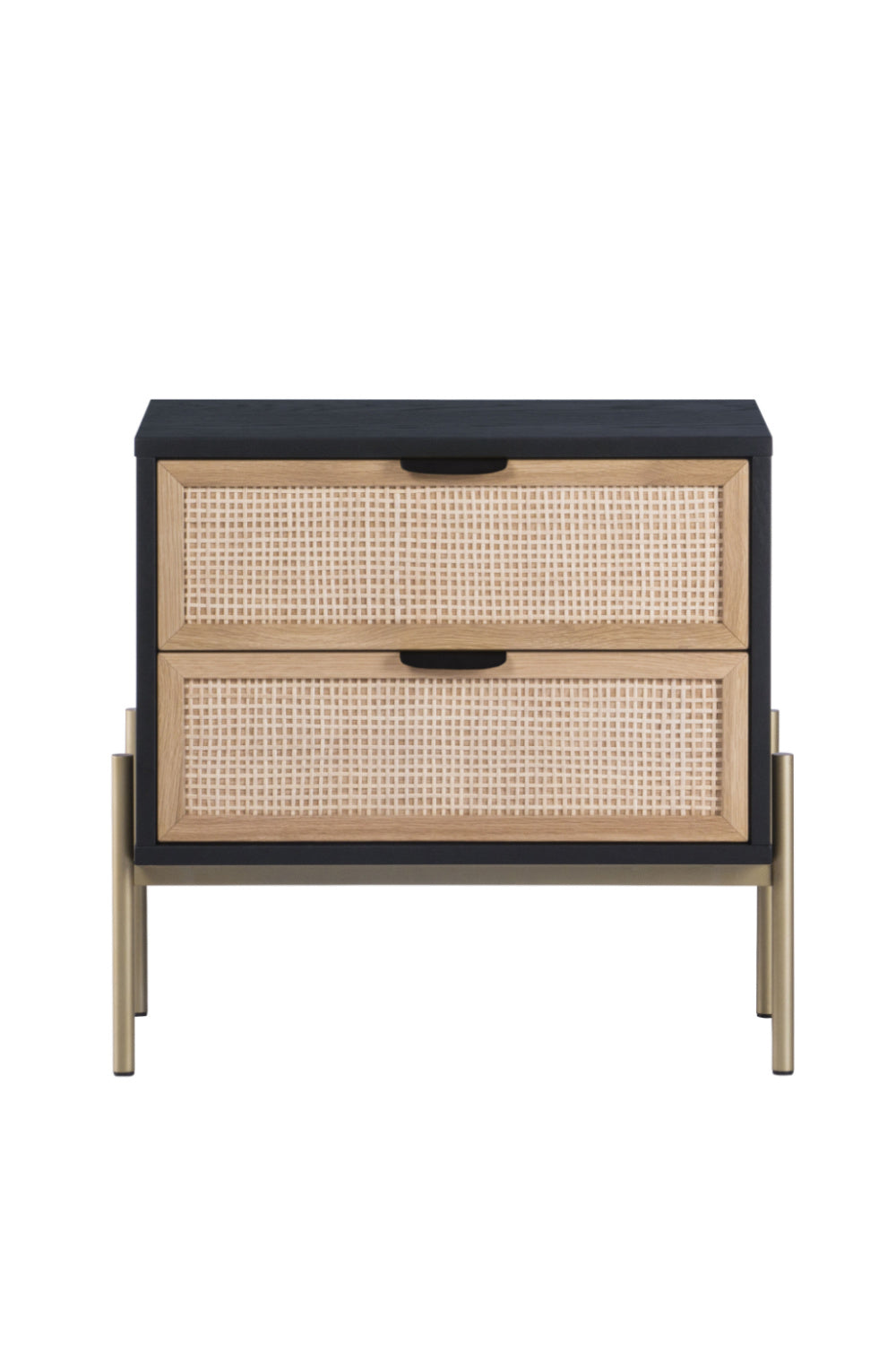 Create a bedroom influenced by global travels with this stylish nightstand crafted in Indonesia. Features two natural rattan drawers contrasted with a black oak wood frame. Gold iron feet and matte black steel handles complete the design.