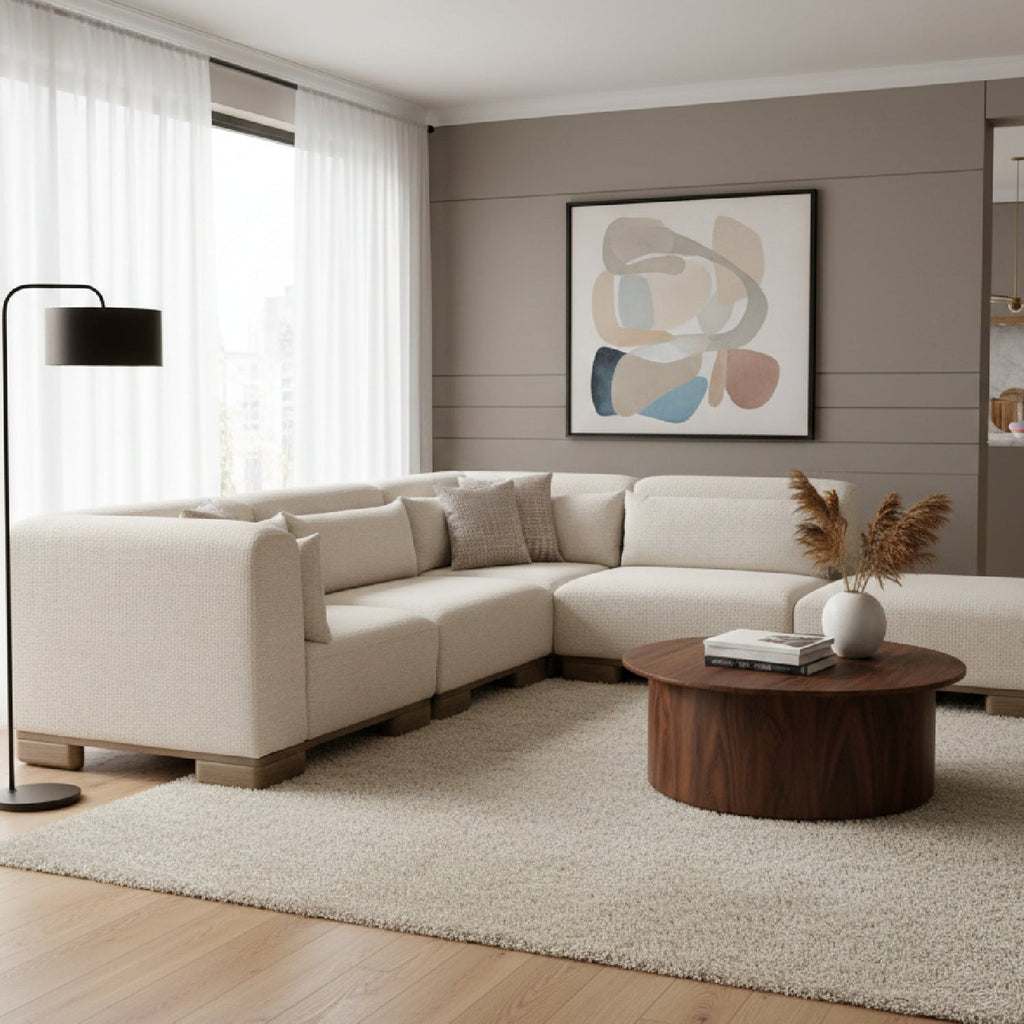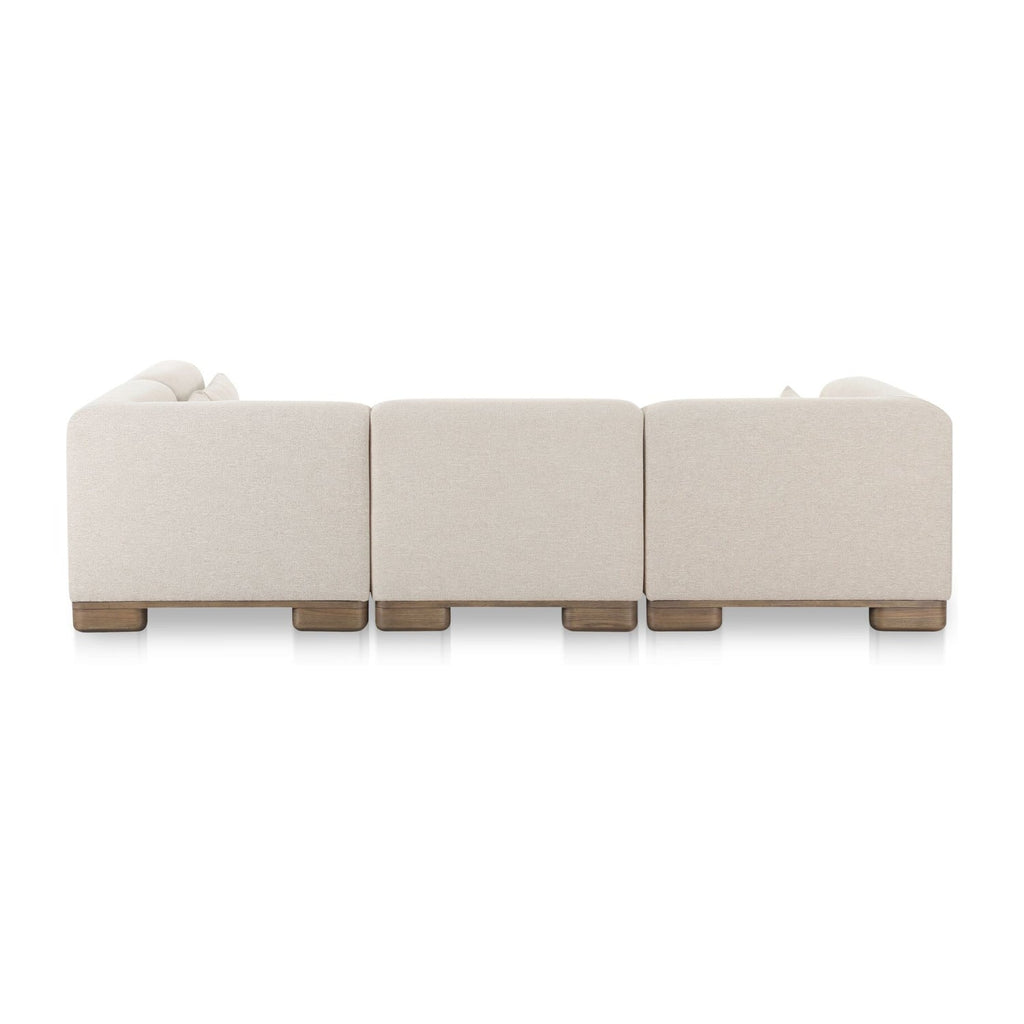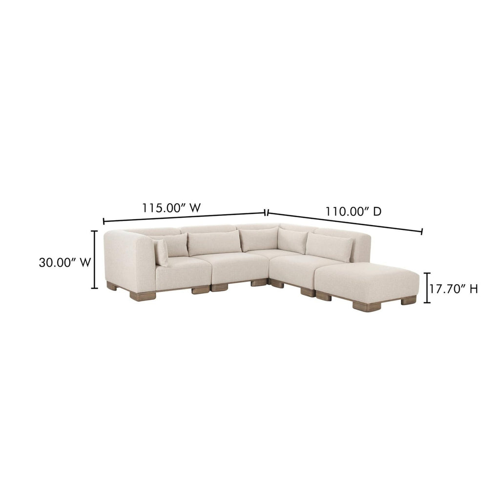 Designed with modular components that expertly function as standalone pieces or as part of modular configurations, the June collection is all about versatility. Wrapped in warm-toned, textured performance fabrics and elevated by oversized oak veneer legs, this piece combines everyday living and understated elegance. Built for ultimate relaxation — the plush feather and fiber fill, along with lumbar toss cushions, offer ultimate comfort. Consists of 5 modular parts: 2 corner, 2 slipper & an ottoman for easy switch around.