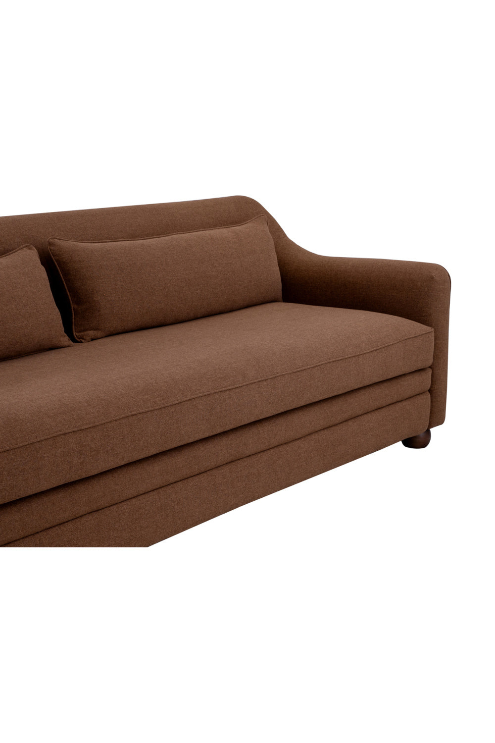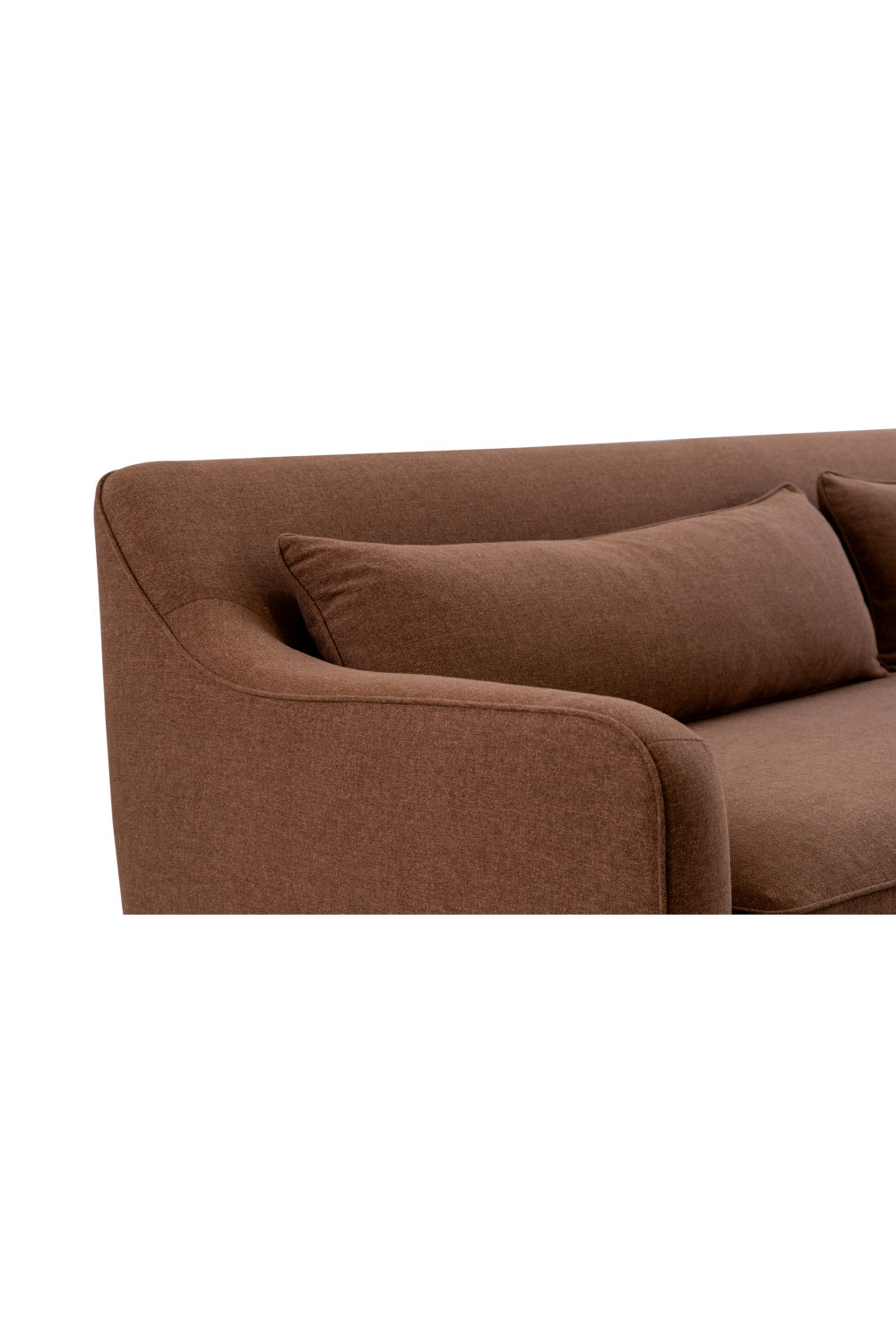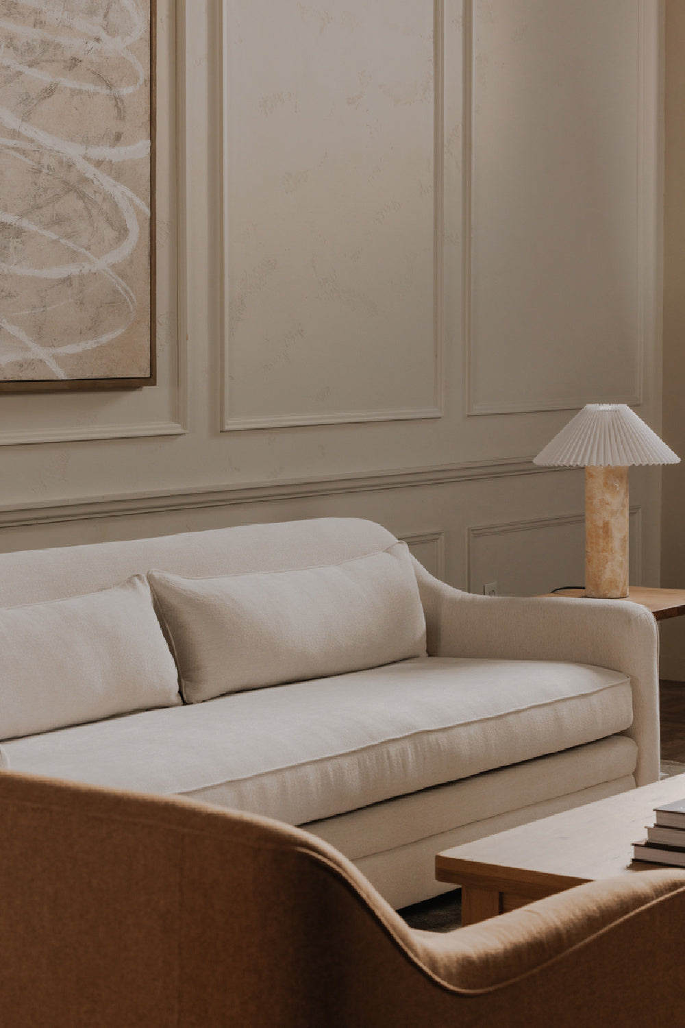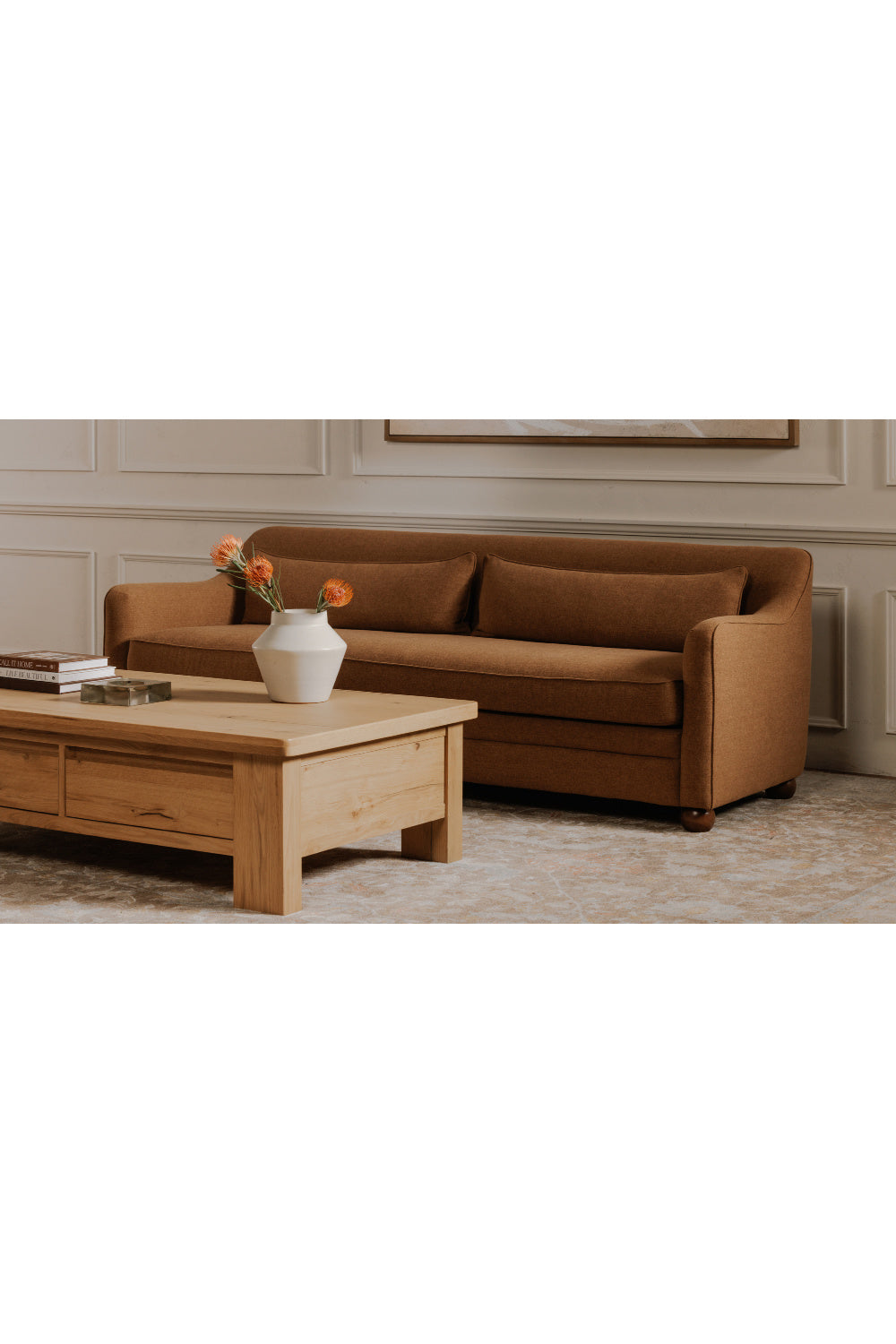 The Amira sofa offers warmth and comfort with its gracefully curved high back and subtly flared arms. Upholstered in durable polyester fabric with piping cushion details. The feather and fiber topped bench seat cushion creates luxurious repose. Generously proportioned lumbar cushions and solid wood feet complete this centerpiece.