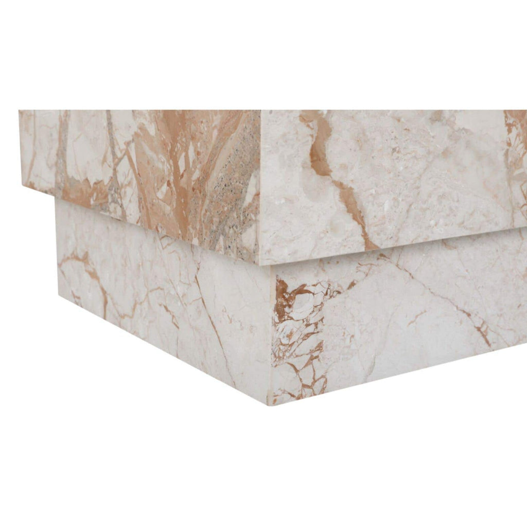 The Layla side table adds understated elegance with its minimalist square form and subtly recessed base. Crafted from exquisite Italian Breccia marble, it showcases nature's artistry in warm, expressive tones, making each piece unique. Its versatile design effortlessly complements various interior spaces.