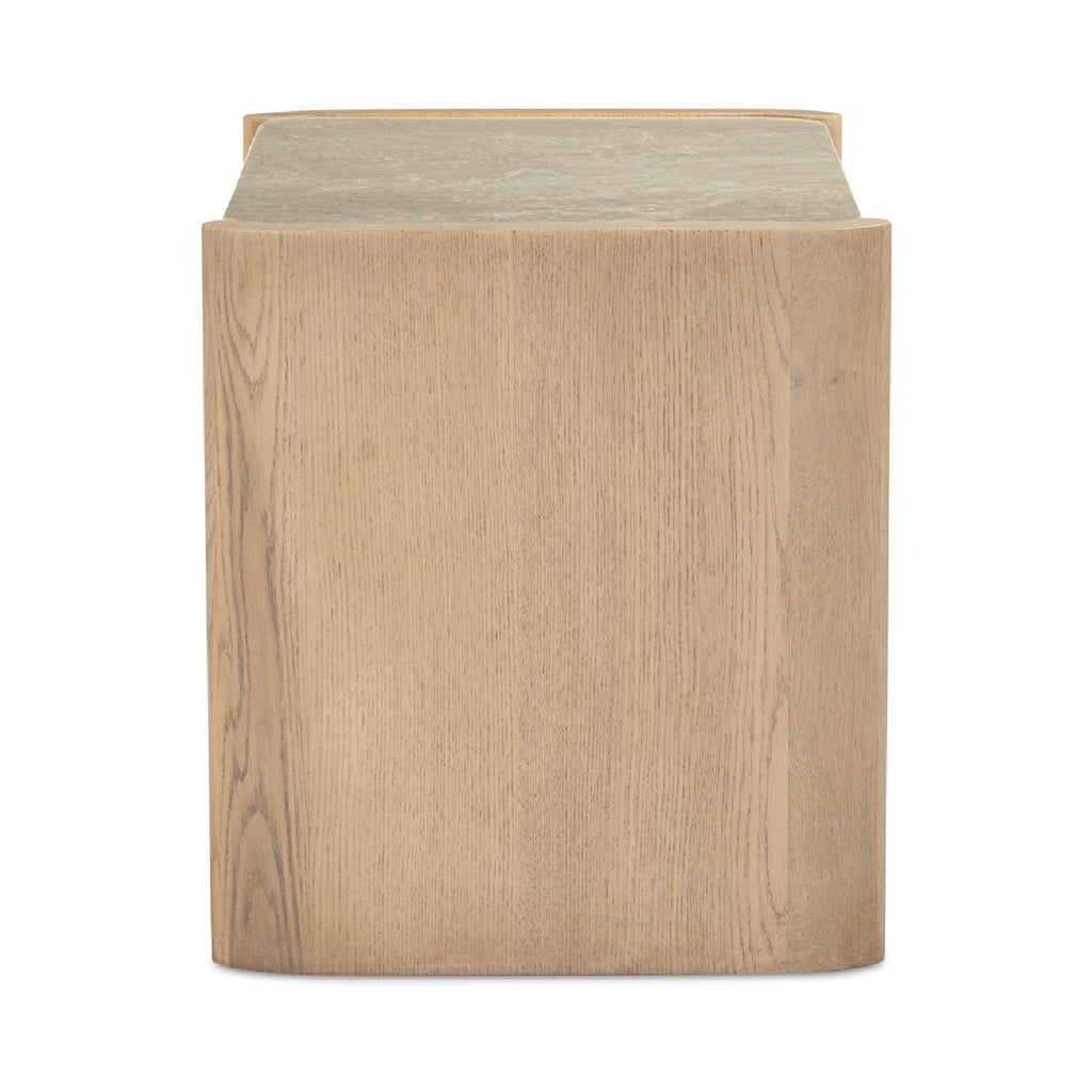 The Lane nightstand captures the essence of Scandinavian modern design. Its sleek, solid oak frame is accented by thick, curved elements that soften its silhouette, allowing its inset Italian Botticino marble top to take centerstage as its rounded overhang gracefully complements its open and closed storage that features under-mounted glides.
