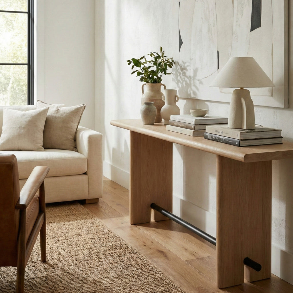 Crafted from solid oak and oak veneer, the Madison console table's graceful bullnose edges and crisp lines create a captivating interplay of form. Sculpted legs adorned with arched carvings are connected by a blackened bronze bar, infusing a subtle industrial chic and offering a sophisticated focal point for entryways or living spaces.