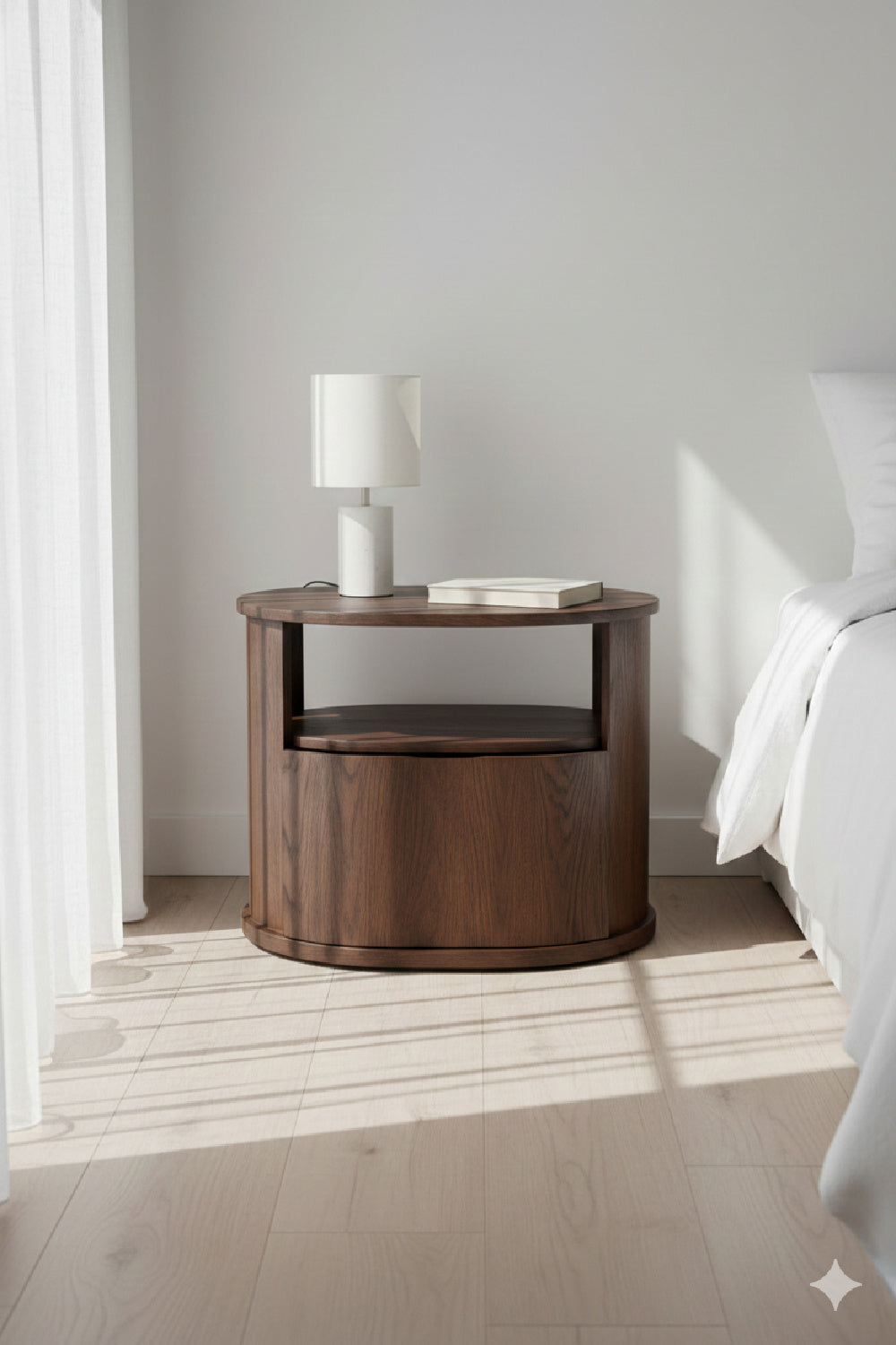 The Tommy nightstand embraces modern simplicity in a natural finish. Its distinctive racetrack capsule shape adds a contemporary touch to the bedroom, seamlessly blending form and function. This nightstand features a solid oak frame with oak veneer details, offering durability and refined style. The soft-close drawer and open shelf provide versatile storage options in a piece that speaks to modern appeal.