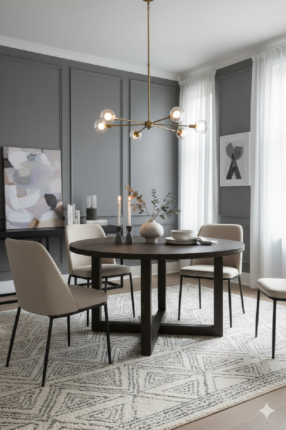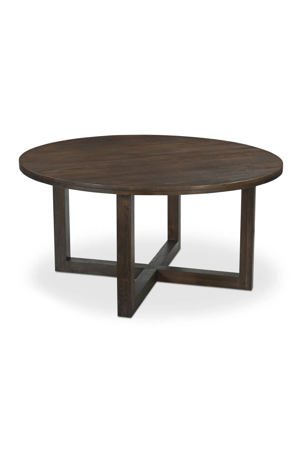 Crafted from solid oak, the Joel dining table's 40mm thick round top features a thoughtfully crafted V-groove, adding a visual lightness to the substantial surface. The geometric base, with crisscrossing stretchers, grounds the piece with quiet confidence. A natural, wire-brushed finish enhances the oak's organic beauty, creating a focal point of understated elegance.
