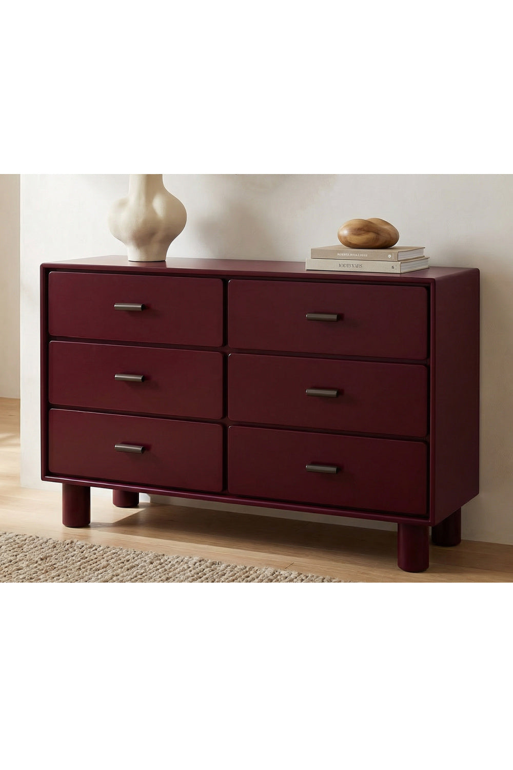 The Jolene 6-drawer dresser infuses the bedroom with a touch of vibrant elegance. This deep red dresser, expertly crafted with a rubberwood frame, offers both style and practicality. The six drawers provide versatile organization options. Playful legs and a paired-back frame with handle detailing create a charming silhouette that brings personality without compromising sophistication.