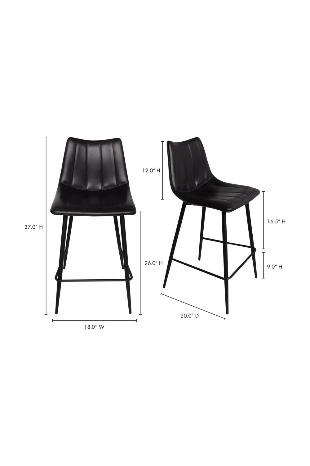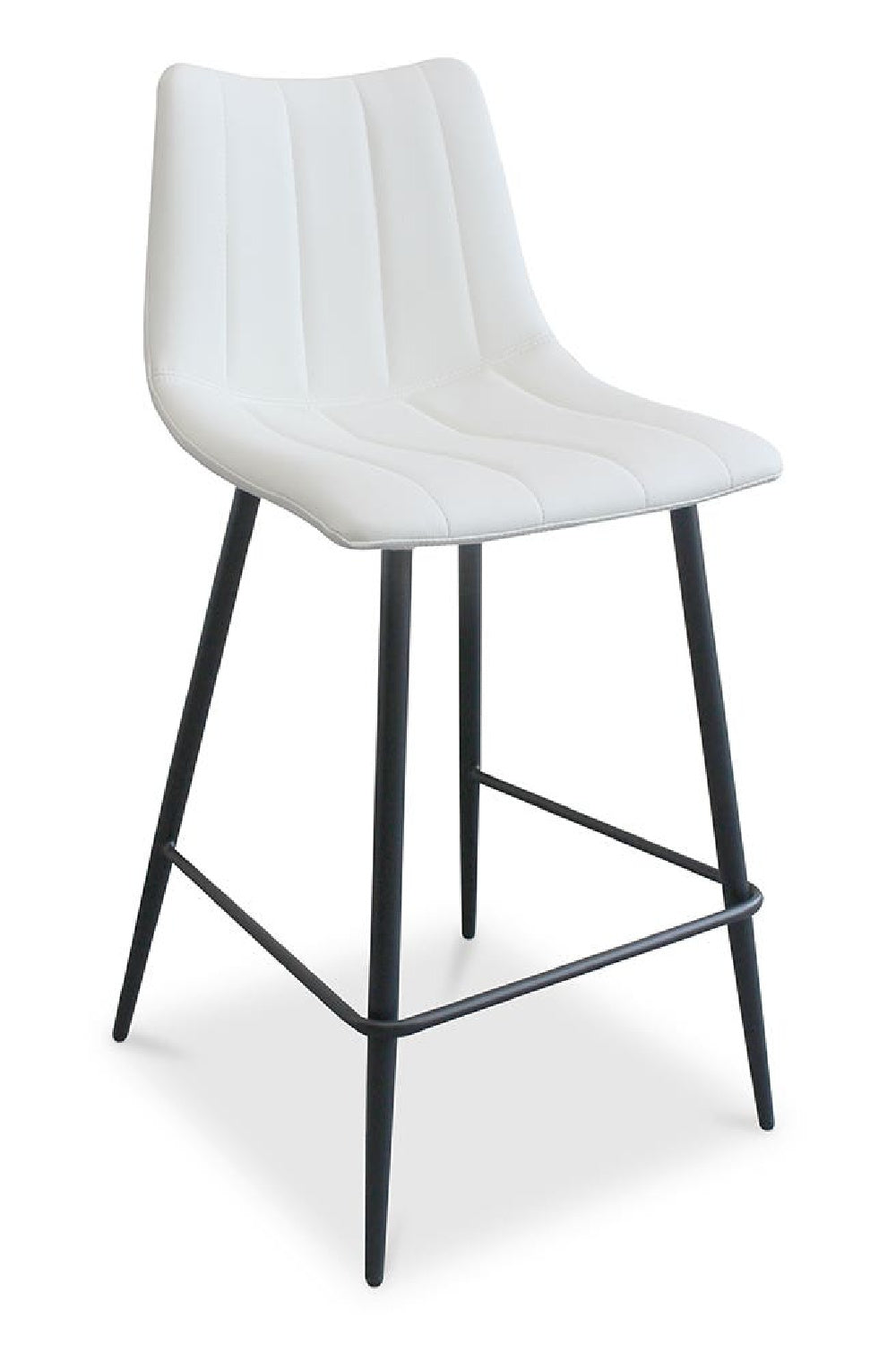 Contemporary modern counter stools get a new take with this sleek aesthetic. Available in several colors, the Alibi counter stool features striking vertical line stitches that add subtle detail to its monochromatic design. A soft vegan leather seat is shaped to fit for comfort so guests can relax at the island or bar counter.