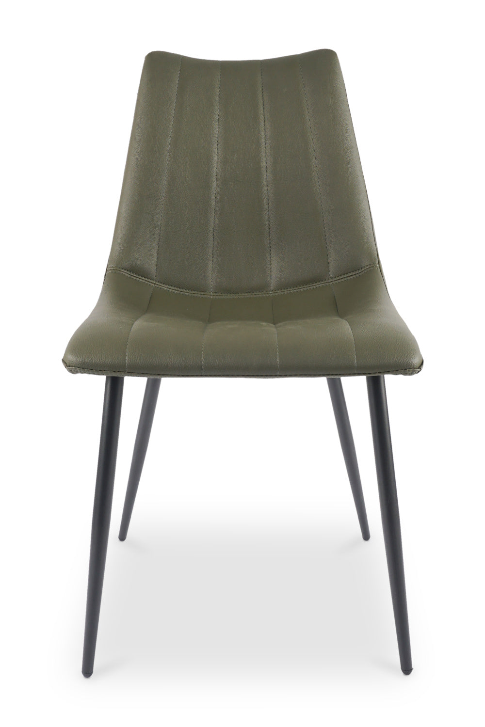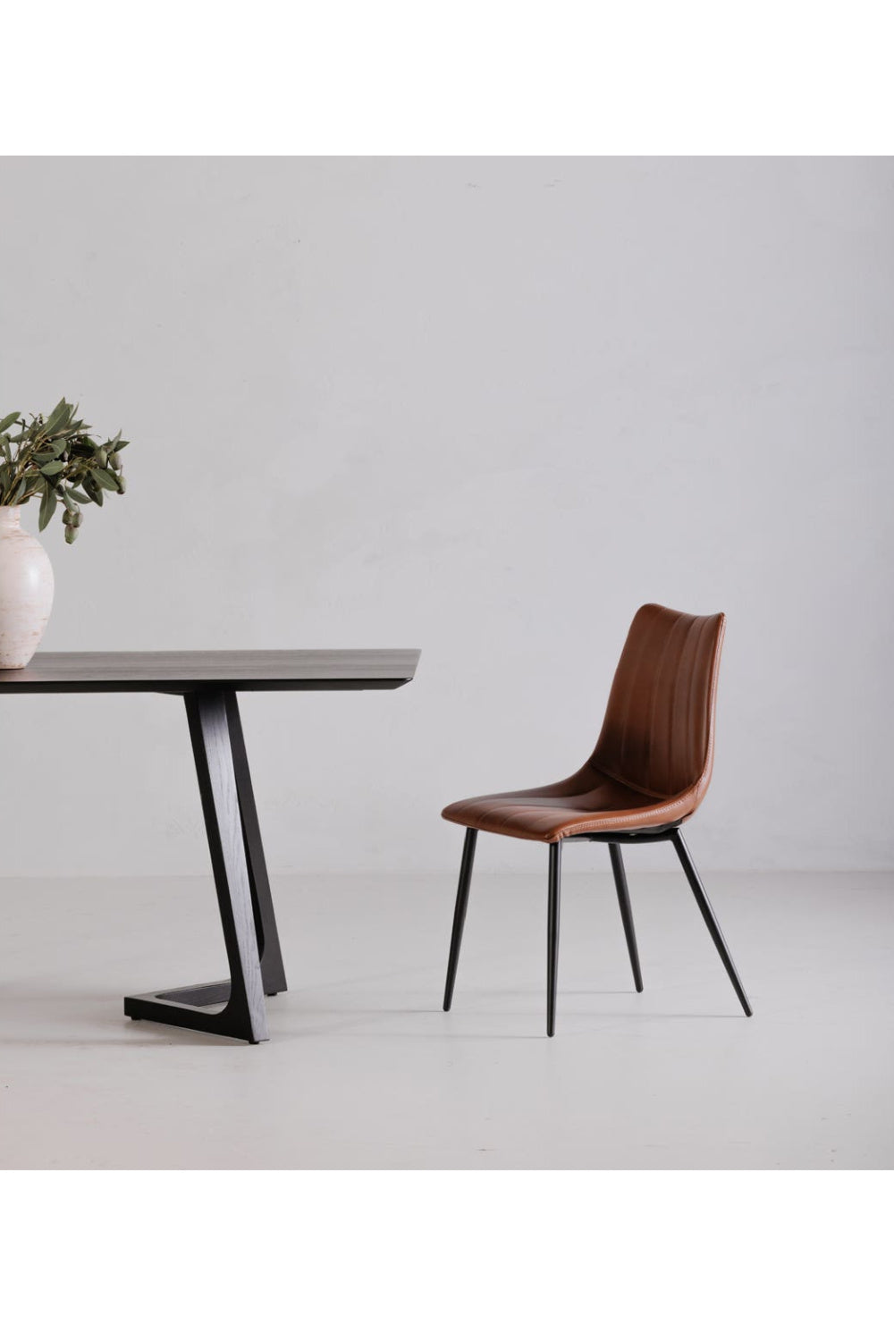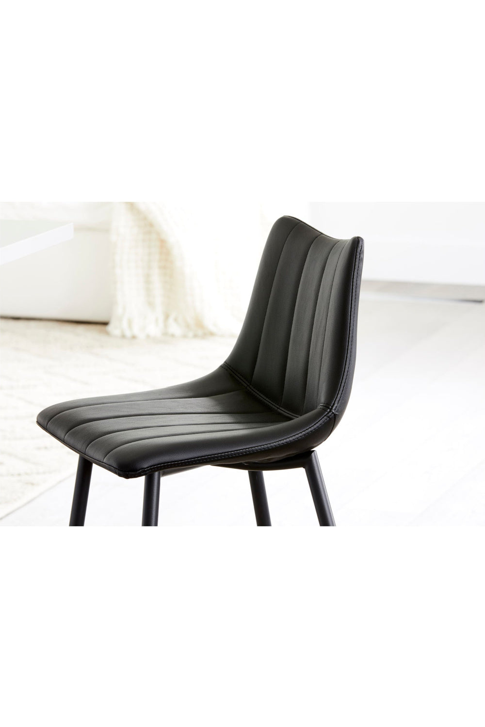 A new take on contemporary dining. The Alibi dining chair’s sleek modern aesthetic features striking vertical accent stitching, adding subtle detail to its simple and elegant design. An easy-to-clean soft vegan leather seat is perfectly shaped for comfort, so guests and hosts alike can relax after the digestif is served.