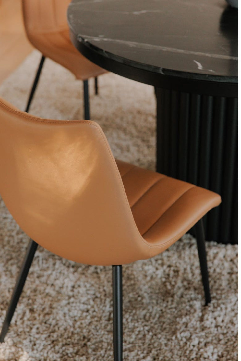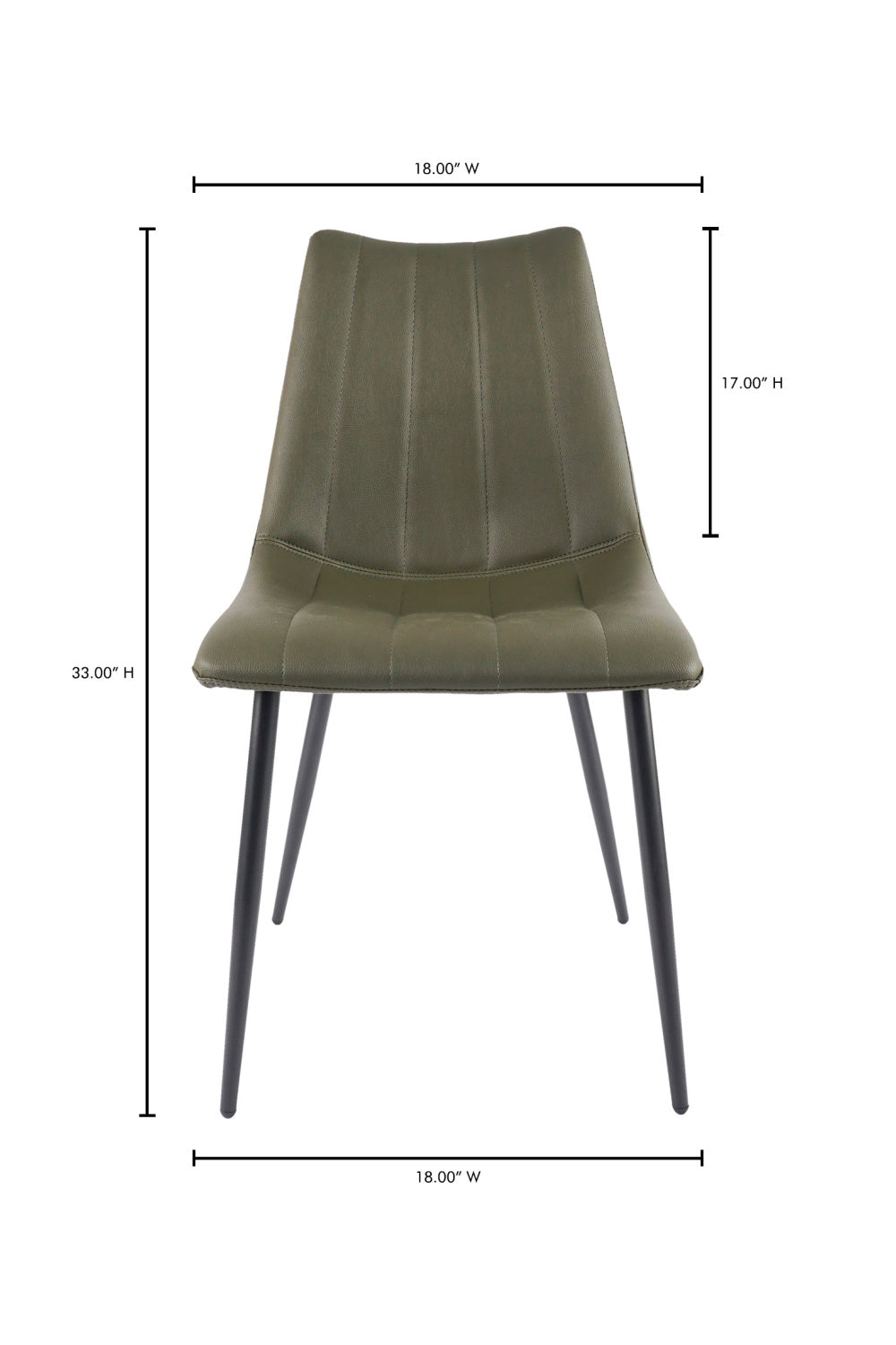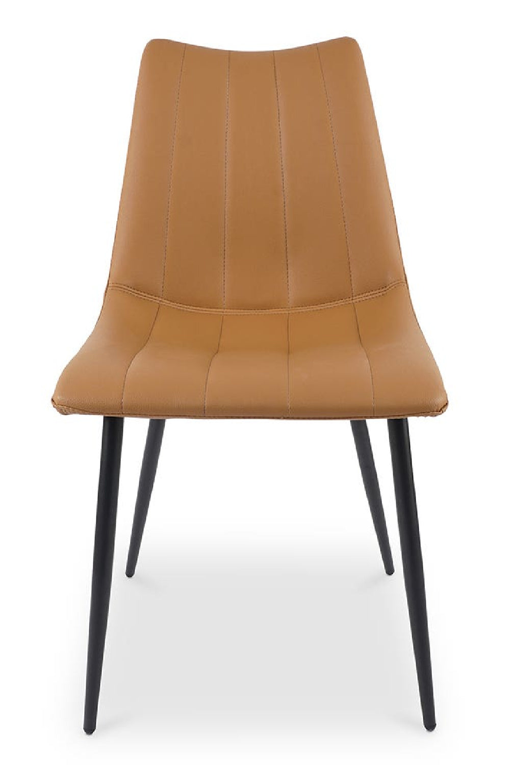 A new take on contemporary dining. The Alibi dining chair’s sleek modern aesthetic features striking vertical accent stitching, adding subtle detail to its simple and elegant design. An easy-to-clean soft vegan leather seat is perfectly shaped for comfort, so guests and hosts alike can relax after the digestif is served.