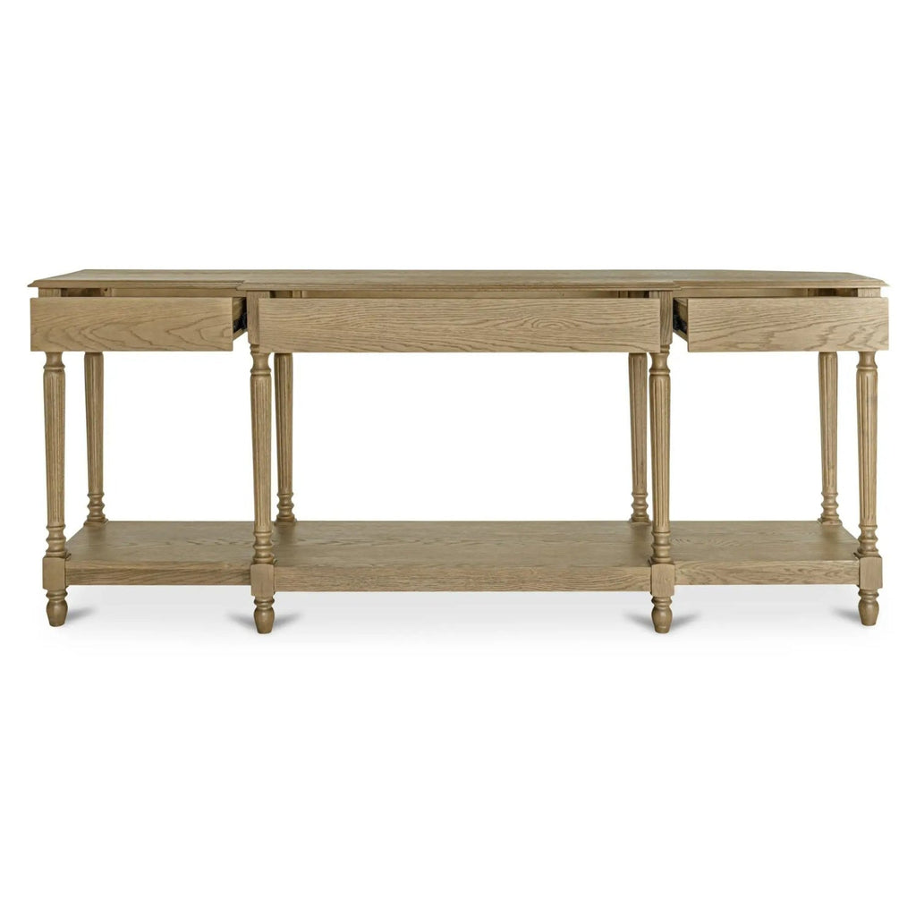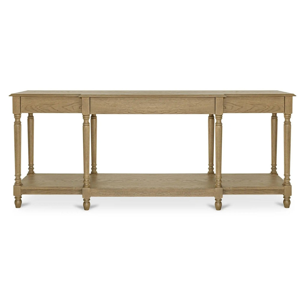 Meticulously crafted from solid oak with a rich brown finish, the Martha console table's graceful silhouette features an alluring overhang and expertly turned legs. A subtly protruding middle drawer adds dimensional intrigue, while three drawers and an open shelf offer discreet storage.