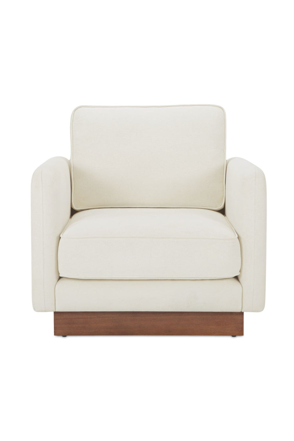 The Vernon accent chair blends mid-century design with modern functionality. It features a wooden plinth base for an elevated, lighter appearance. This chair offers unmatched comfort with removable cushions. Upholstered in durable, OEKO-TEX and Green Guard-certified fabric, it is ideal for family living, combining everyday practicality with durability.