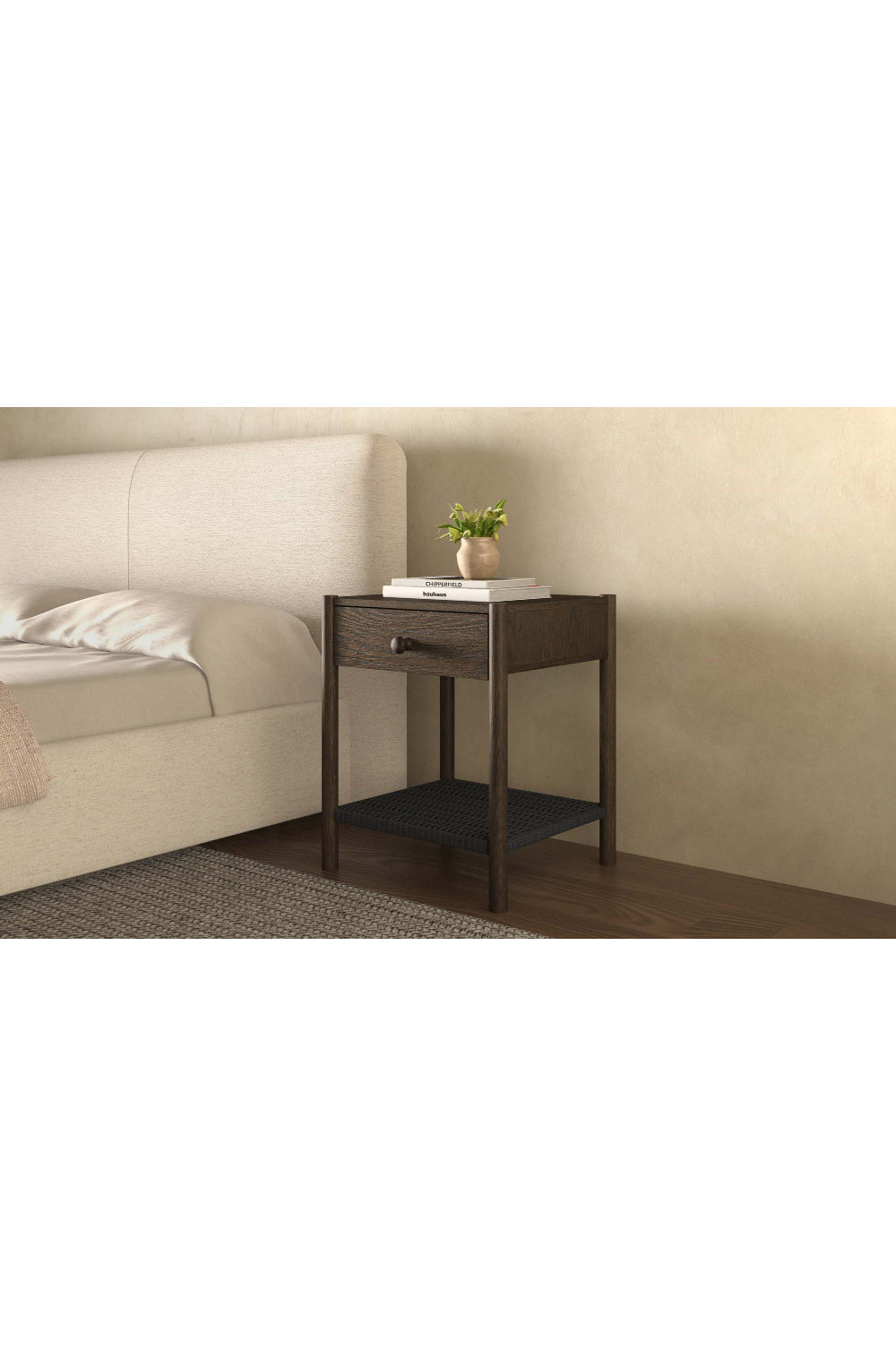 The Millie nightstand embodies understated elegance, harmoniously blending simplicity with sophistication. Artfully woven paper rope adorns its clean silhouette, introducing a captivating texture. A single drawer with soft-close glides and an open shelf below offer practical storage solutions. Supported by solid oak legs, this piece bridges quiet luxury with timeless appeal.