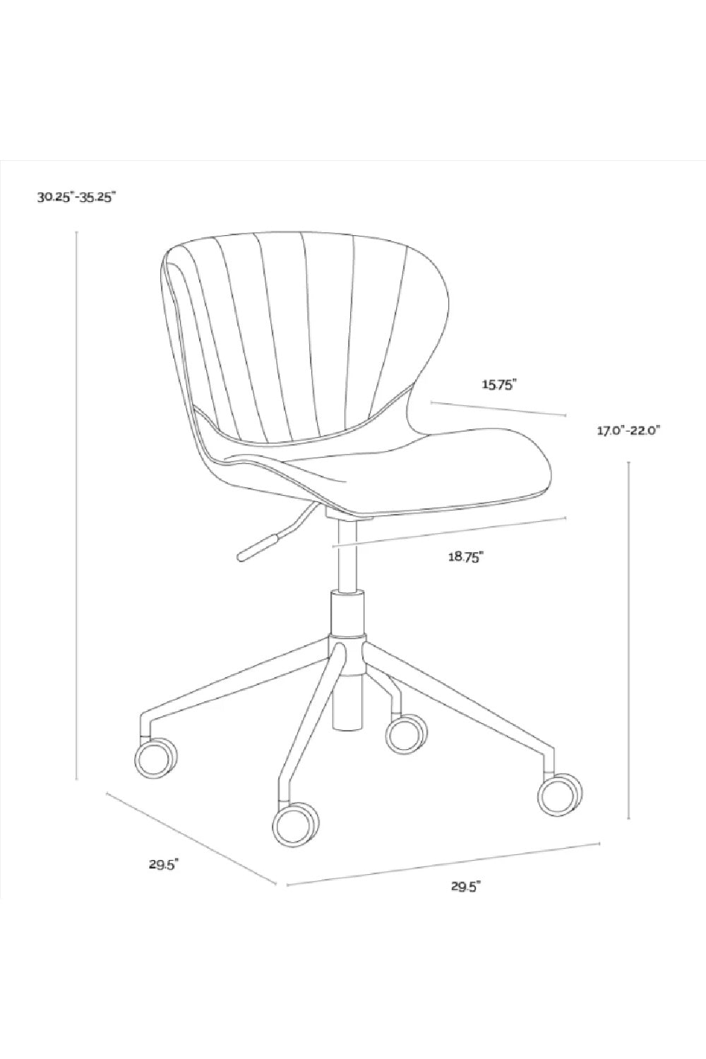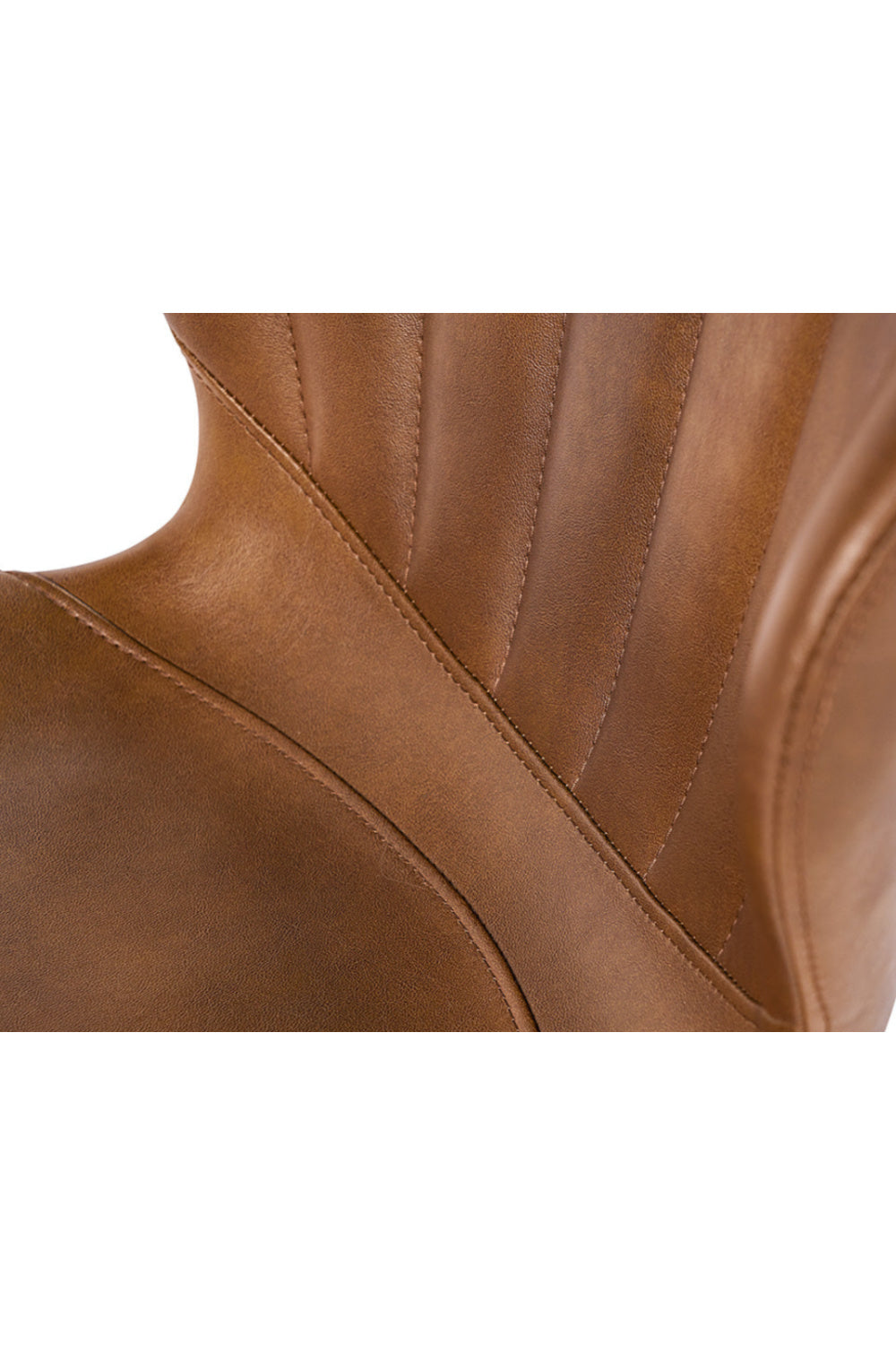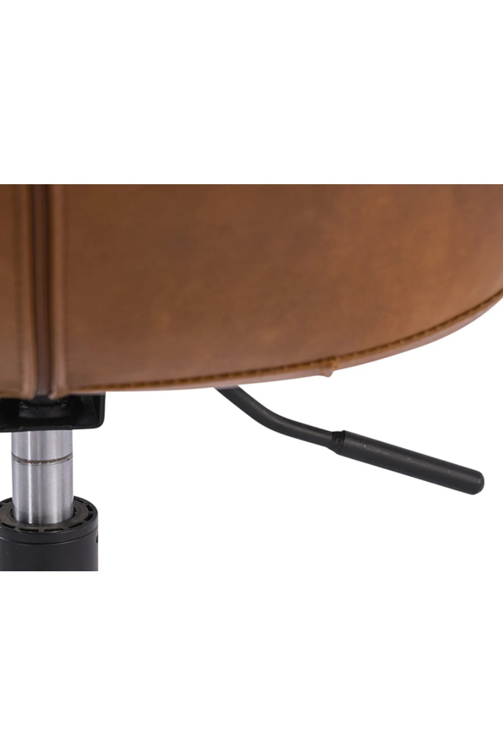 This swivel office chair is designed with charming yet sleek elements to offer an intriguing look for any office space. Features a clamshell seatback with channel tufting. Stocked in bravo cognac faux leather with black powder-coated iron legs. Castors allow for easy mobility. Handle With Care: This design has been crafted with faux leather. Faux leather is manufactured to reflect the natural characteristics of leather; as such, color variations, markings wrinkles, grooves, and light scratches are appreciated characteristics. No two pieces will be alike. Visit our Product Care page for more information on how to ensure the lasting beauty of this piece.