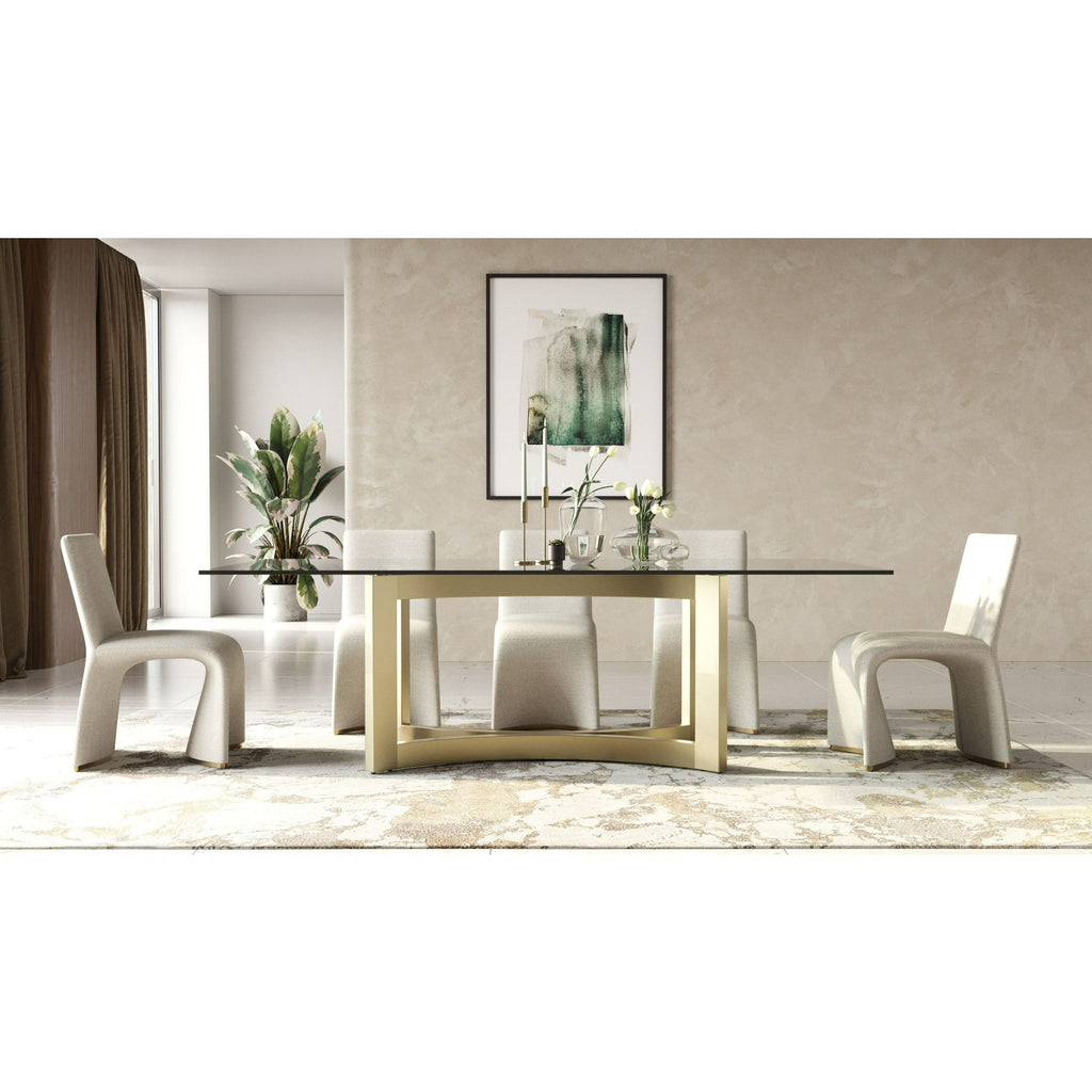 The Modrest Mingus Modern Rectangular Dining Table exudes sophistication and contemporary flair with its exquisite pairing of a clear glass top and a sculptural brushed brass base. The gleaming glass surface appears to float, offering a visual lightness that contrasts beautifully with the bold strength of its base. This masterpiece becomes a striking centerpiece, blending modern luxury with timeless elegance. Transform your dining experience into a refined affair, making every gathering a celebration of style and design excellence.