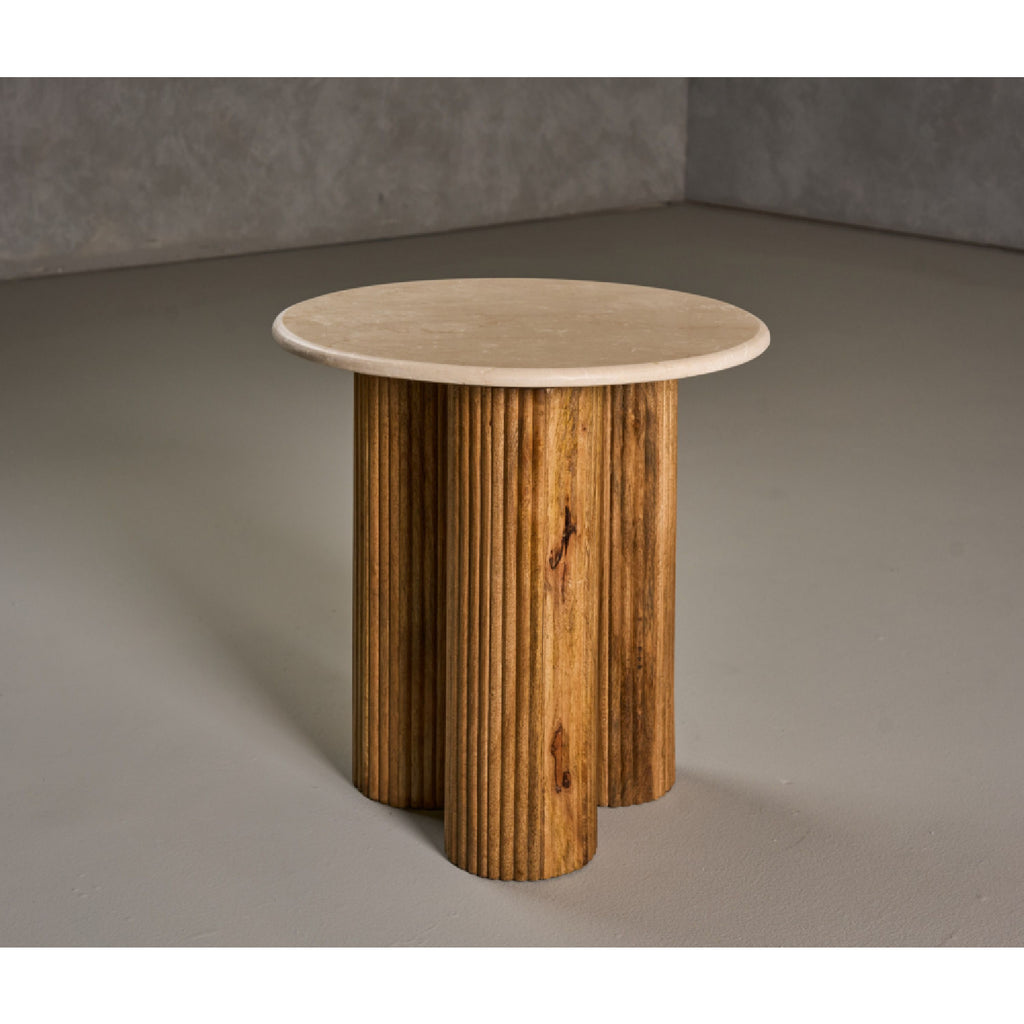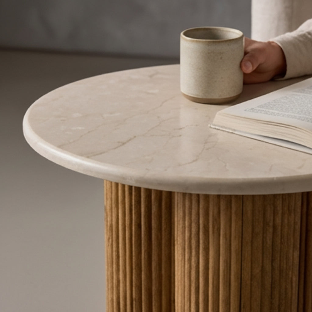 The Modrest Hayden Modern Marble + Wood Round End Table seamlessly blends contemporary elegance with natural elements. Its smooth marble top contrasts beautifully with the textured wooden base, characterized by vertical grooves that add depth and sophistication. This striking end table serves as a perfect accent piece, enhancing any living space with its stylish charm.