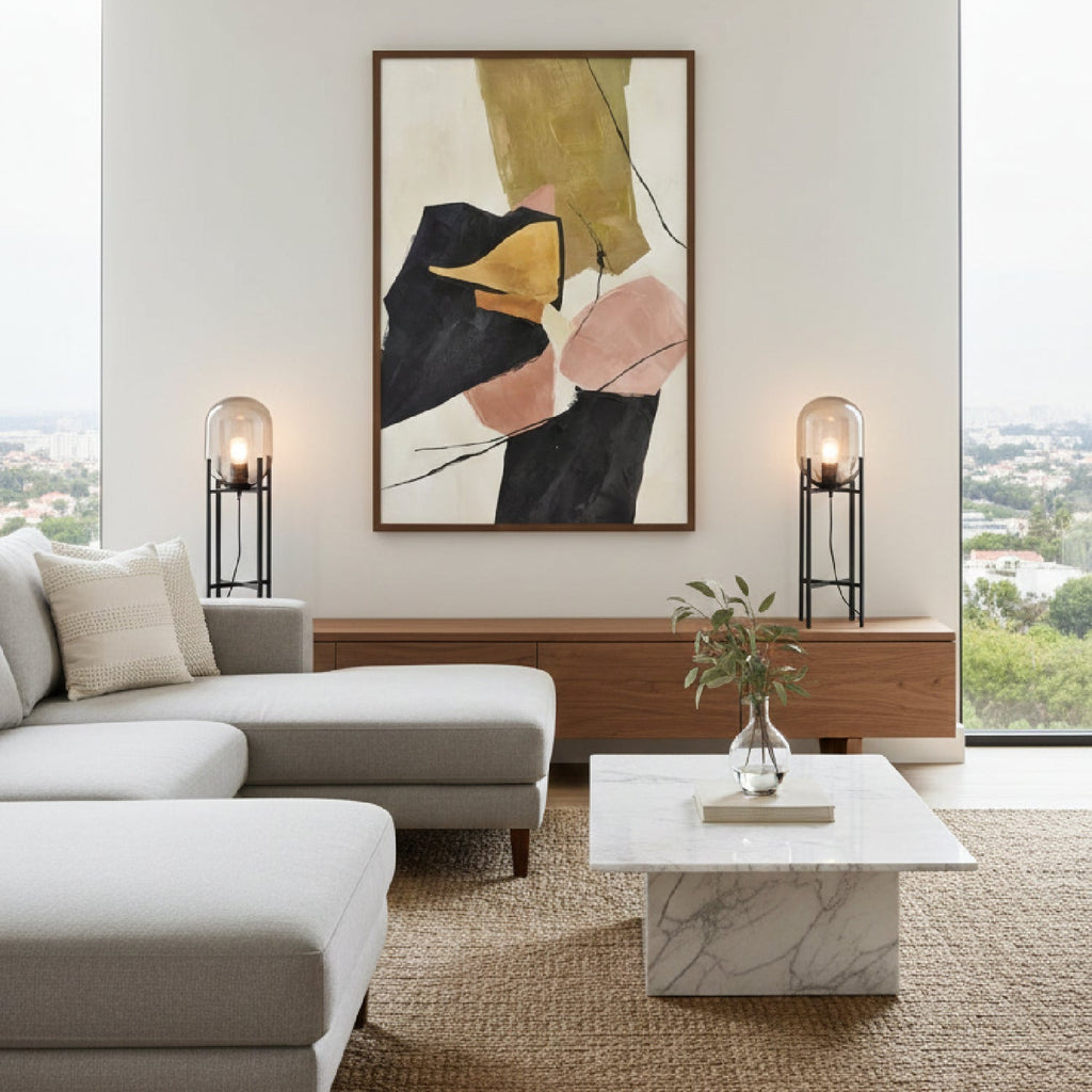 Inspired by the 60s, Anni's rich amber, dusty pink and soft olive tones underscore the playful abstract shapes that are grounded by the cream and black backdrop. The warm brown finish of the solid pine frame highlights the presentation with a vintage feel.