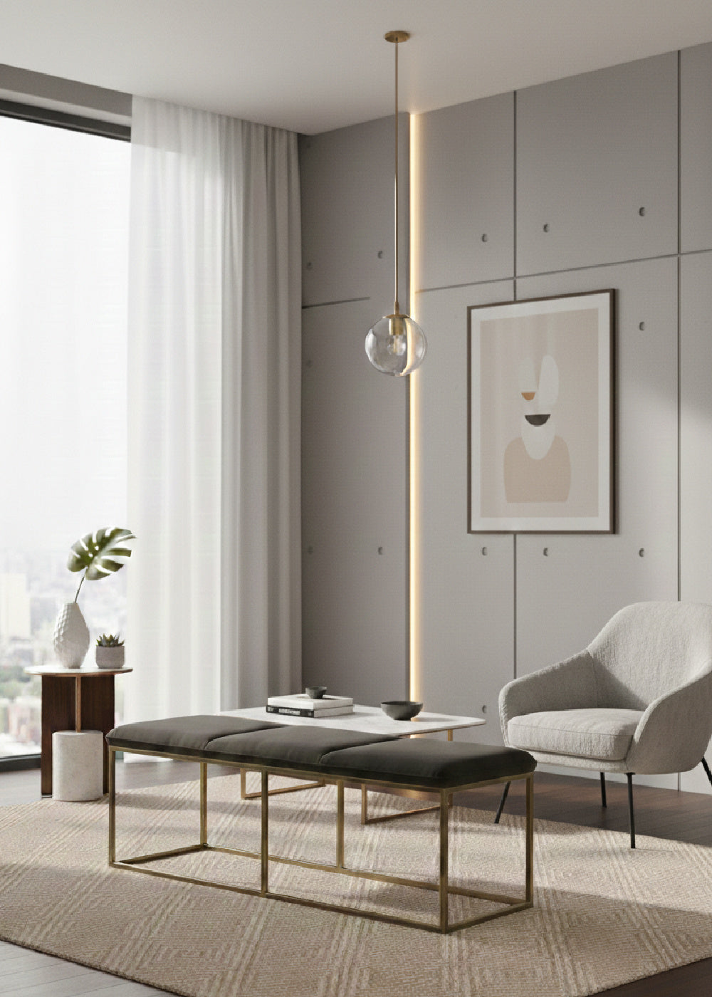 This bench combines transitional style with luxurious elements. Features an exposed rustic bronze steel frame and a piccolo pebble performance fabric seat. Performance fabric is moisture repellent, durable and easy to clean.