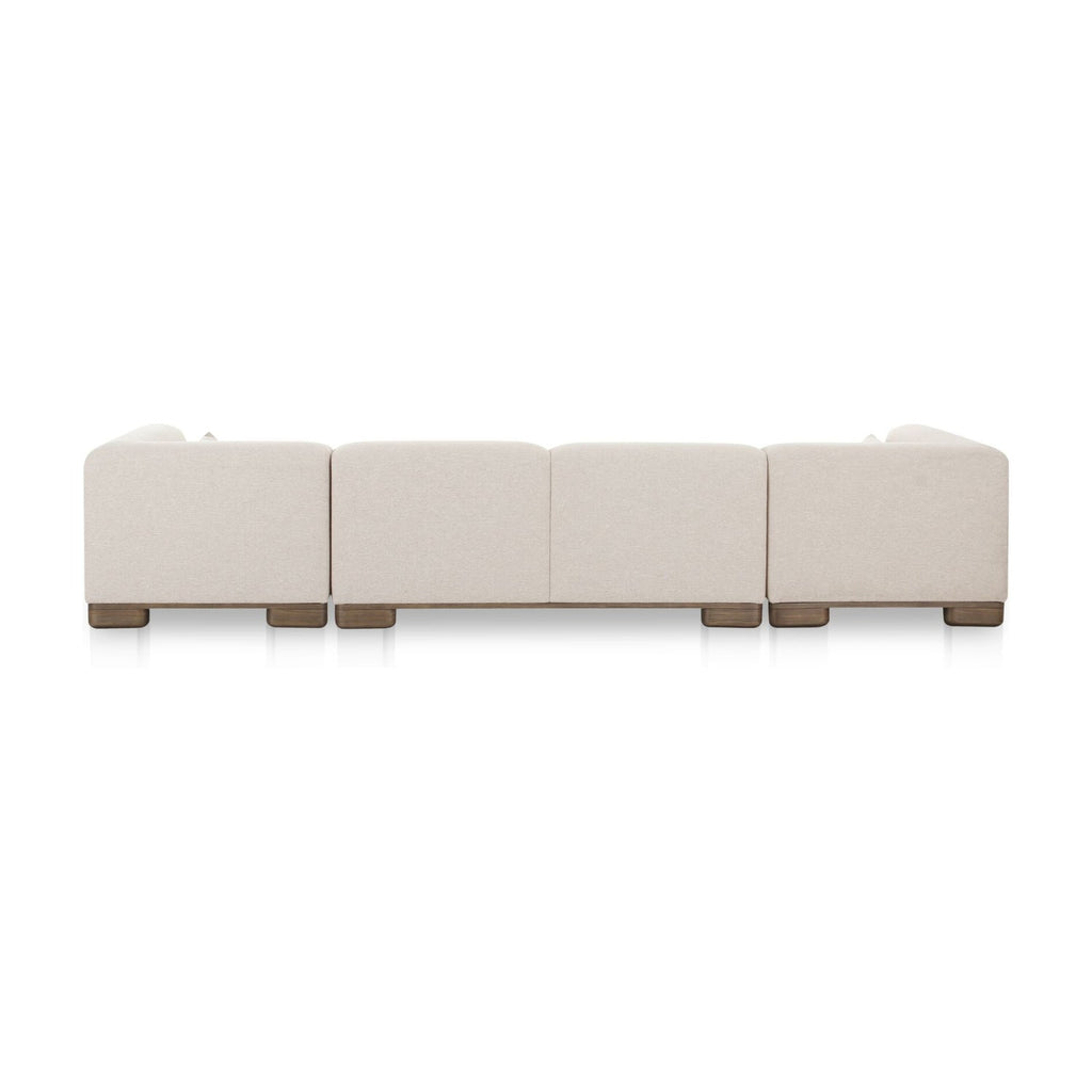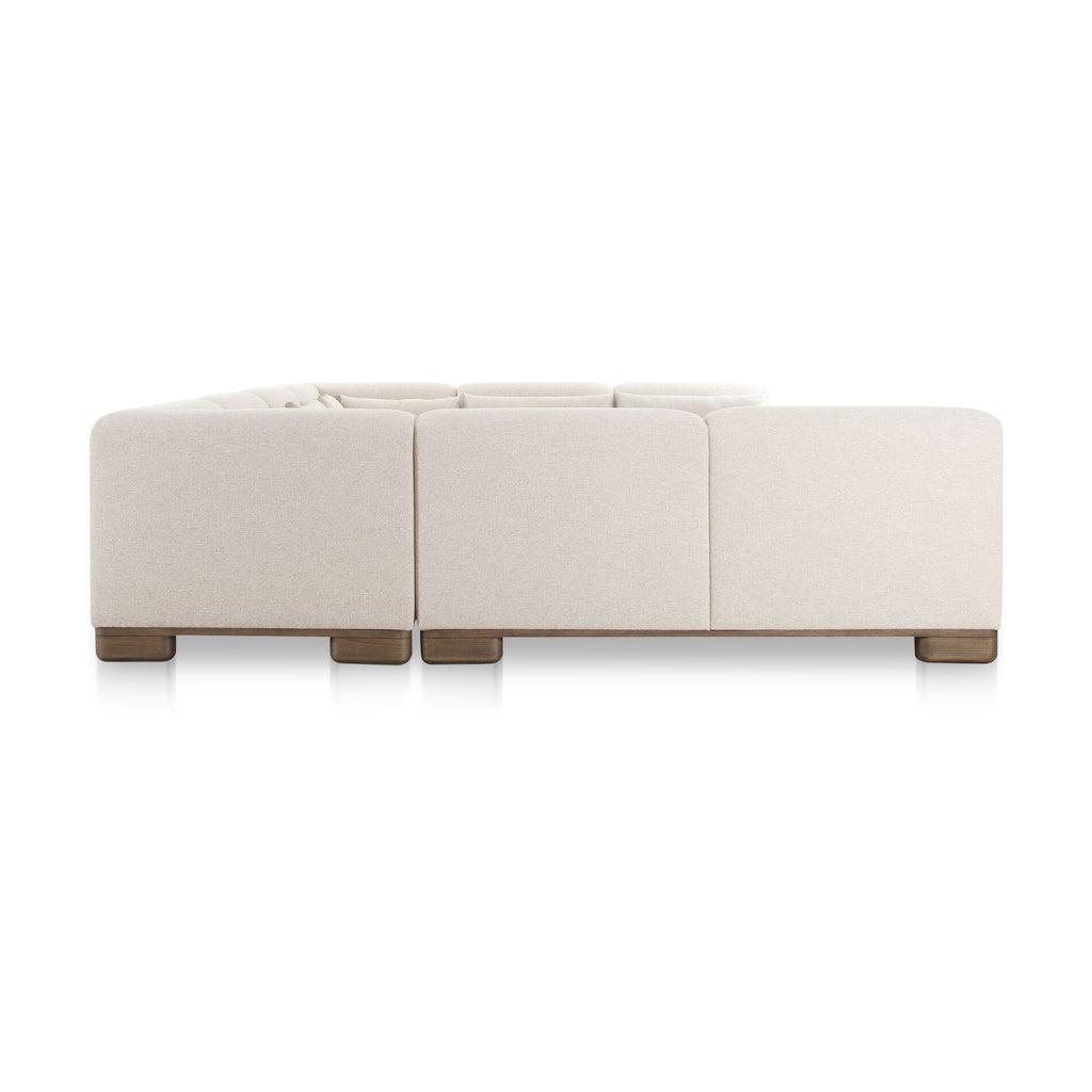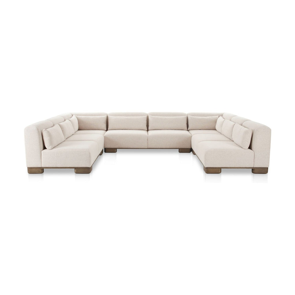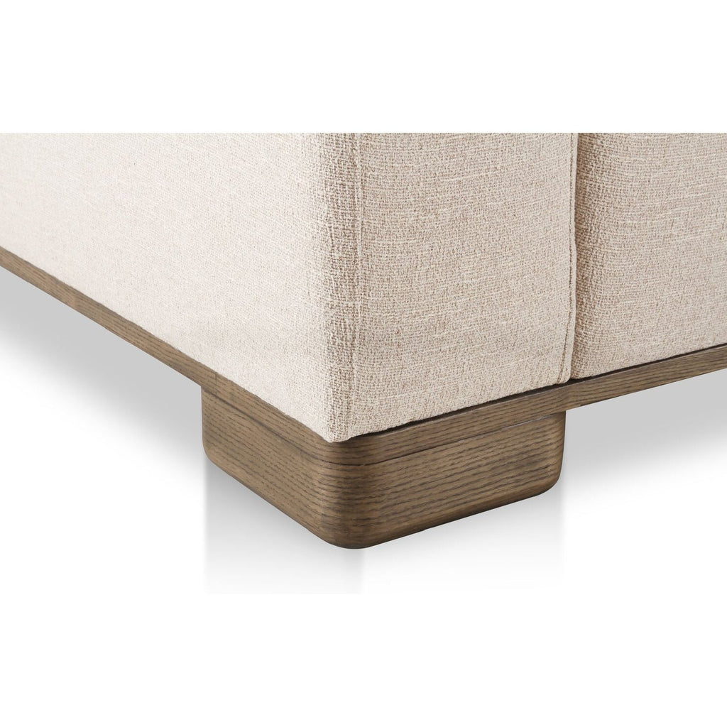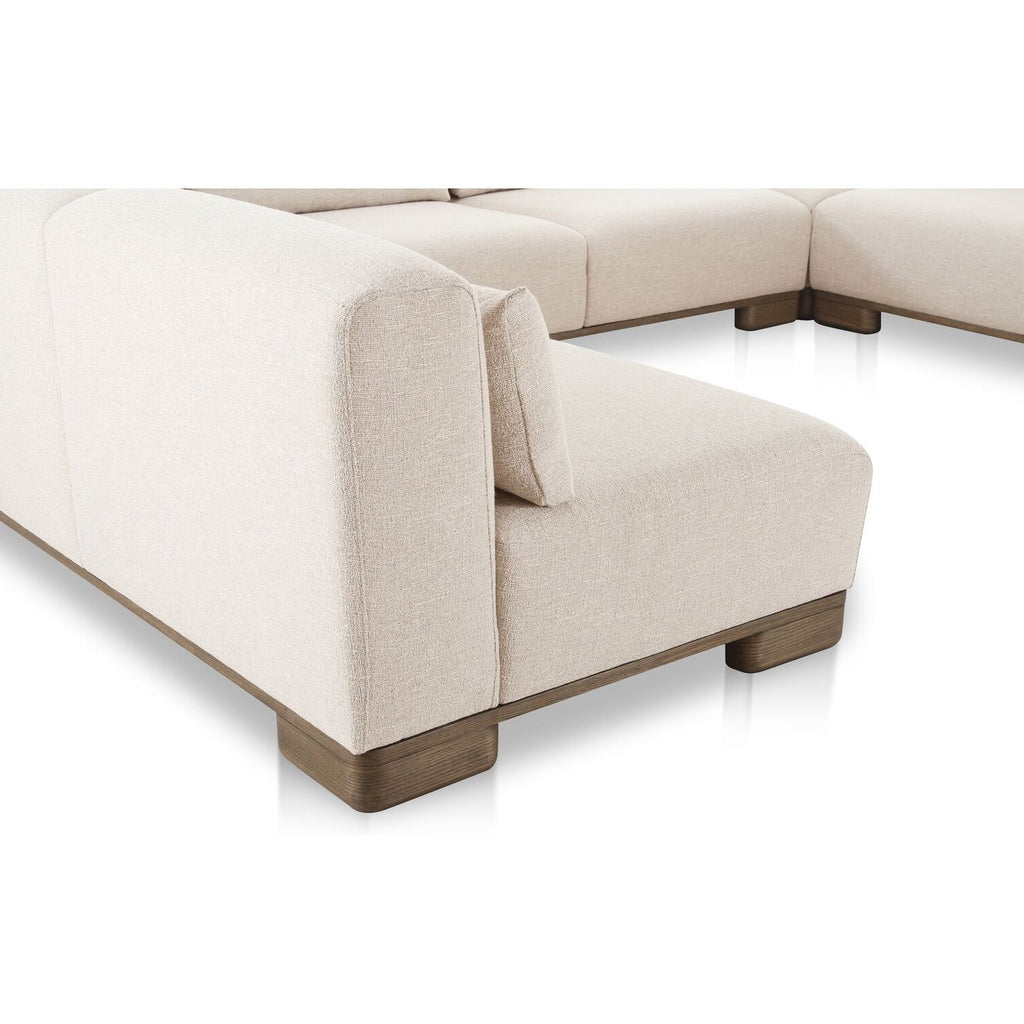 Designed with modular components that expertly function as standalone pieces or as part of modular configurations, the June collection is all about versatility. Wrapped in warm-toned, textured performance fabrics and elevated by oversized oak veneer legs, this piece combines everyday living and understated elegance. Built for ultimate relaxation — the plush feather and fiber fill, along with lumbar toss cushions, offer ultimate comfort. Consists of 5 modular parts: 3 slipper and 2 corner chairs for easy switch around.