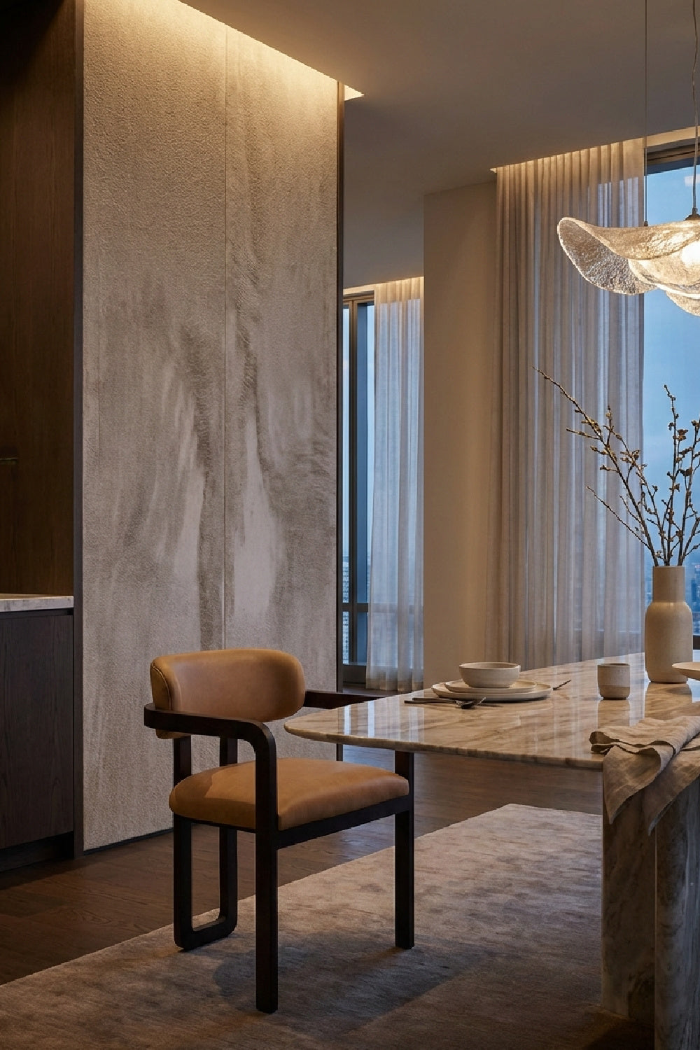 The eye-catching silhouette of the Madrone Dining Armchair will stun from all angles. The curved lines of the three-legged brown oak wood frame lend a statuesque presence to any room. The low back seat is upholstered in ludlow sesame leather for luxurious comfort.