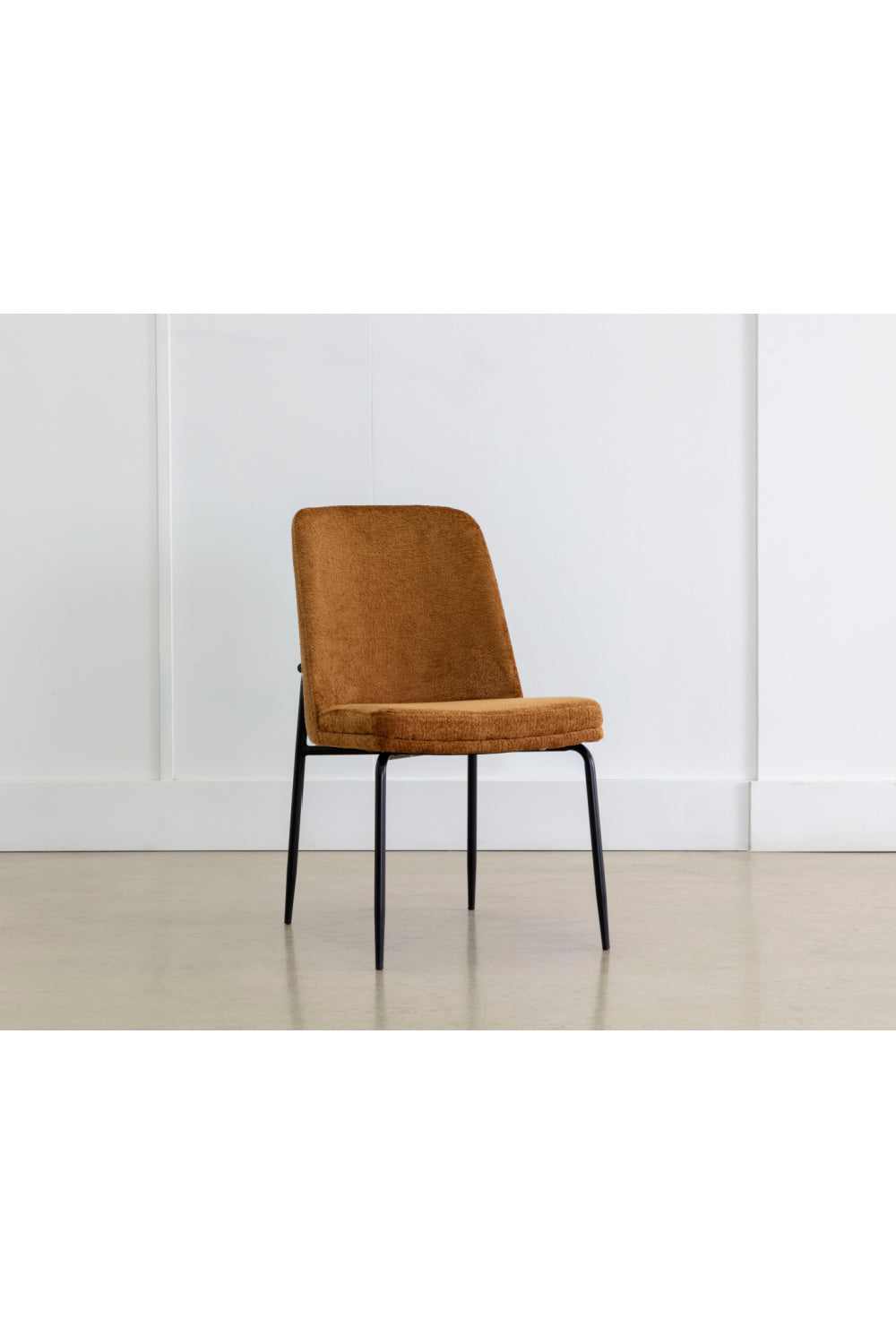 This stylish dining chair features a classic silhouette that provides comfortable seating in any modern living space. Features a matte black powder-coated steel frame and curved backrest. Stocked in bergen marmalade fabric.