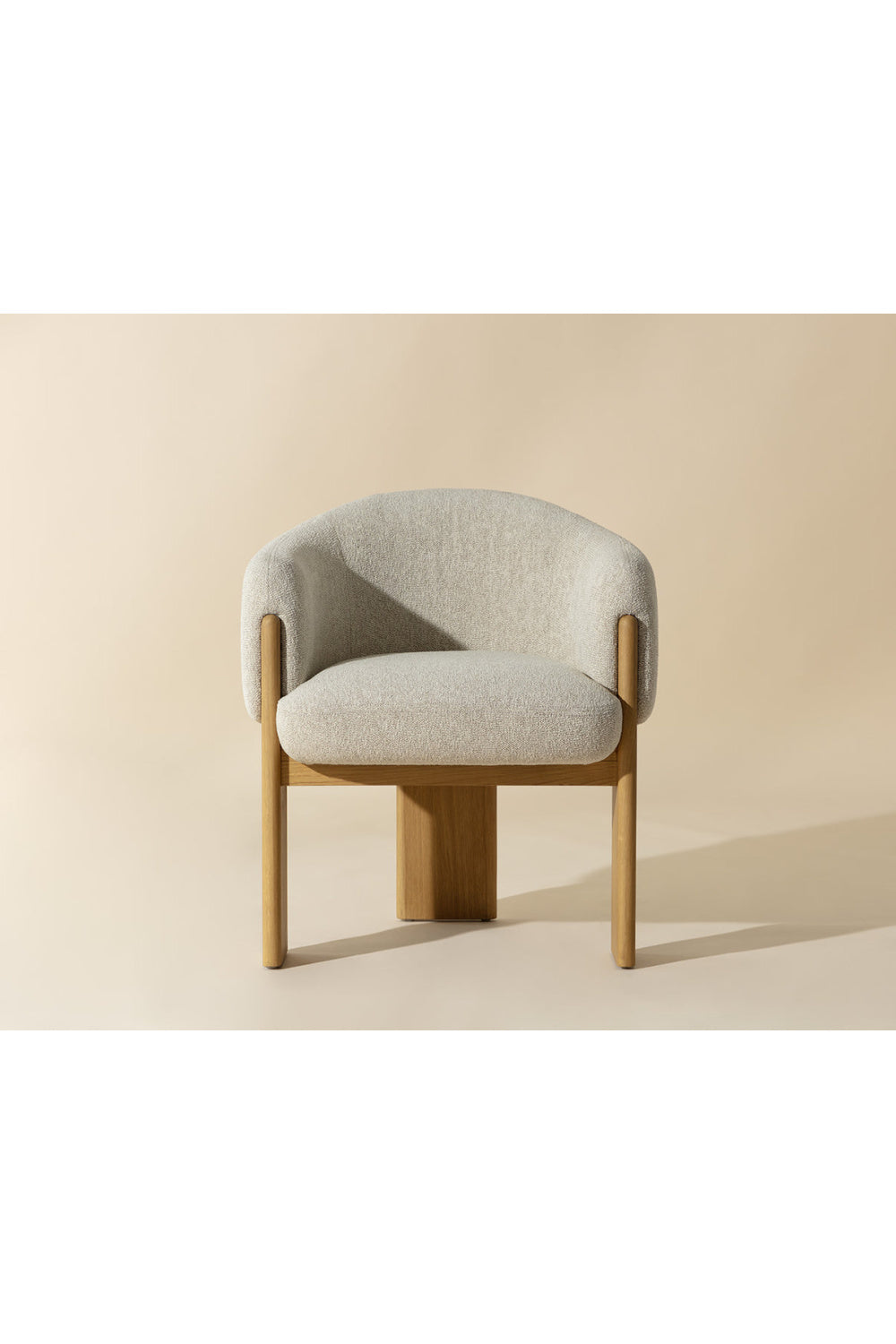 Embrace the luxurious comfort of the uniquely shaped Trine Dining Armchair. Generously padded and upholstered in our stylish dove cream fabric, this piece will complement any home aesthetic. Completed with a rustic oak wood base with a cerused finish on the legs.