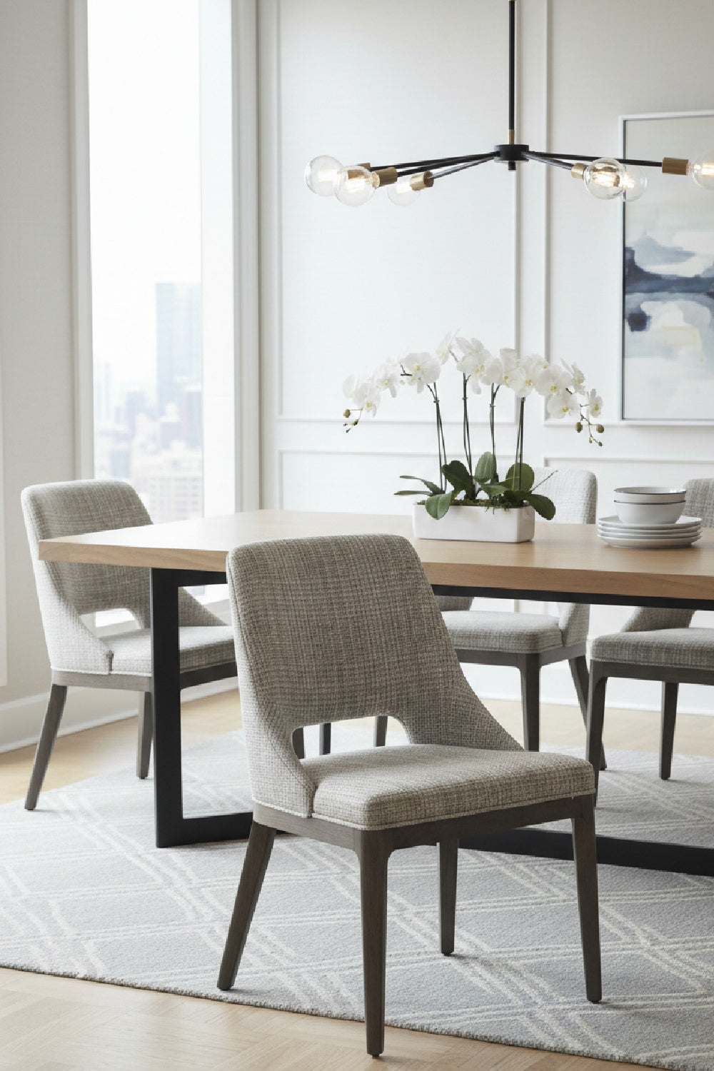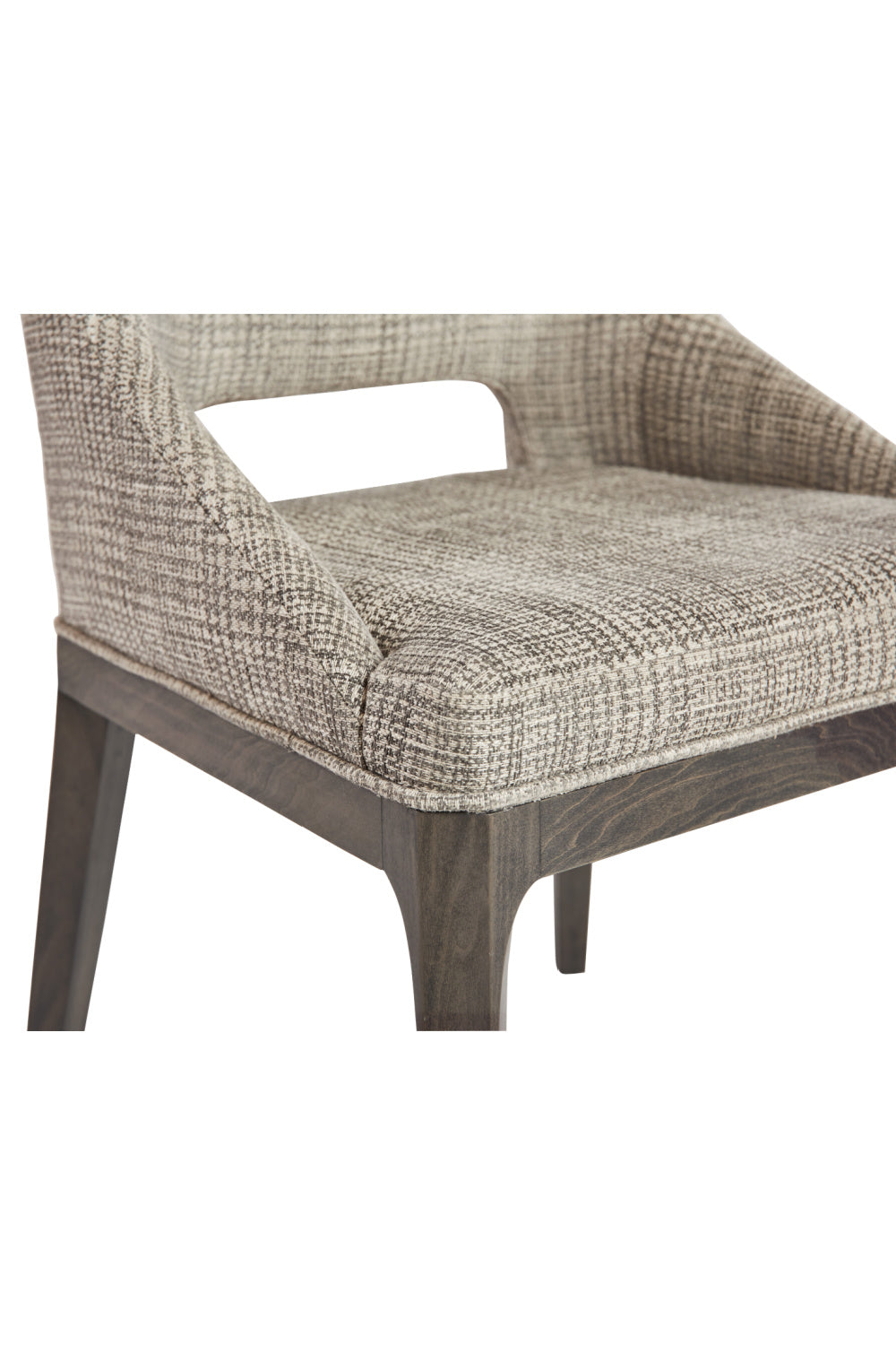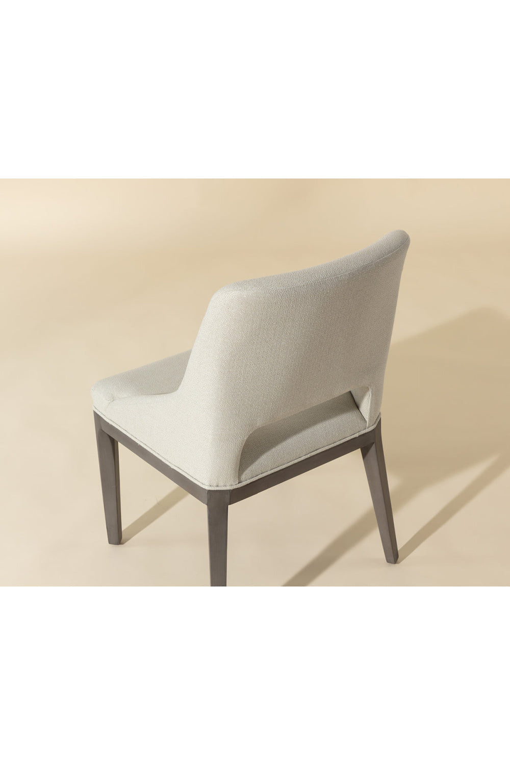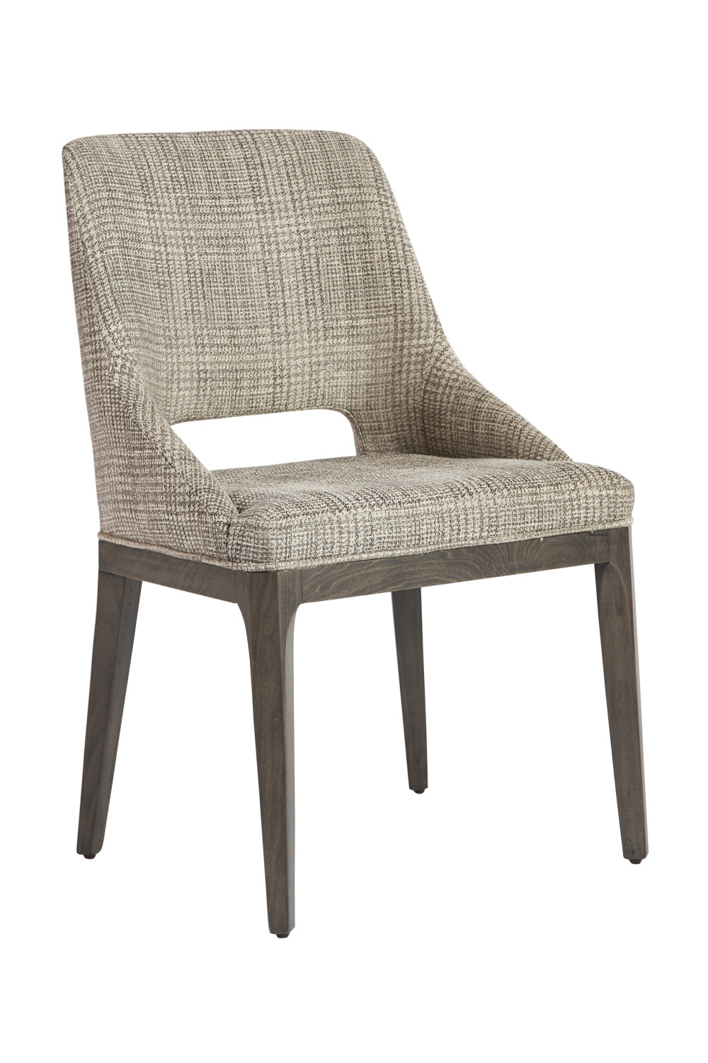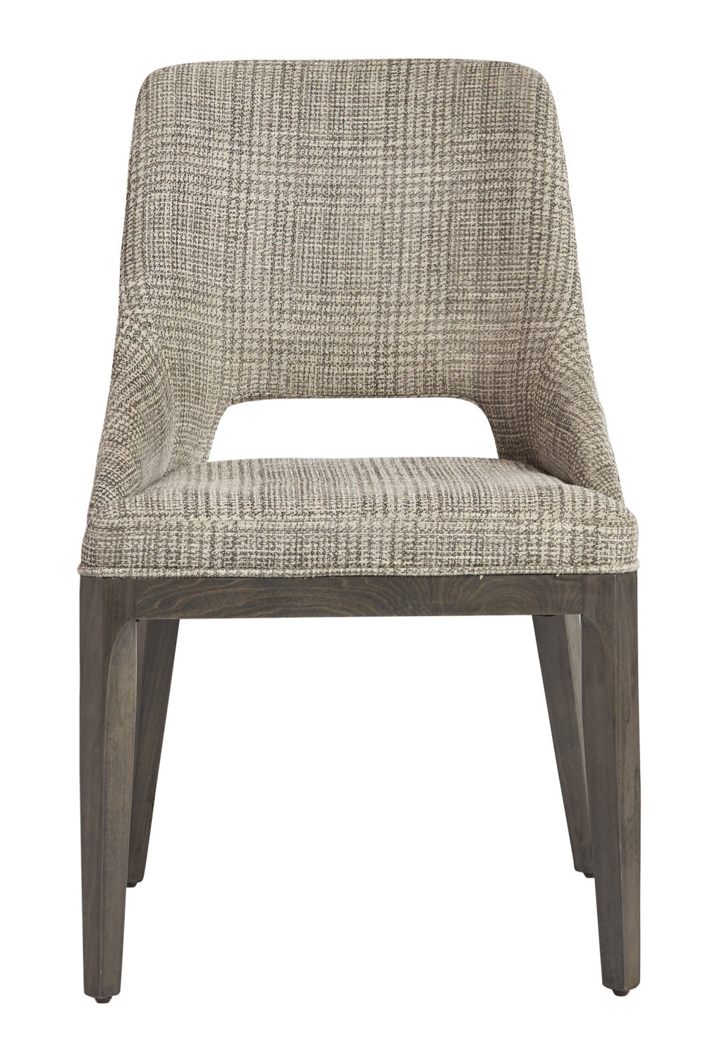 Dine in style and comfort in this fabulous dining chair that features a tasteful cutout in the seatback. Completed with fabric upholstery and features solid poplar wood legs in a light gray oak finish. As wood is an organic, porous material, these pieces will contain natural variation of texture and may also exhibit fine indentations and cracks. Wood pieces will also display a disparity of color and grain, and visible knots and burls that add to the character of each piece.