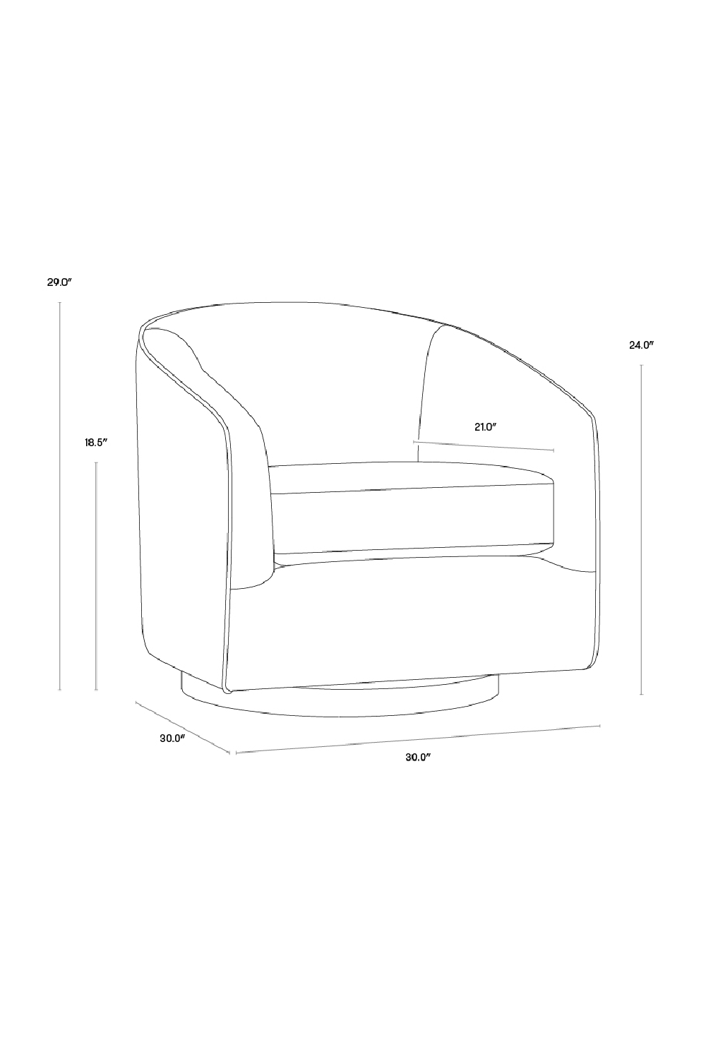 A stylish and comfortable swivel chair perfect for living, lounge and office spaces. Features a barrel back design upholstered in gold sky fabric. Completed with a dark bronze stainless steel round base with 360 degree swivel. Also available in blush, burgundy, deep green, black and navy sky velvet fabrics with a brushed antique brass base.