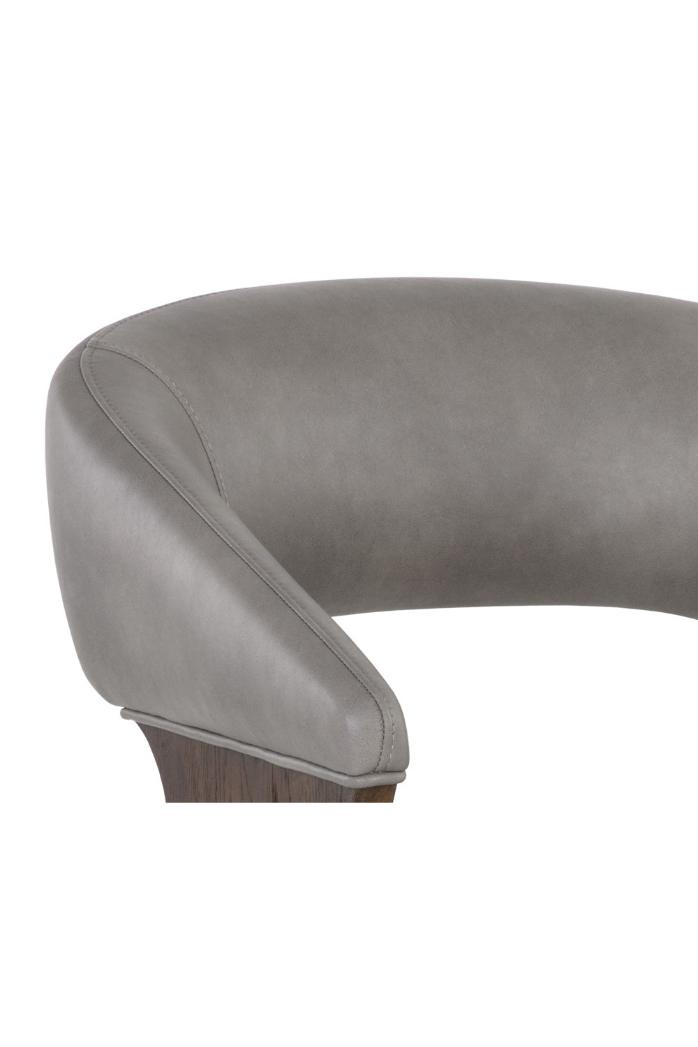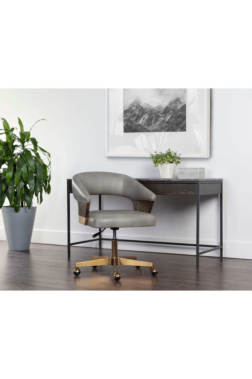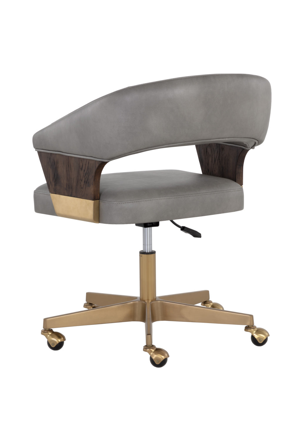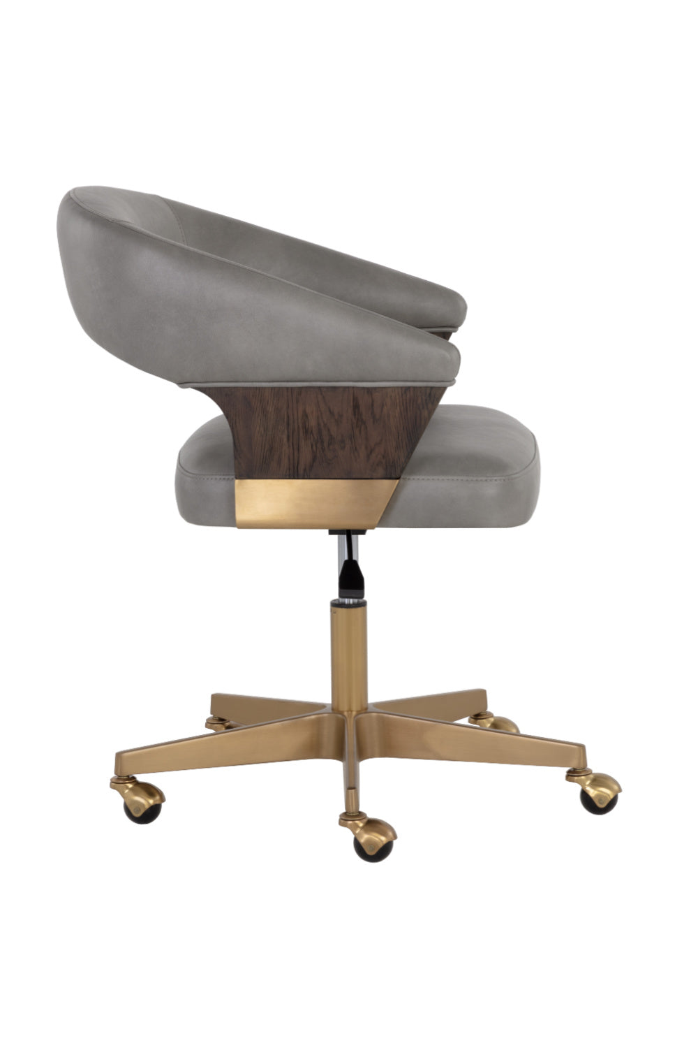 Reinvigorate any workspace with this office chair that is reminiscent of mid-century and contemporary designs. Stocked in bravo metal faux leather with a curved backrest and a stylish cutout. Features a dark walnut veneer on the arms. Completed with a matte gold powder-coated stainless steel base and castors. Handle With Care: This design has been crafted with faux leather. Faux leather is manufactured to reflect the natural characteristics of leather; as such, color variations, markings wrinkles, grooves, and light scratches are appreciated characteristics. No two pieces will be alike. Visit our Product Care page for more information on how to ensure the lasting beauty of this piece.