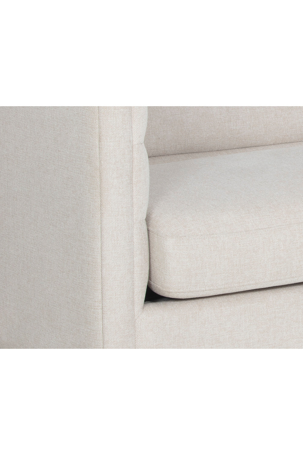 This stunning sofa offers a streamlined design for contemporary elegance. Stocked in Belfast oatmeal fabric with horizontal tufting on the interior seatback. Completed with an antique brass stainless steel base.