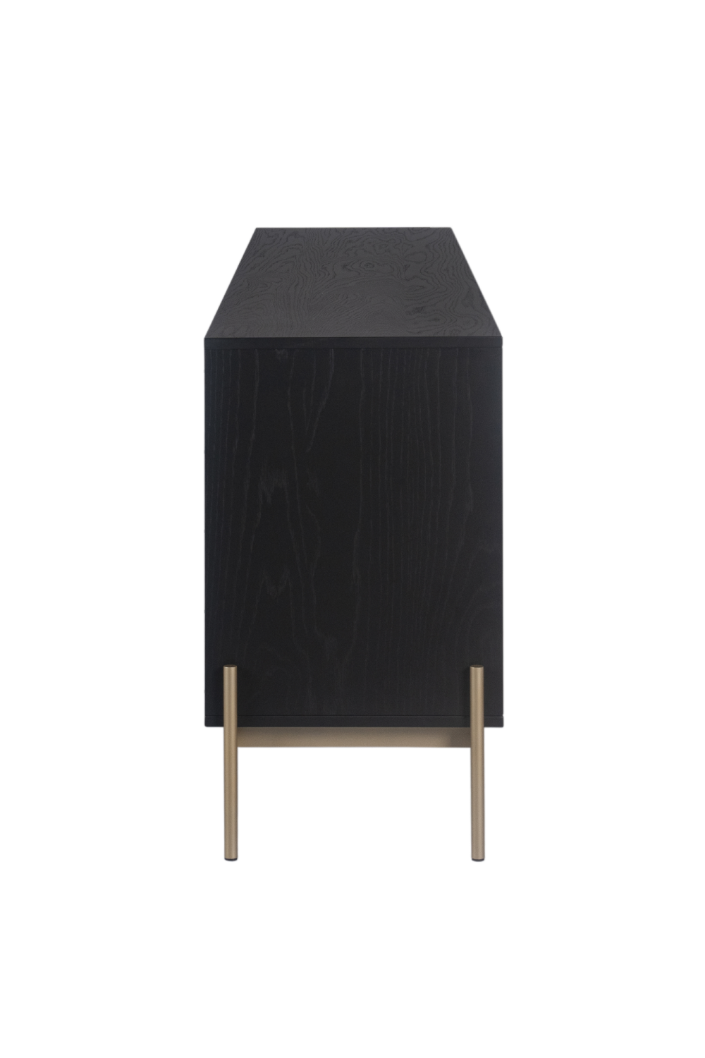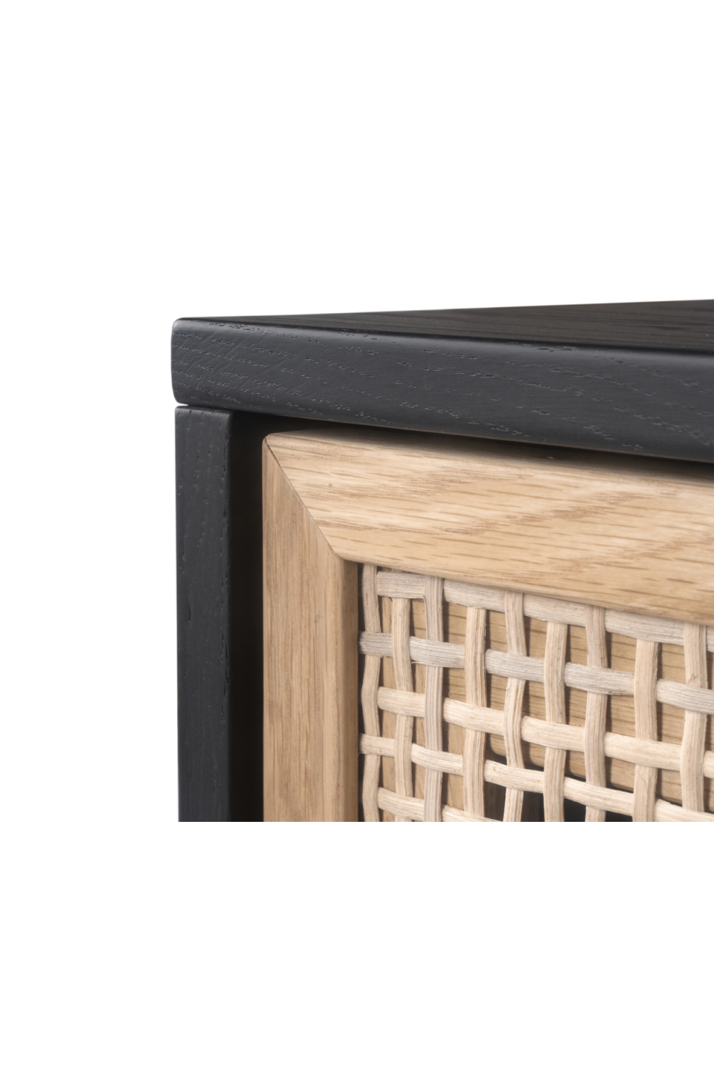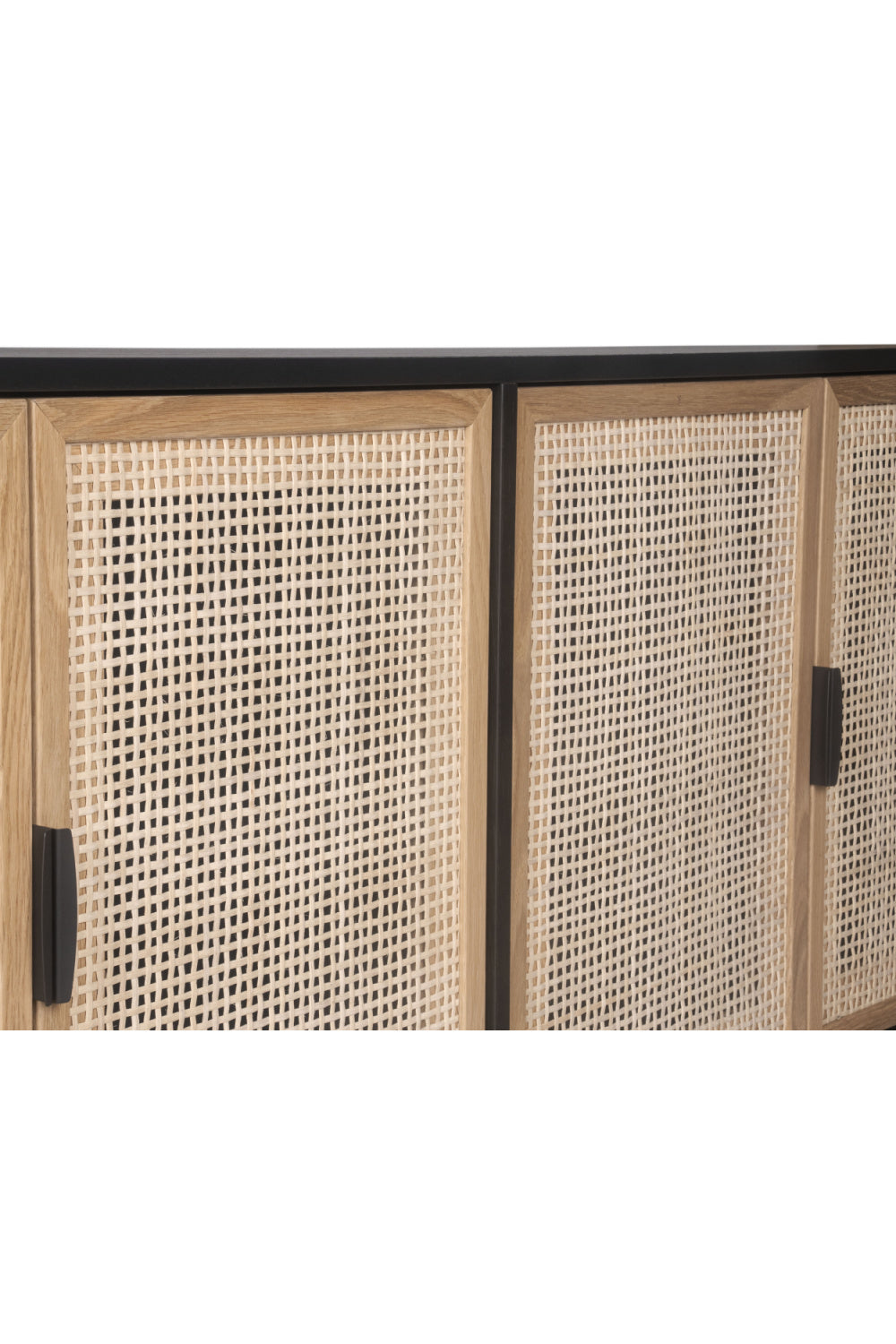 Create a space influenced by global travels with this stylish sideboard crafted in Indonesia. Features four natural rattan cabinets contrasted with a black oak wood frame. Gold iron feet and matte black steel handles complete the design.
