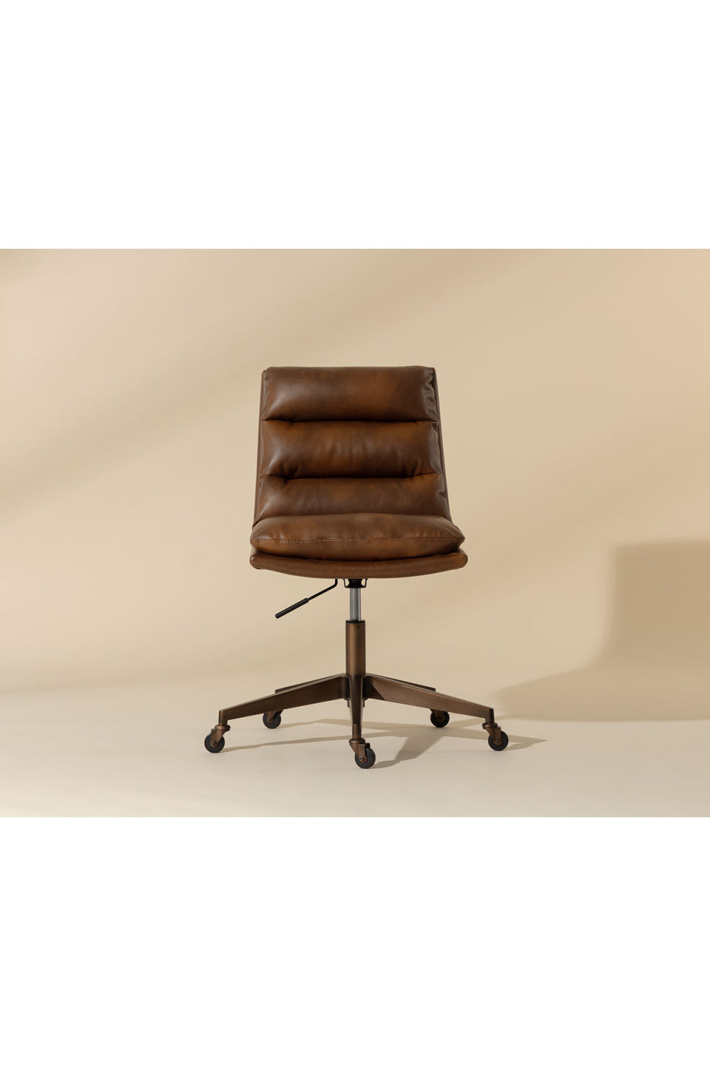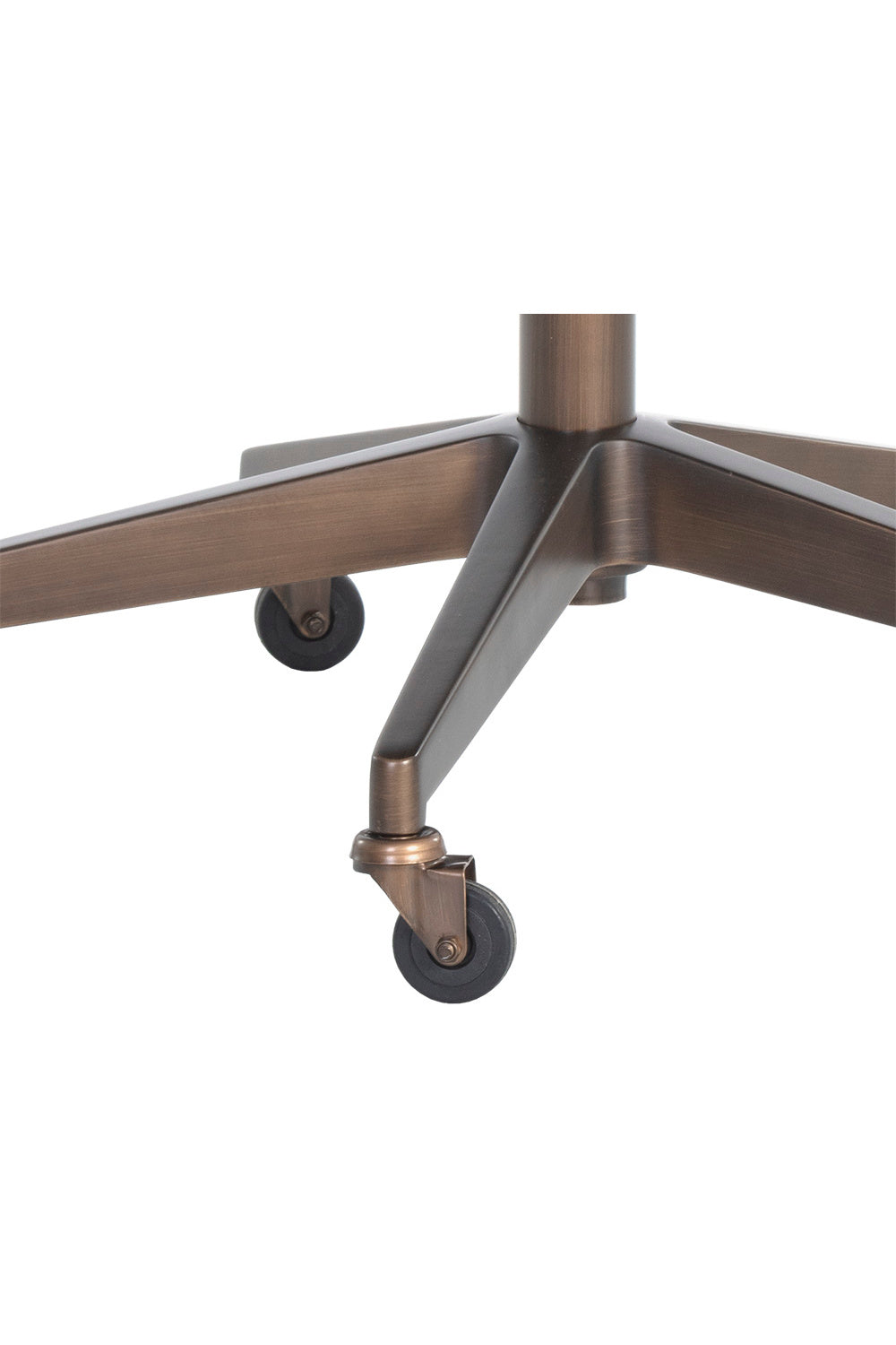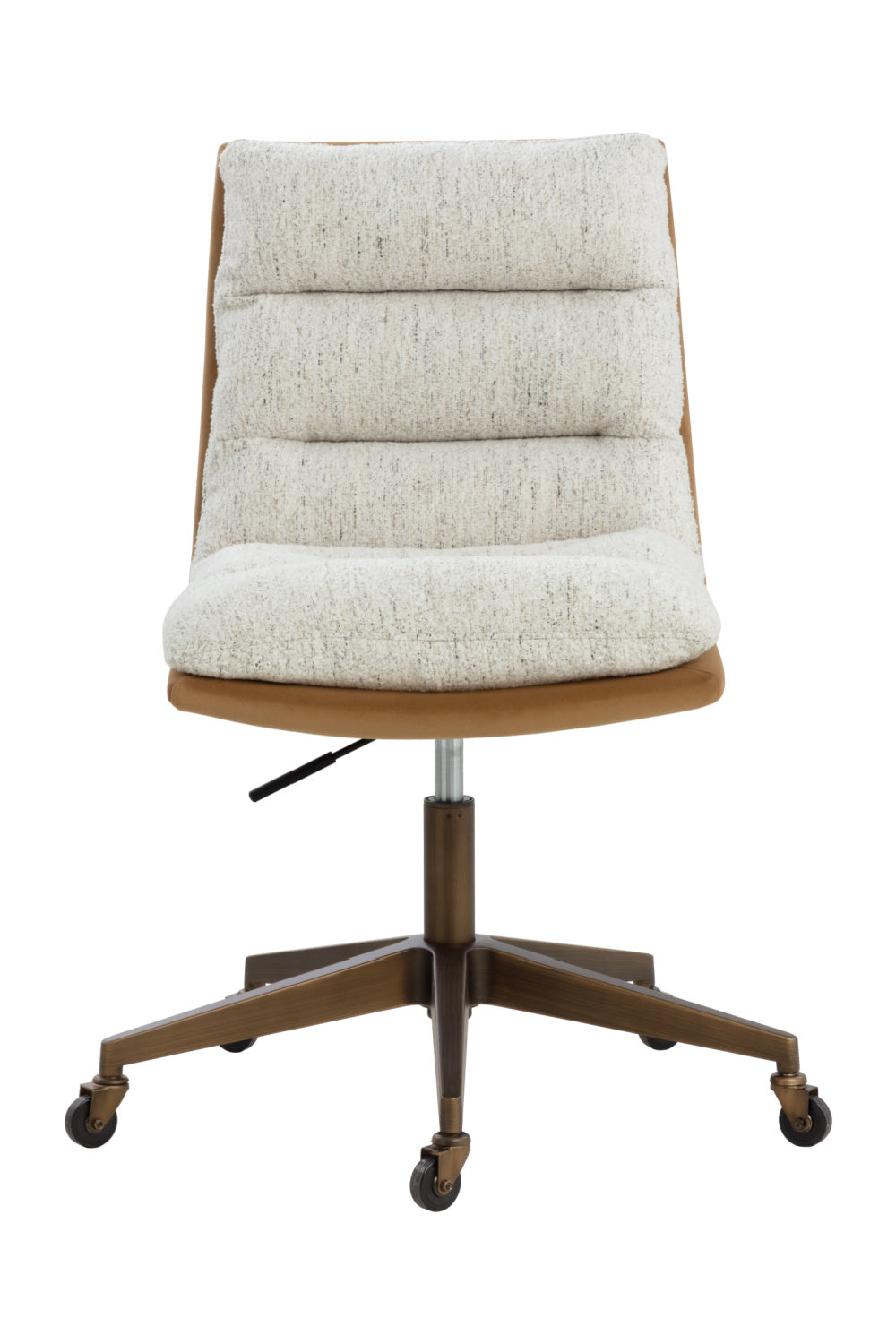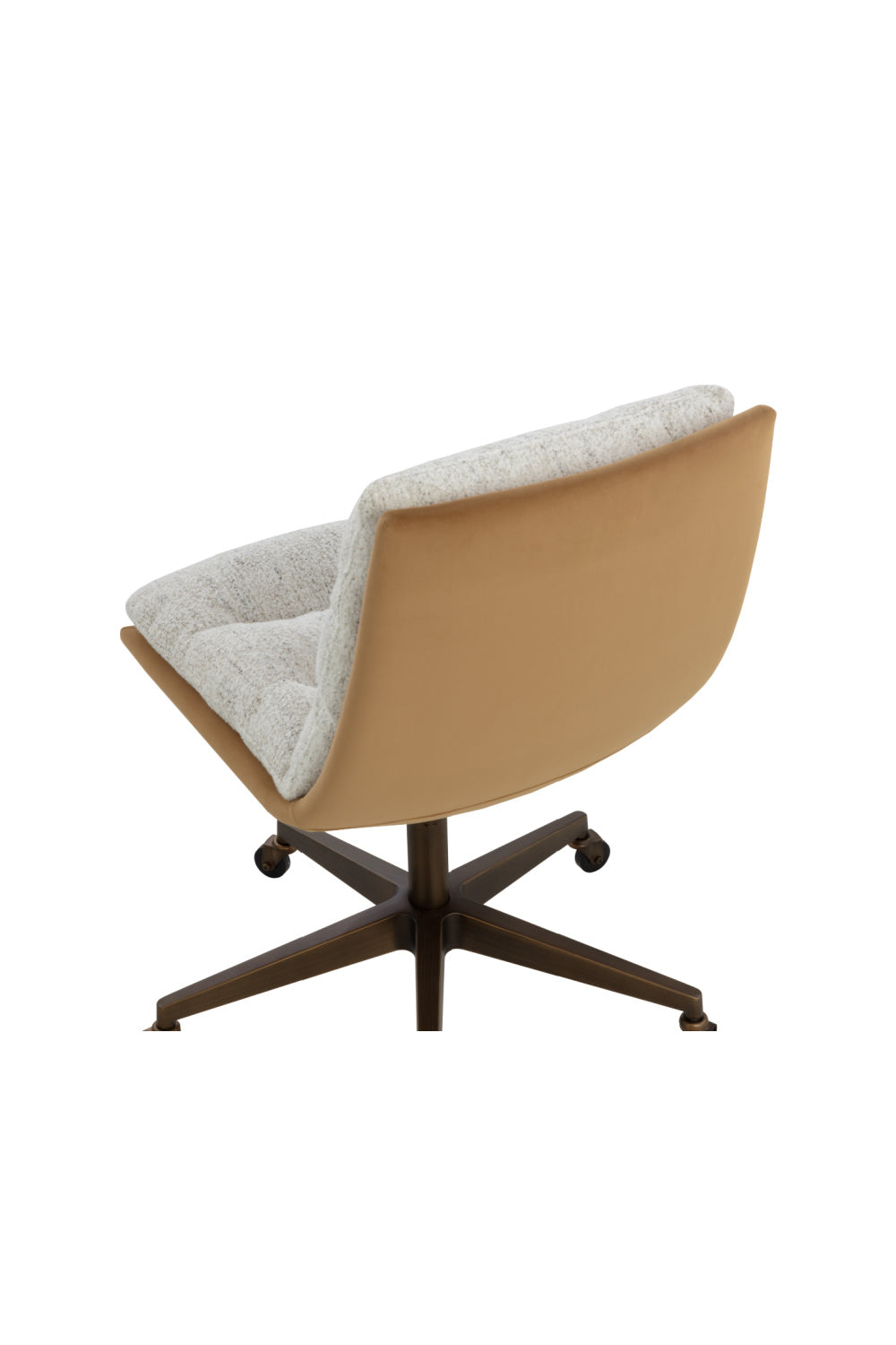 Work in maximum comfort with this mid-century modern office chair that features a generously-padded backrest. Stocked in textured hailey moon fabric or faux leather and velvety kona camel fabric. Completed with an antique brass steel base with added castors for mobility.