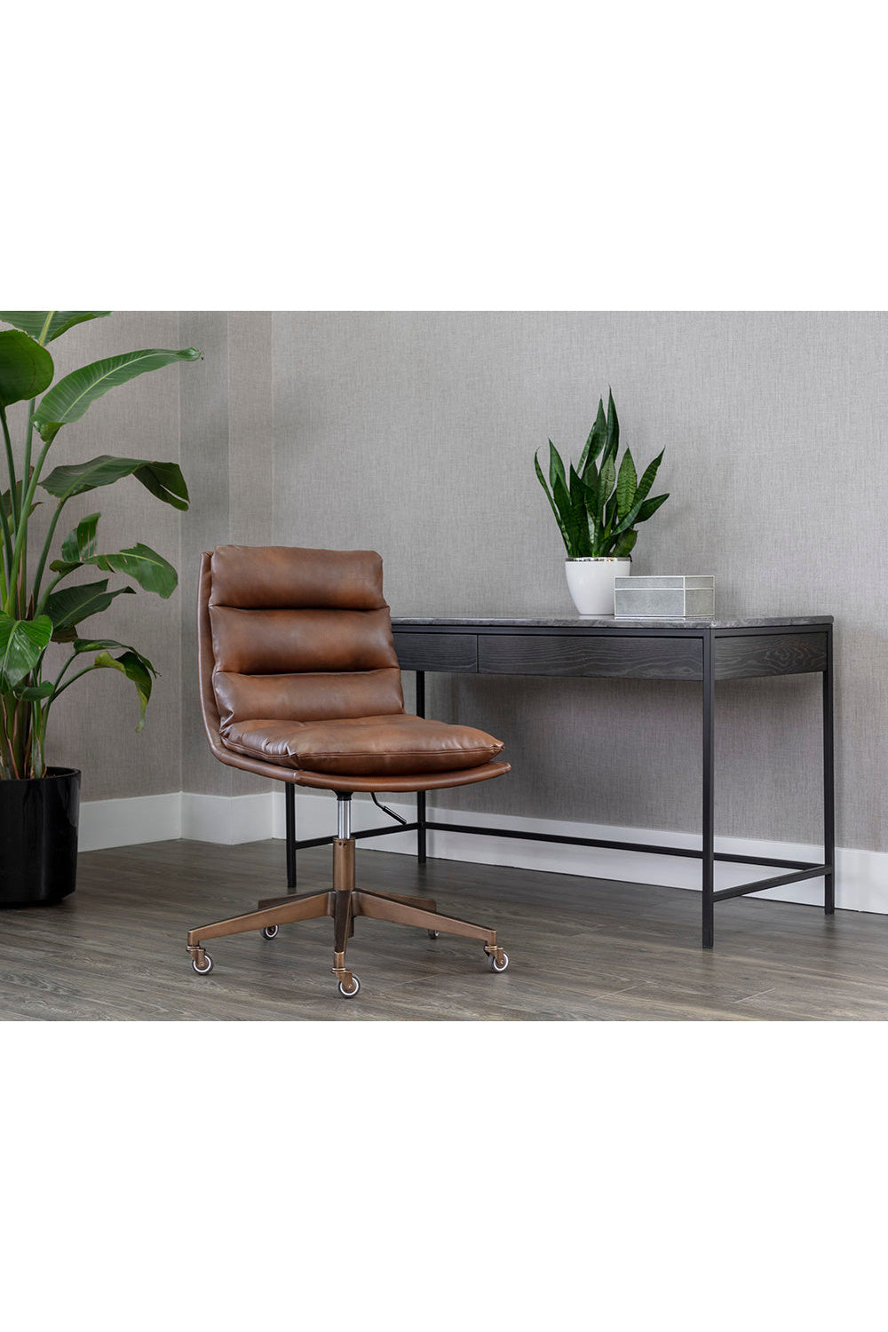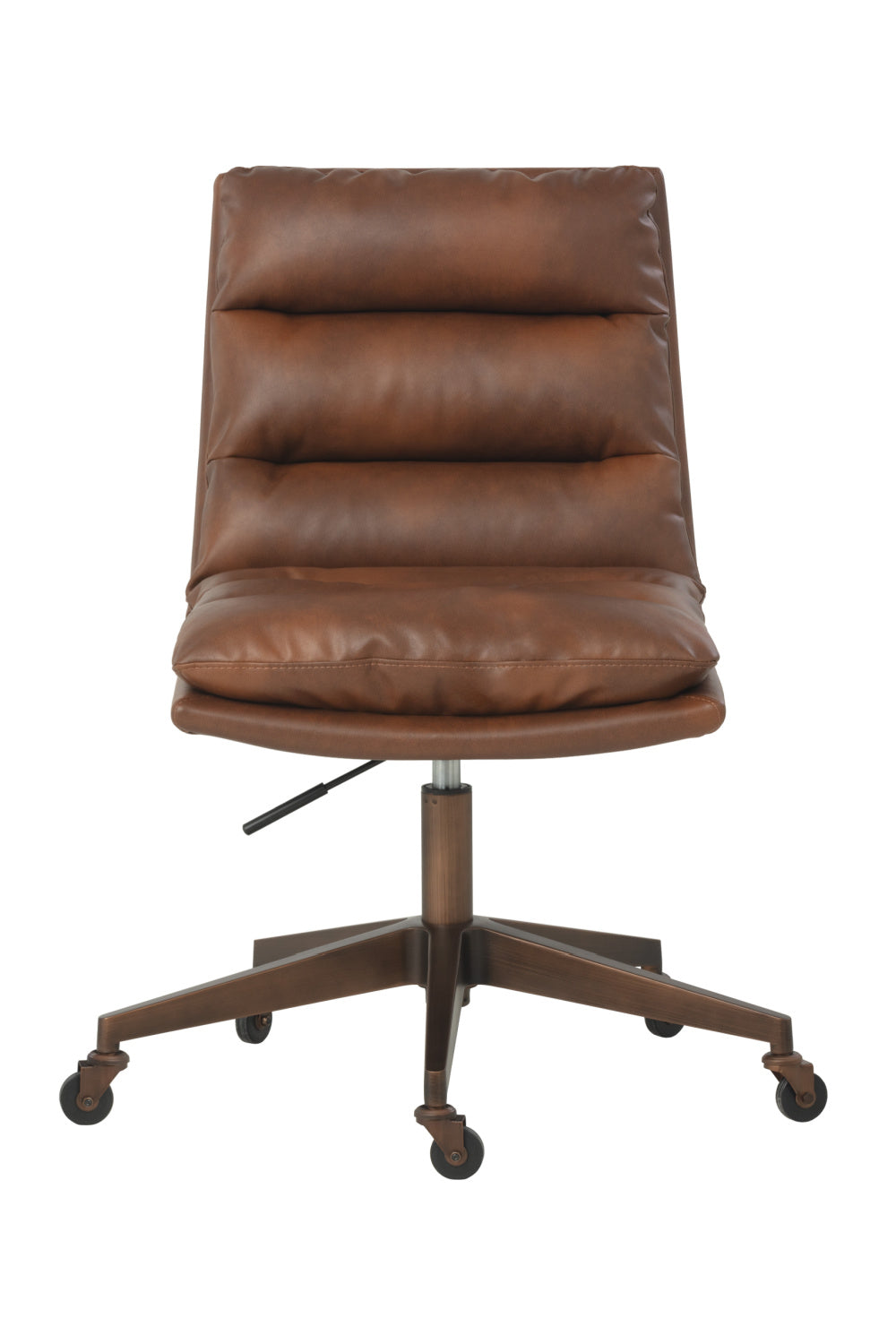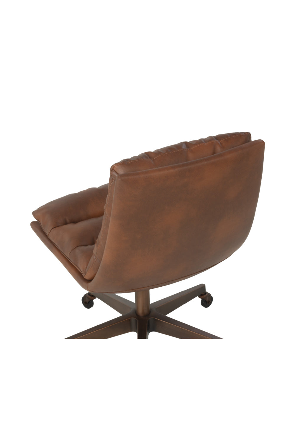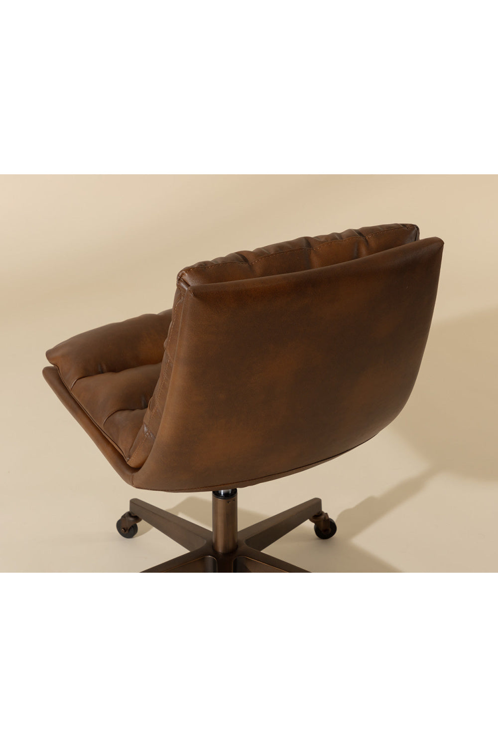 Work in maximum comfort with this mid-century modern office chair that features a generously-padded backrest. Stocked in textured hailey moon fabric or faux leather and velvety kona camel fabric. Completed with an antique brass steel base with added castors for mobility.