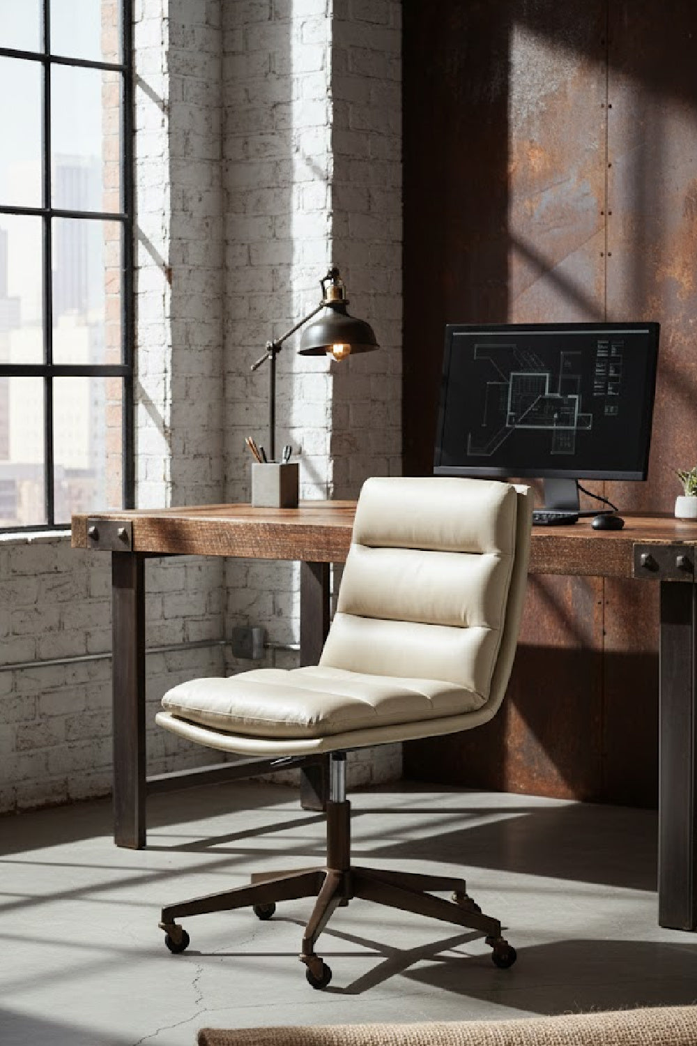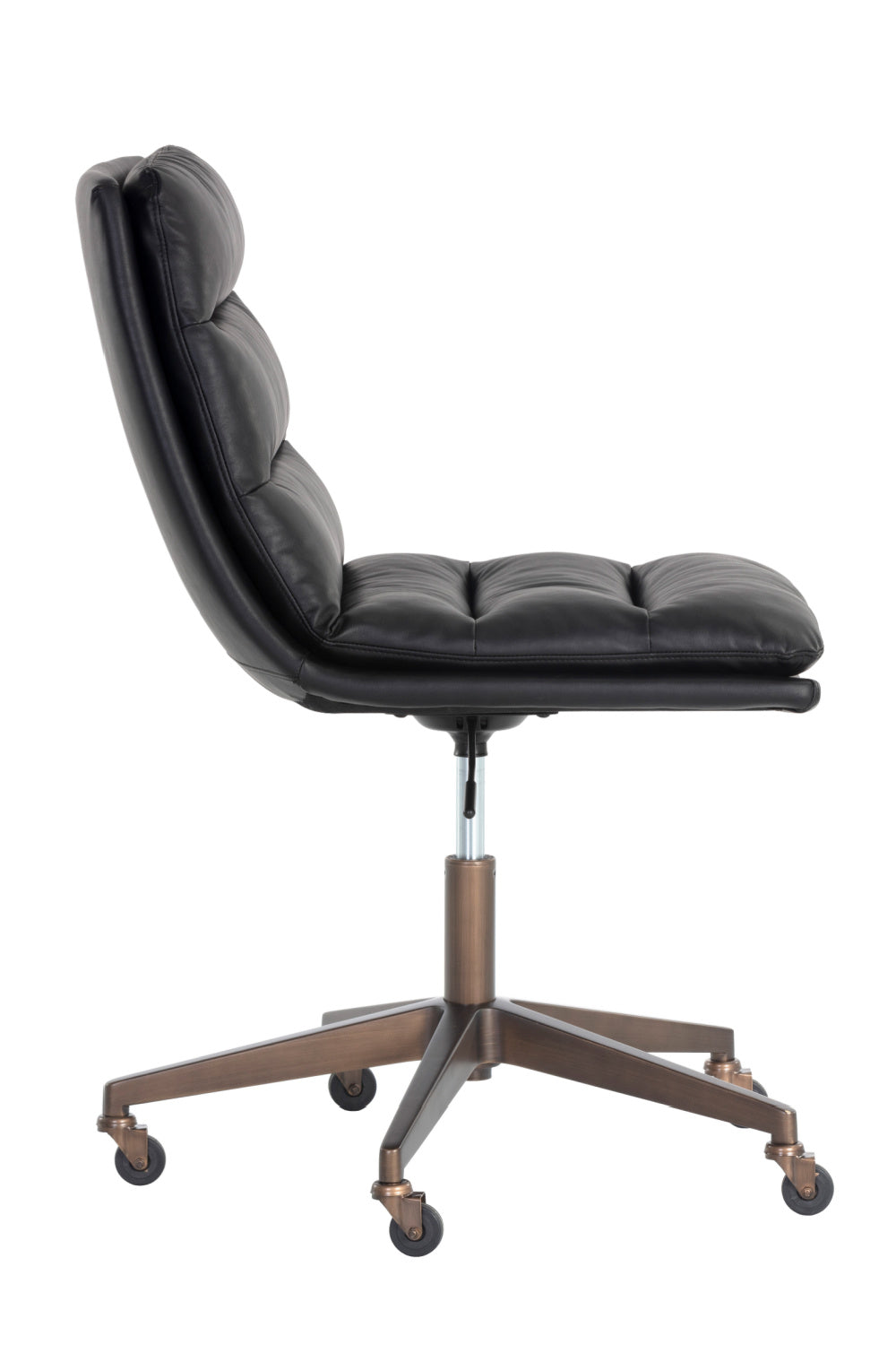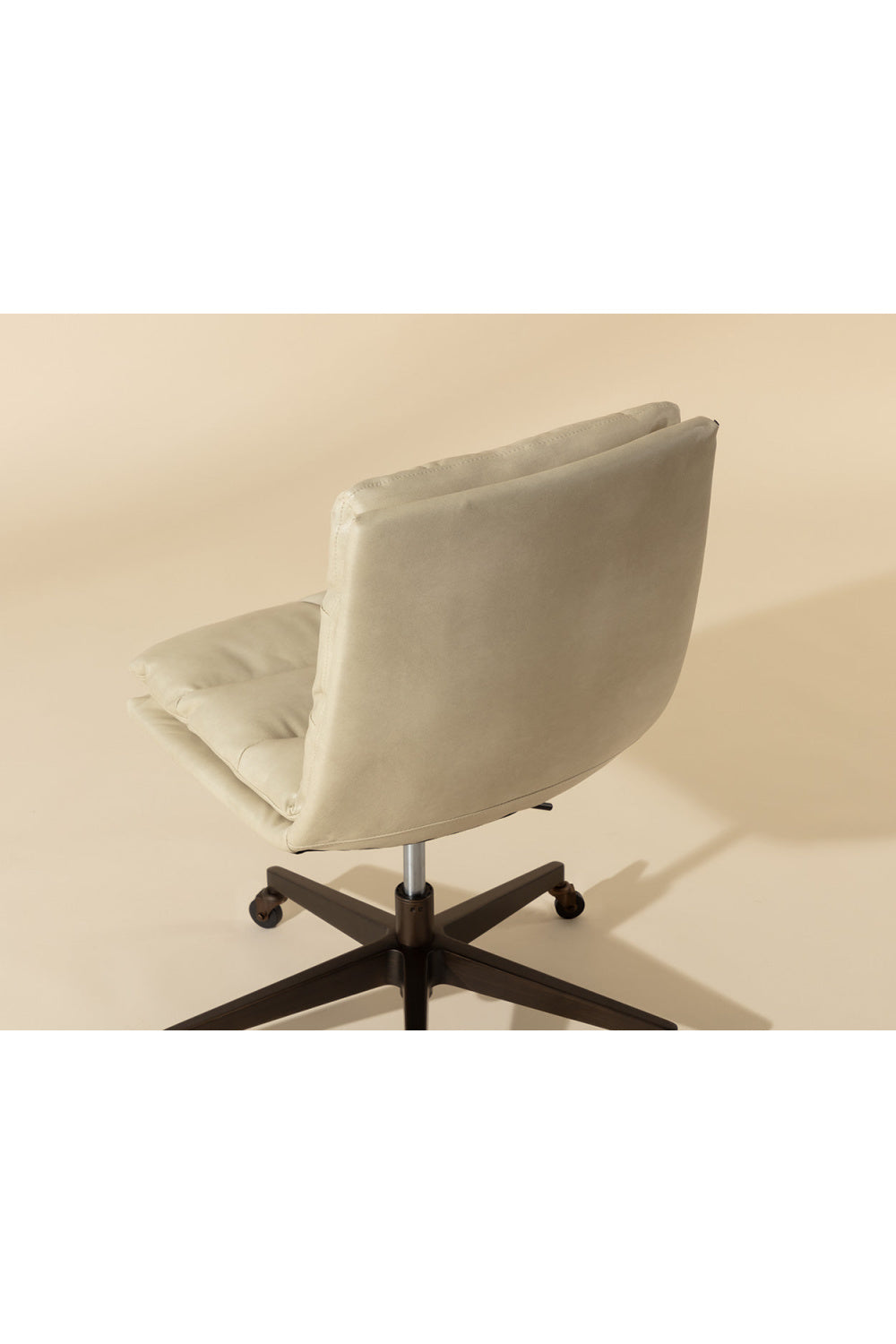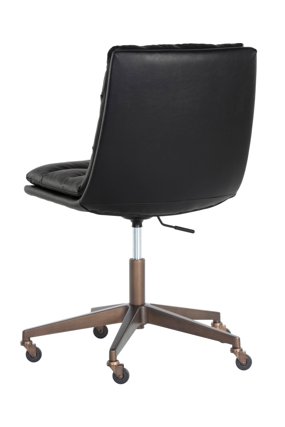 Work in maximum comfort with this mid-century modern office chair that features a generously-padded backrest. Stocked in textured hailey moon fabric or faux leather and velvety kona camel fabric. Completed with an antique brass steel base with added castors for mobility.