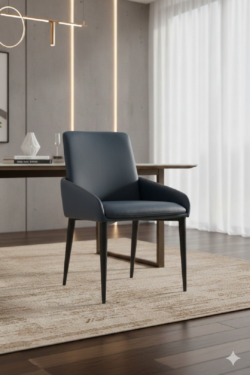 Add a touch of sophistication to dining spaces with this stylish dining armchair that features curved armrests. Upholstered in dillon thunder faux leather and features black powder-coated iron legs. Handle With Care: This design has been crafted with faux leather. Faux leather is manufactured to reflect the natural characteristics of leather; as such, color variations, markings wrinkles, grooves, and light scratches are appreciated characteristics. No two pieces will be alike. Visit our Product Care page for more information on how to ensure the lasting beauty of this piece